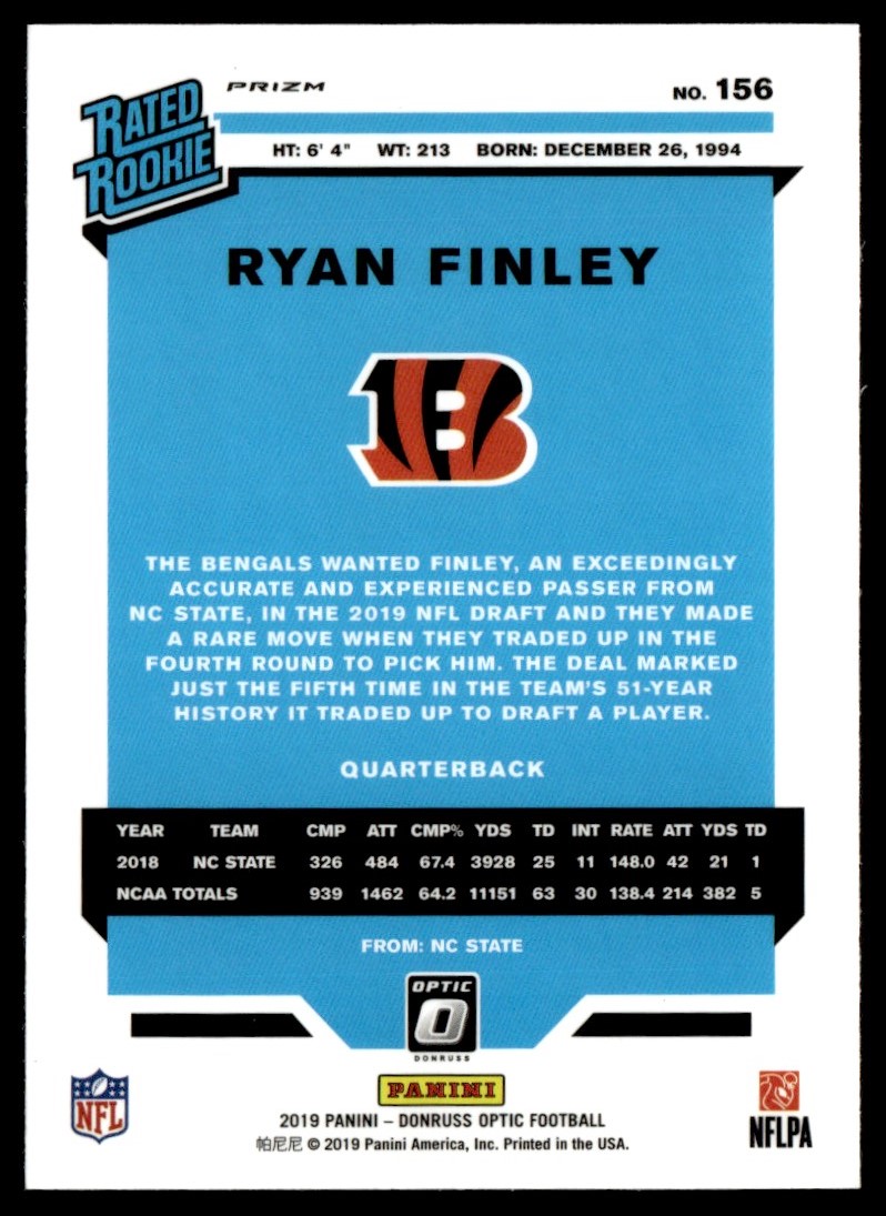 2019 Donruss Optic Orange Ryan Finley Rookie Cincinnati Bengals #156