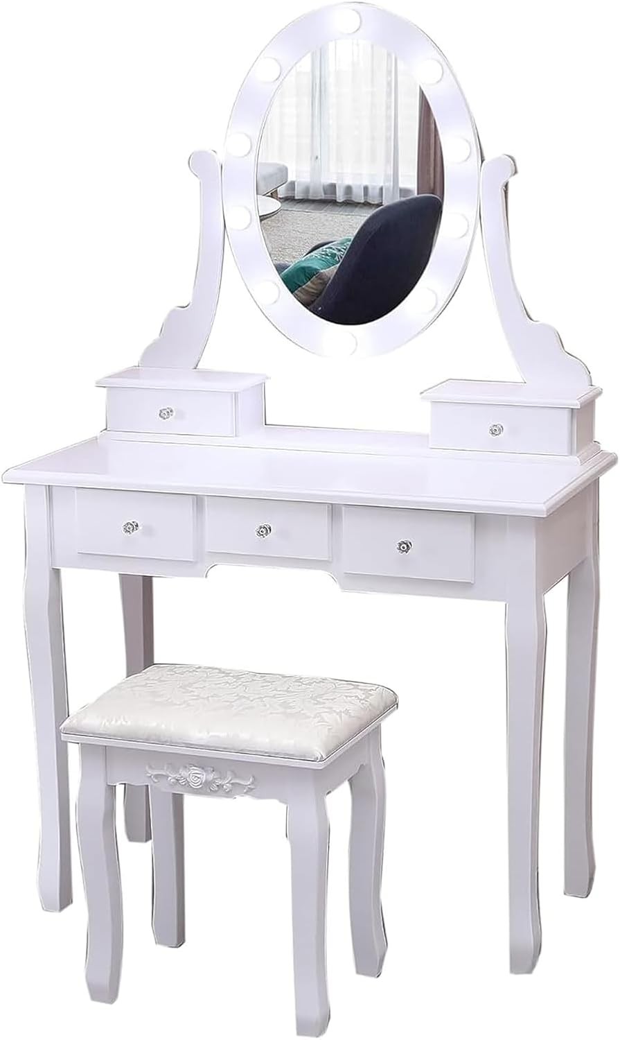 The makeup desk and bench feature legs made of superior pine wood, while the solid vanity mirror with lights, desk, and chair are made of premium MDF, ensuring a stable and durable structure. The stool is adorned with exquisite rose carvings, showcasing beautiful and high-quality craftsmanship.