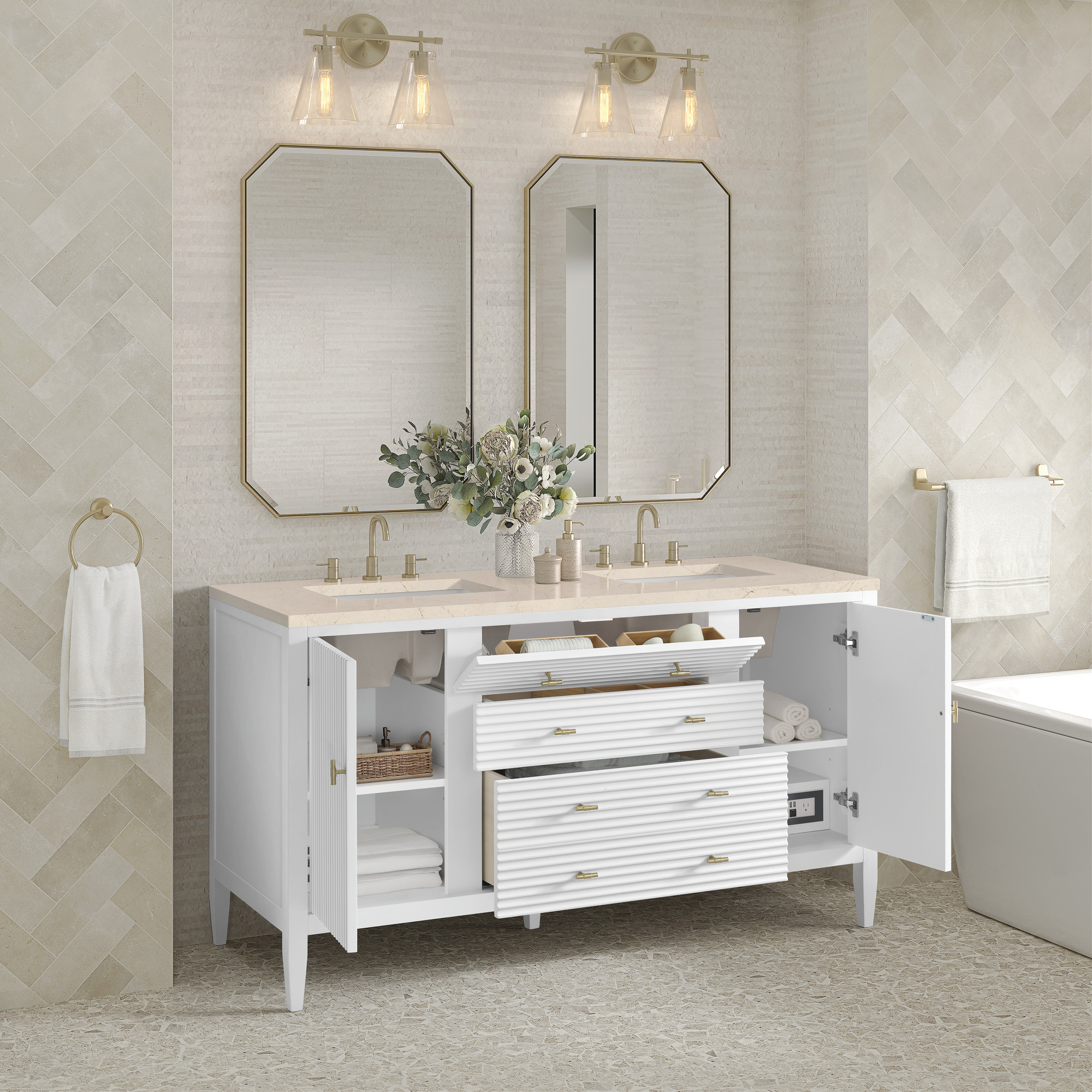 Item DescriptionIncludes Eternal Marfil quartz vanity top and rectangular sinks (may not be pictured on main image)