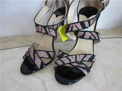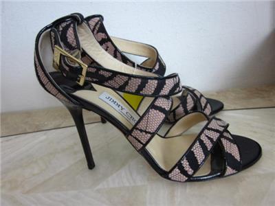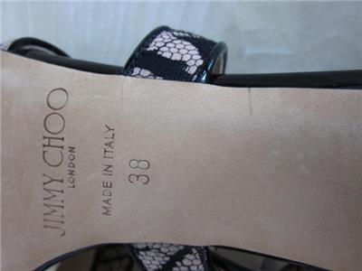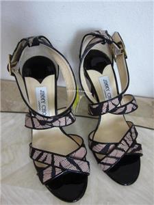 Jimmy Choo Lottie patent leather and raffia sandals in black and white.