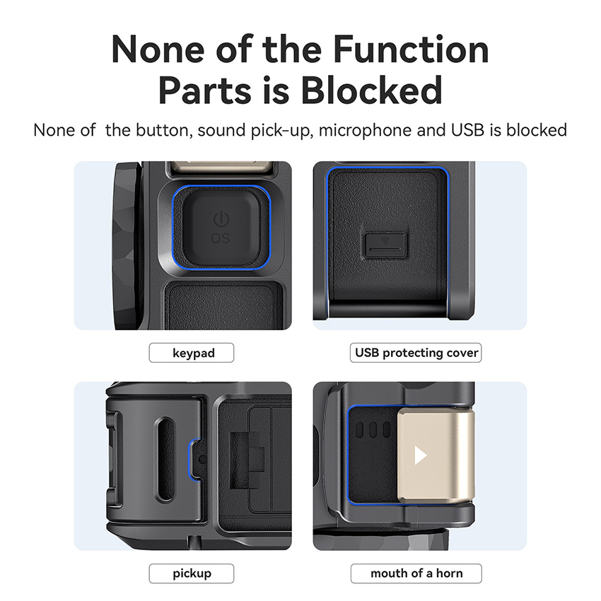 l The metal frame case is seamlessly compatible with the DJI original quick release mount, audio and charging adapter and other accessories through the openings reserved at the area of USB cover and the bottom of the case