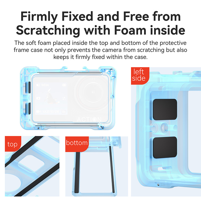 l The soft foam placed inside the top and bottom of the protective frame case not only prevents the camera from scratching but also keeps it firmly fixed within the case