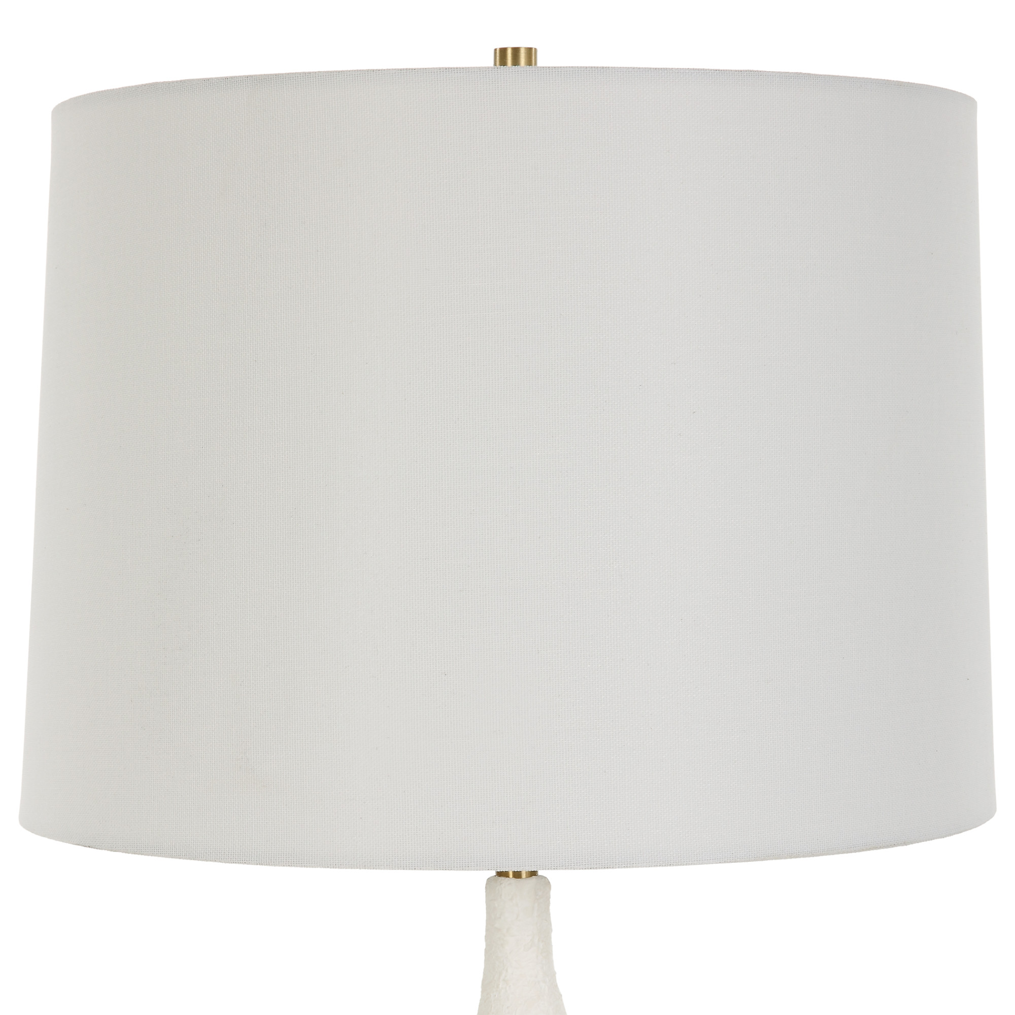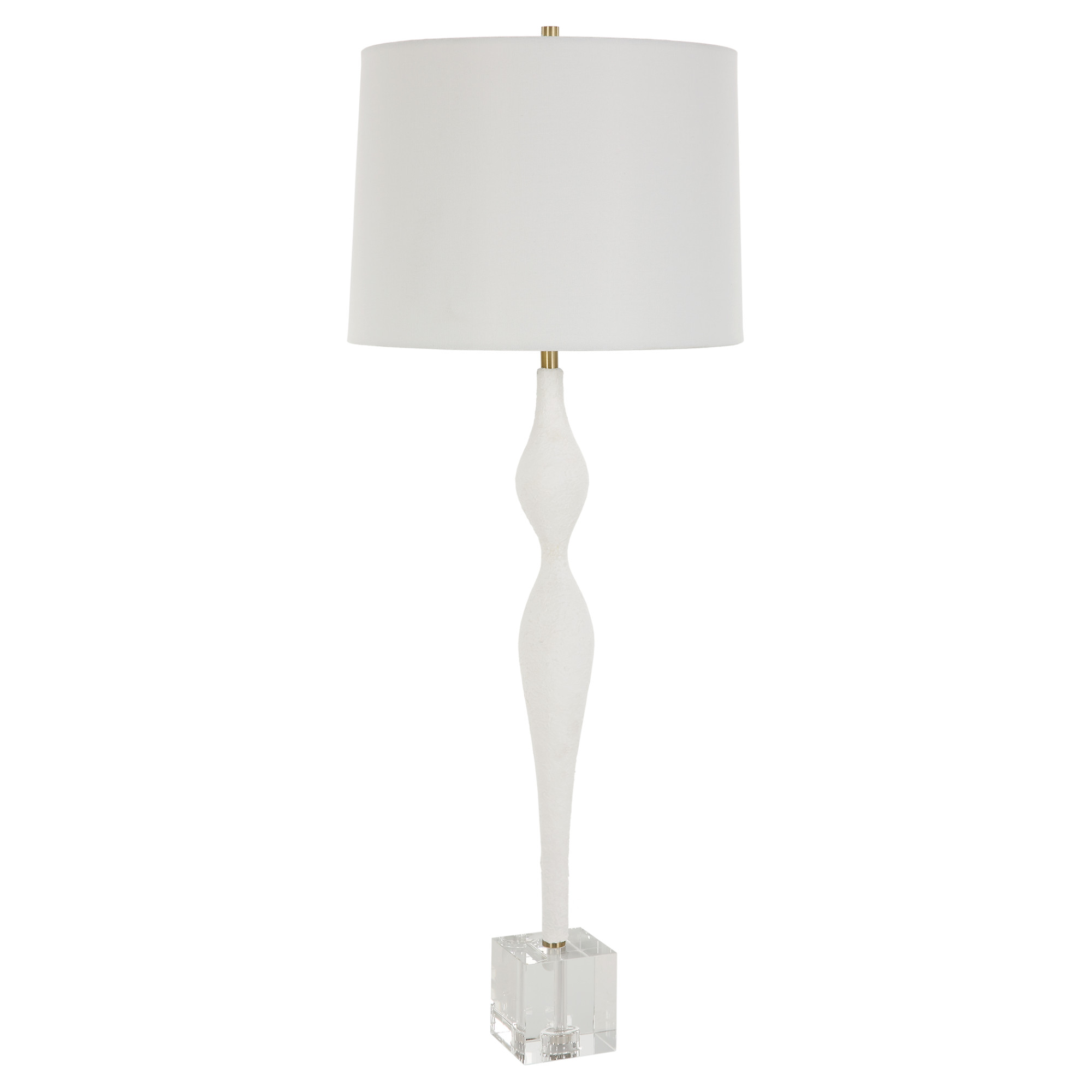 Item DescriptionThe Helena table lamp showcases a slender chalk white ceramic base with feminine curvature and a plaster like texture. A thick square crystal foot adds to the sophistication of this design along with antique brass plated accents. The hardback shade has a slight taper and is covered in a white linen fabric.