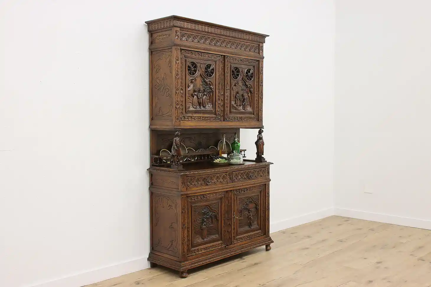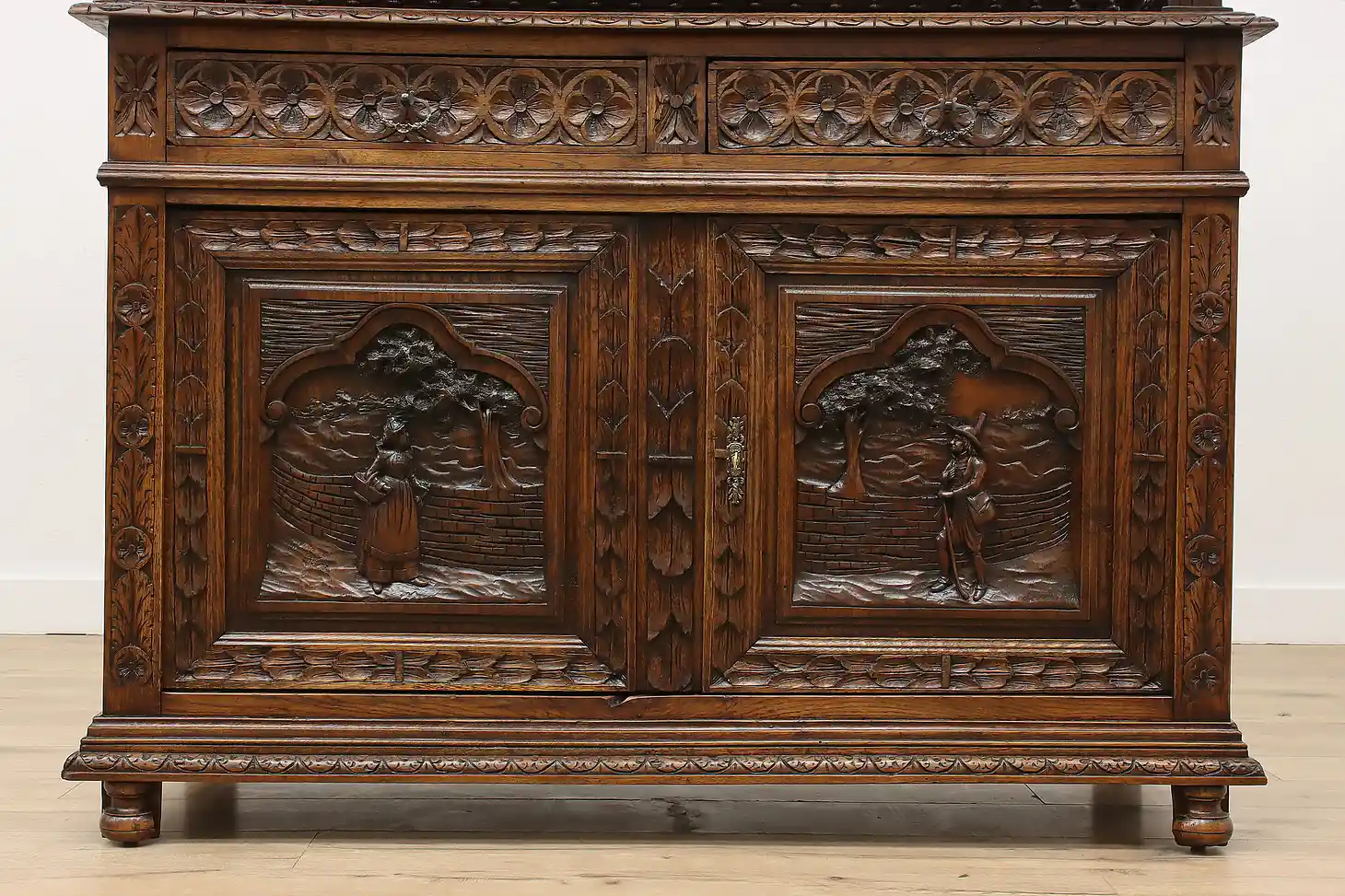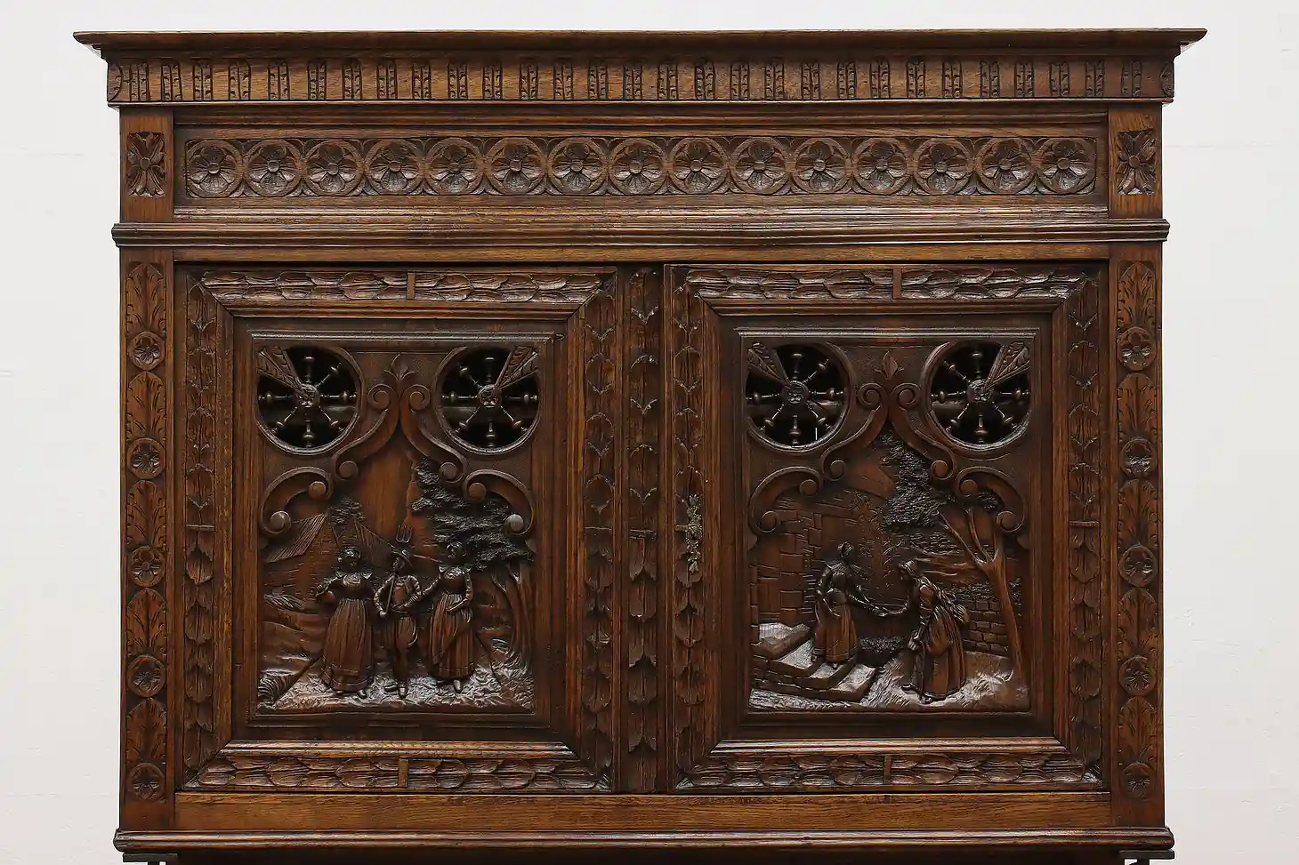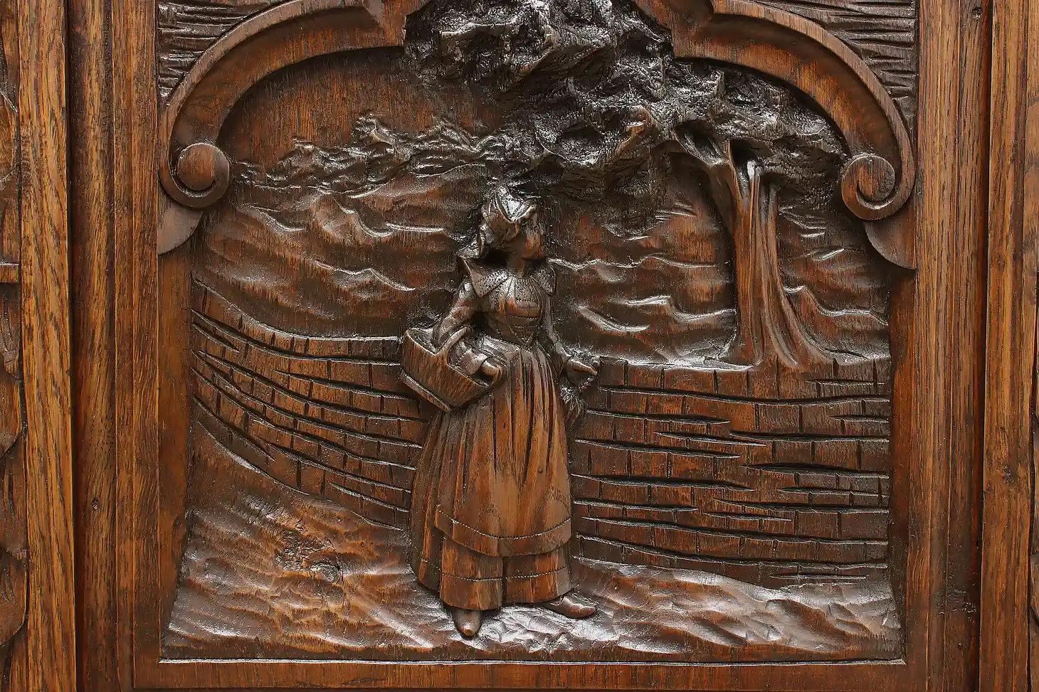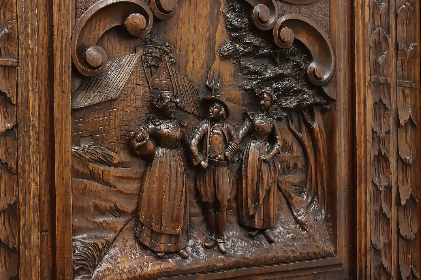 The northwest region of France is home to the Brittany province, famous for its highly-skilled artisans. This sideboard, cupboard or bar shows of the masterful skills of its crafters, displaying scenes of traditional village life.