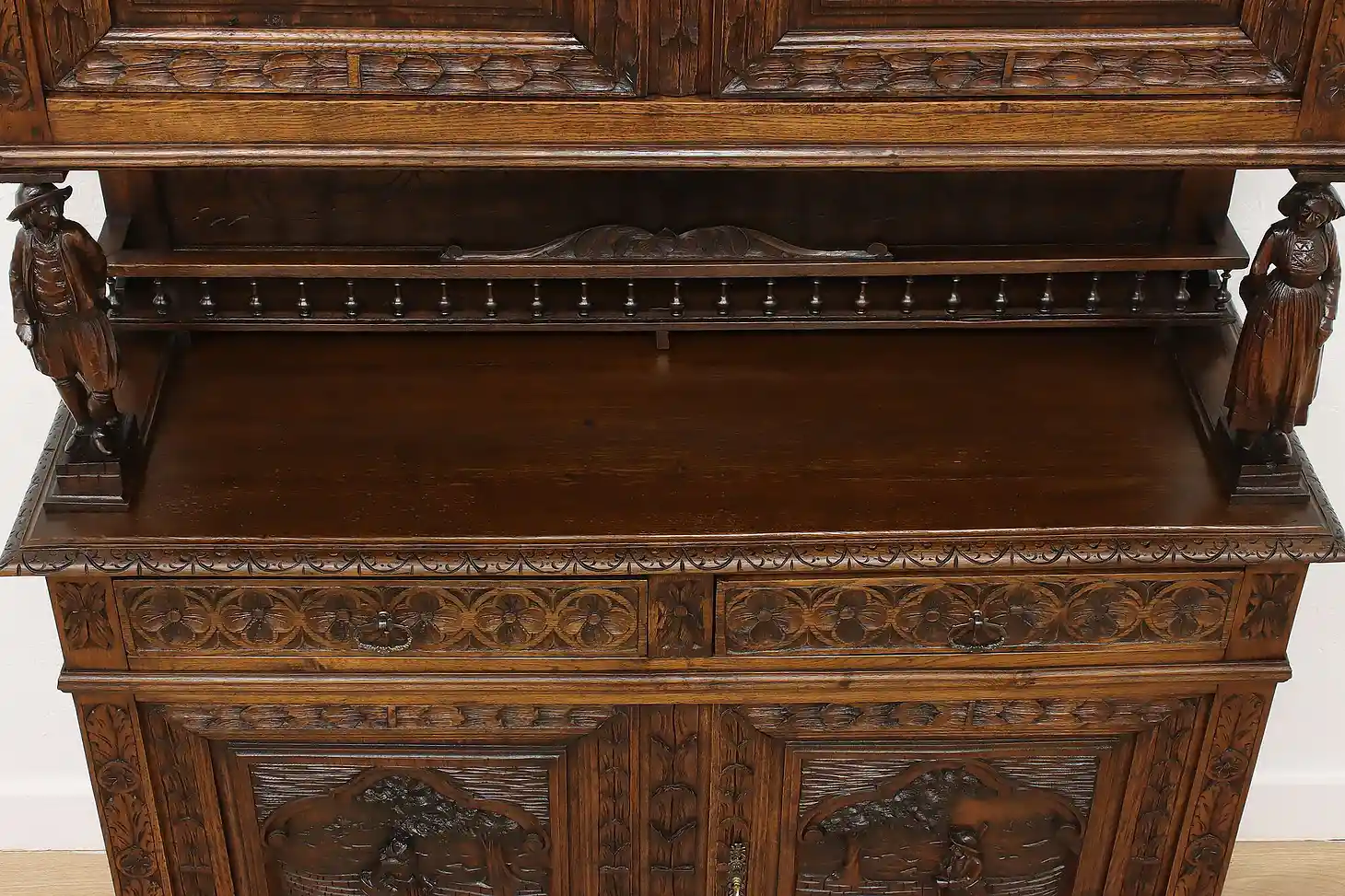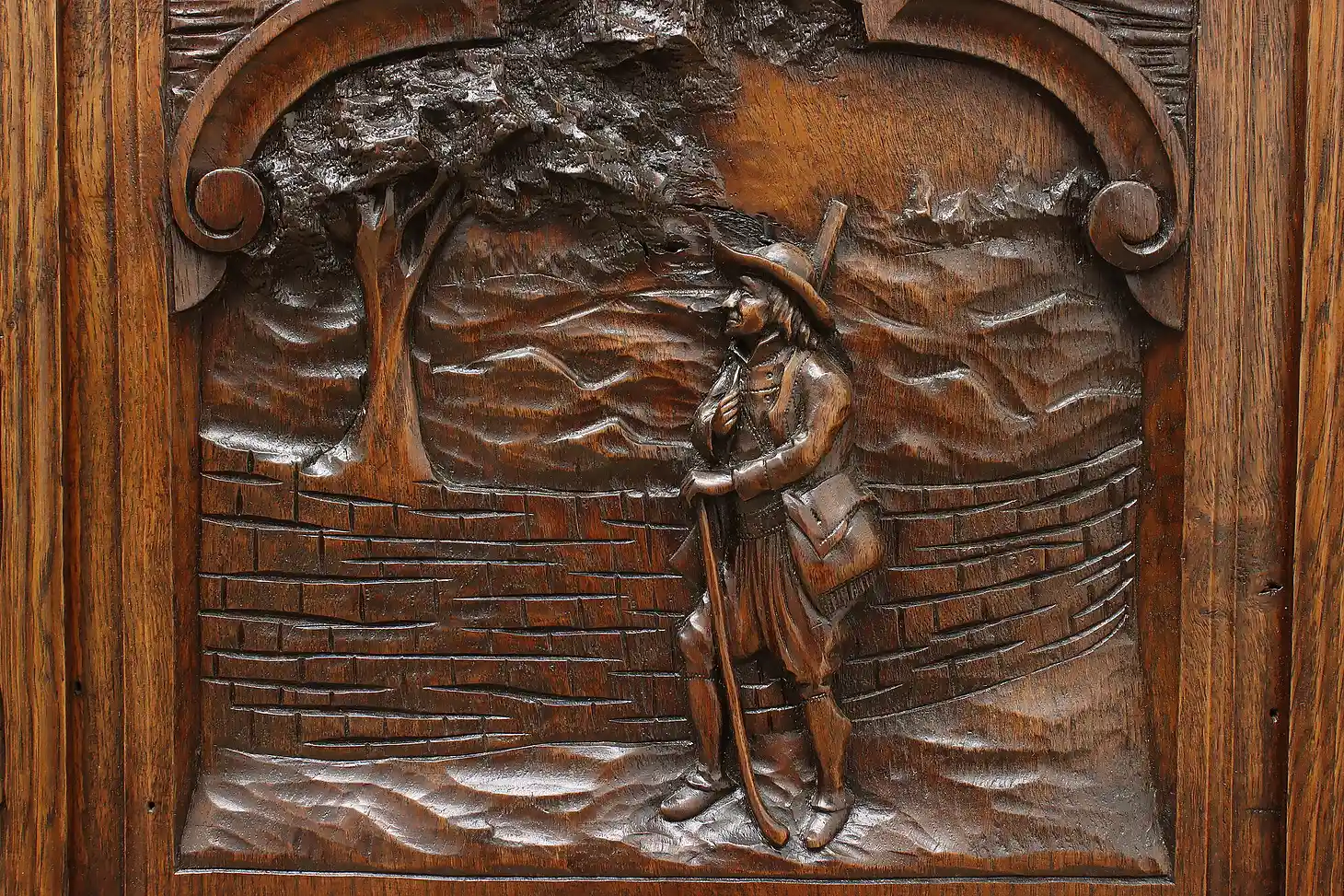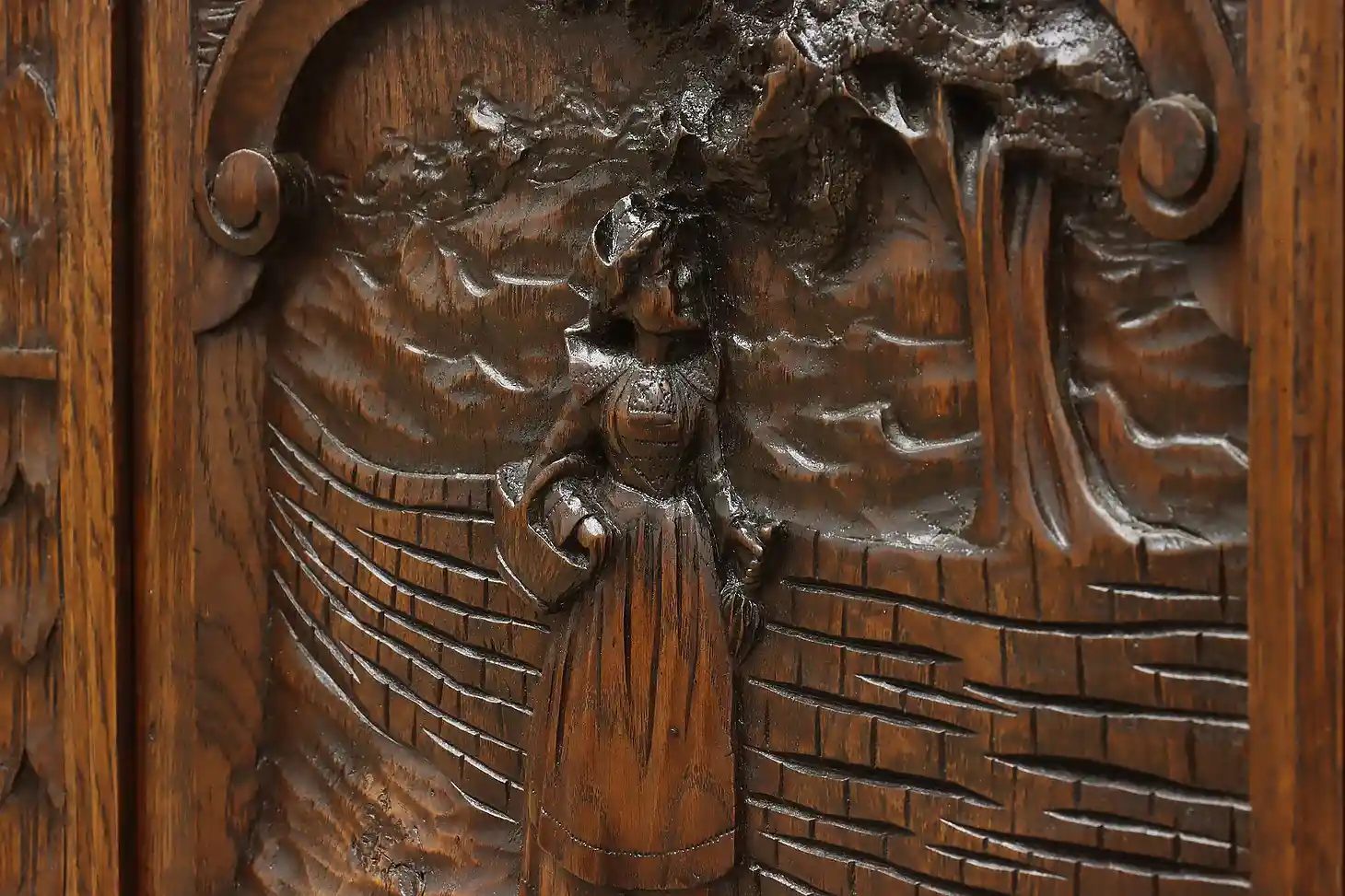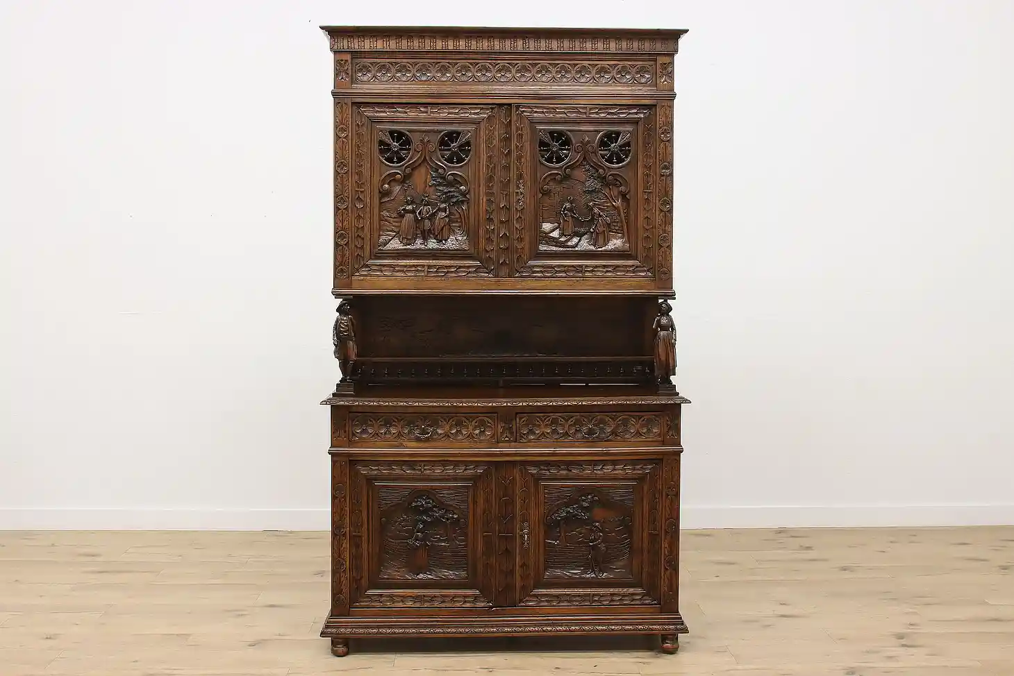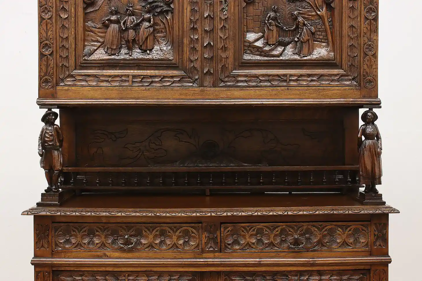 The northwest region of France is home to the Brittany province, famous for its highly-skilled artisans. This sideboard, cupboard or bar shows of the masterful skills of its crafters, displaying scenes of traditional village life.