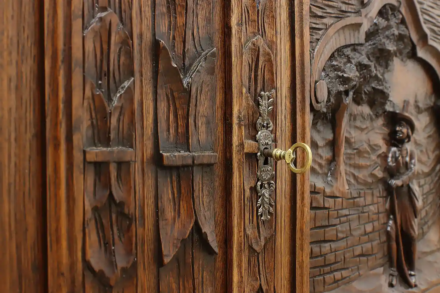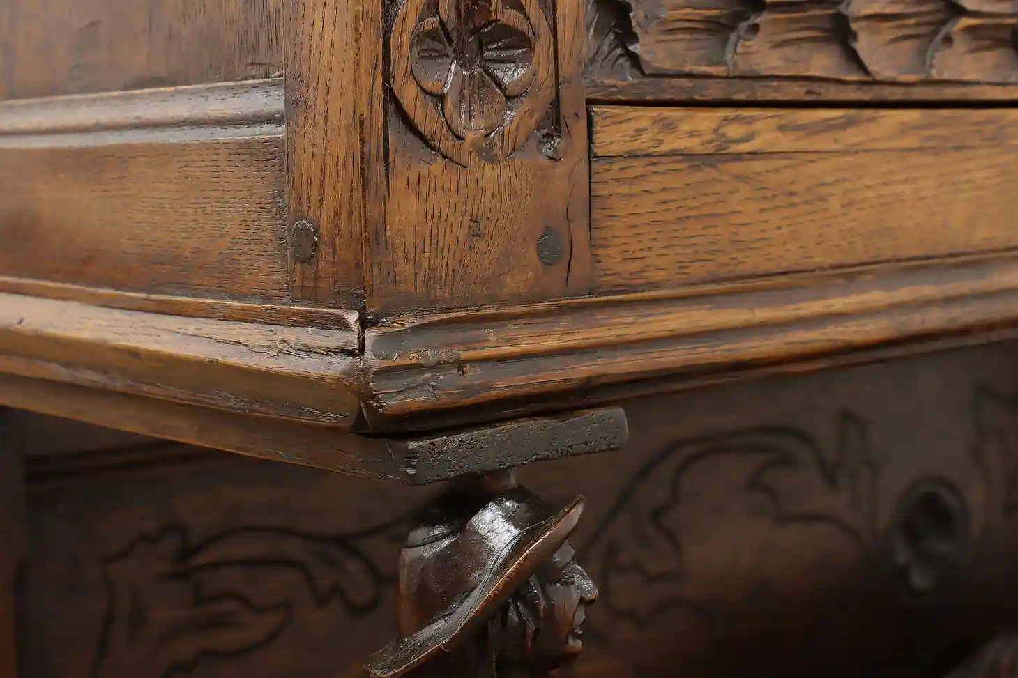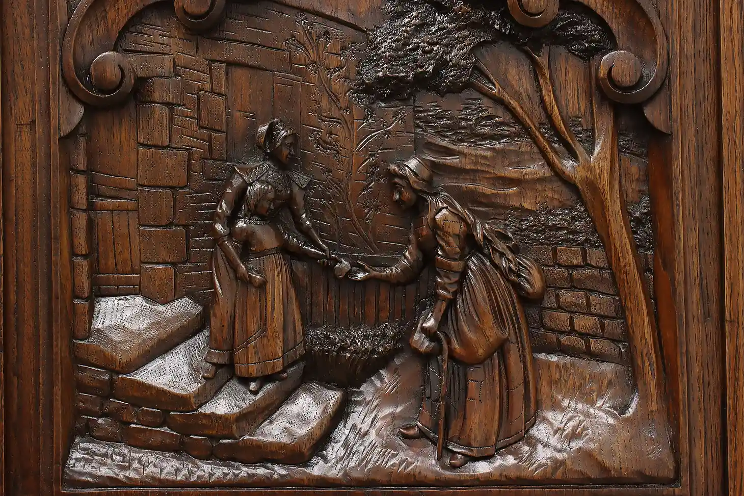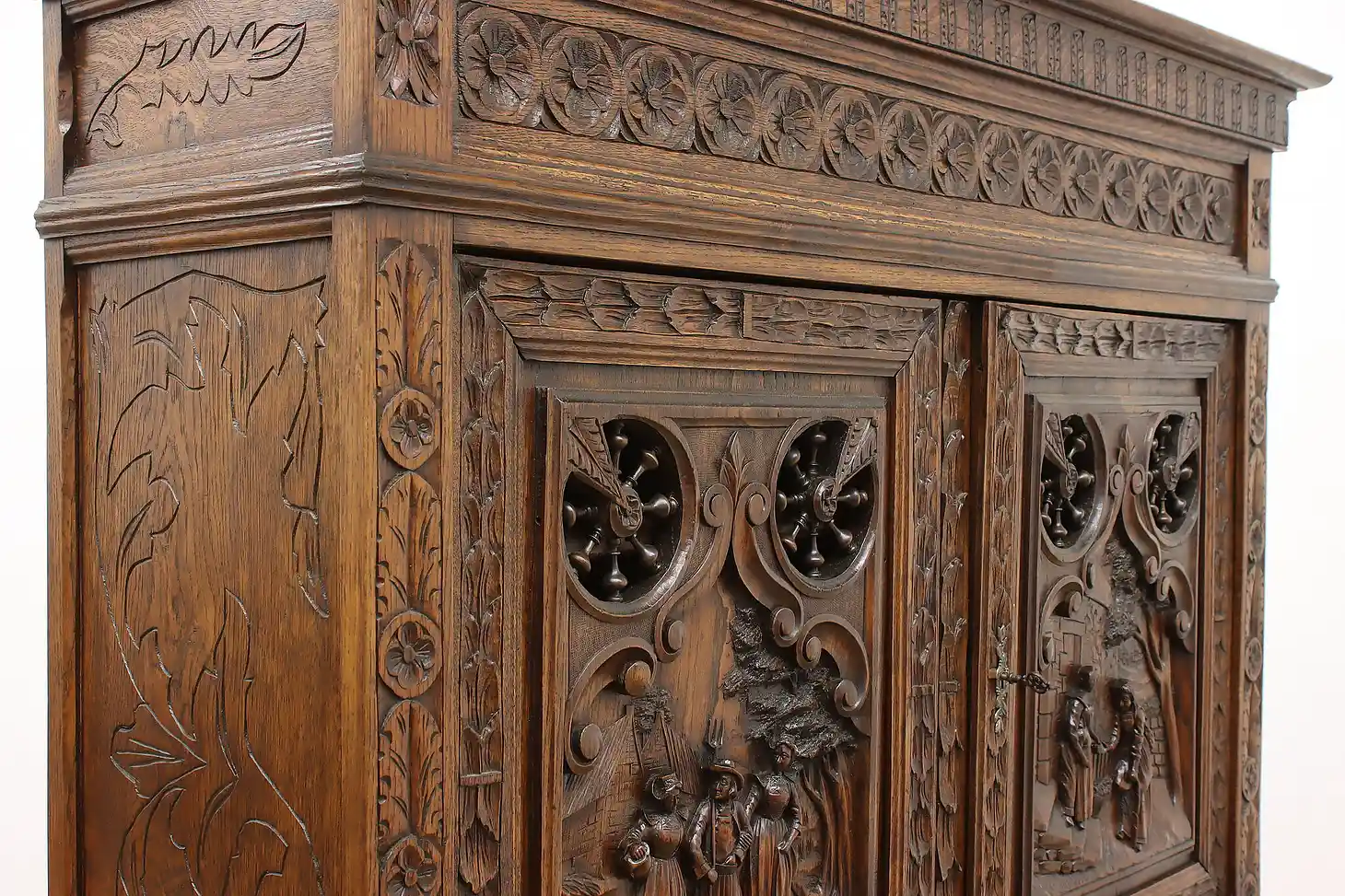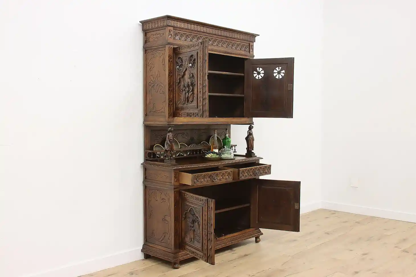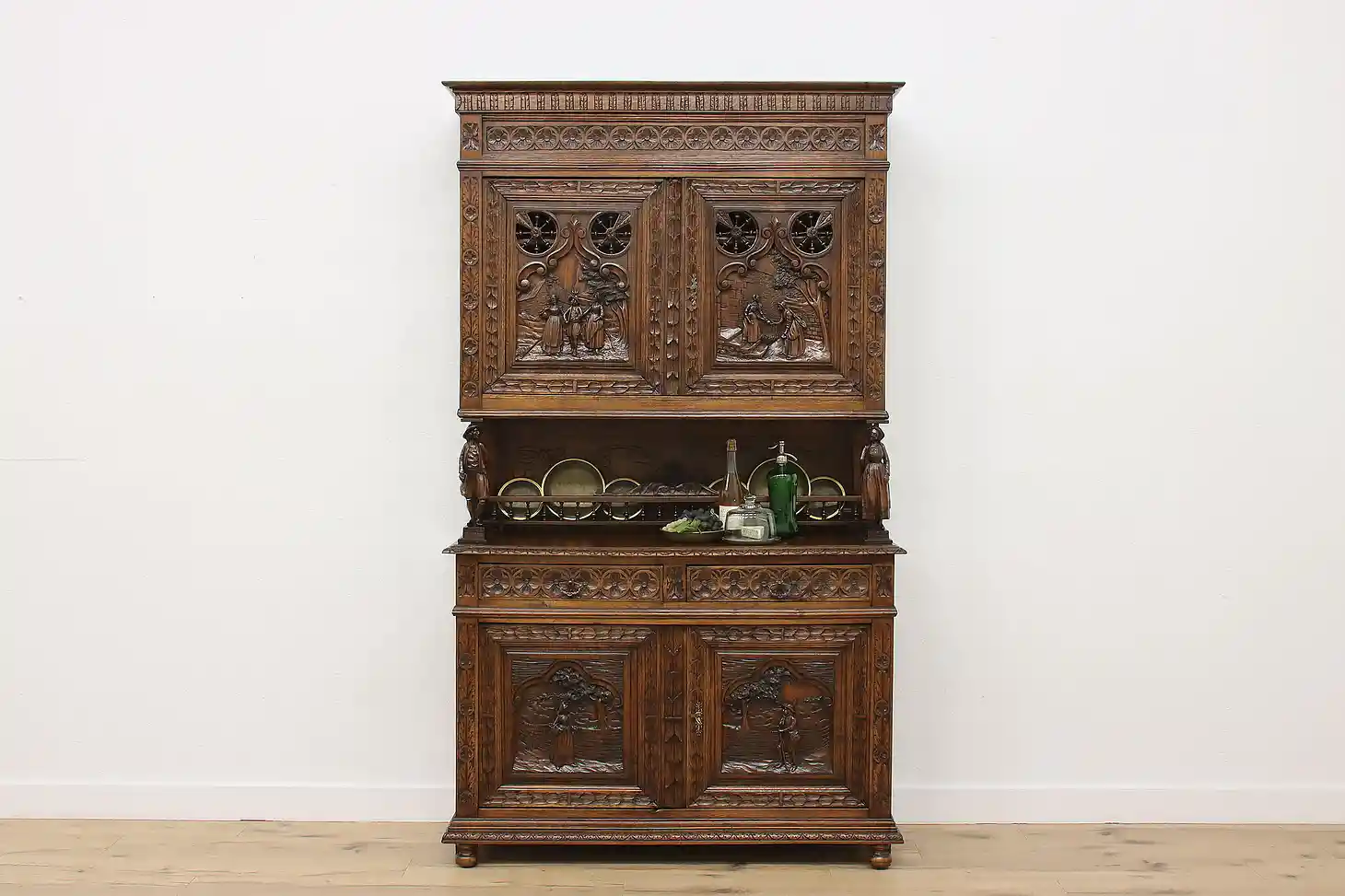 The northwest region of France is home to the Brittany province, famous for its highly-skilled artisans. This sideboard, cupboard or bar shows of the masterful skills of its crafters, displaying scenes of traditional village life.
