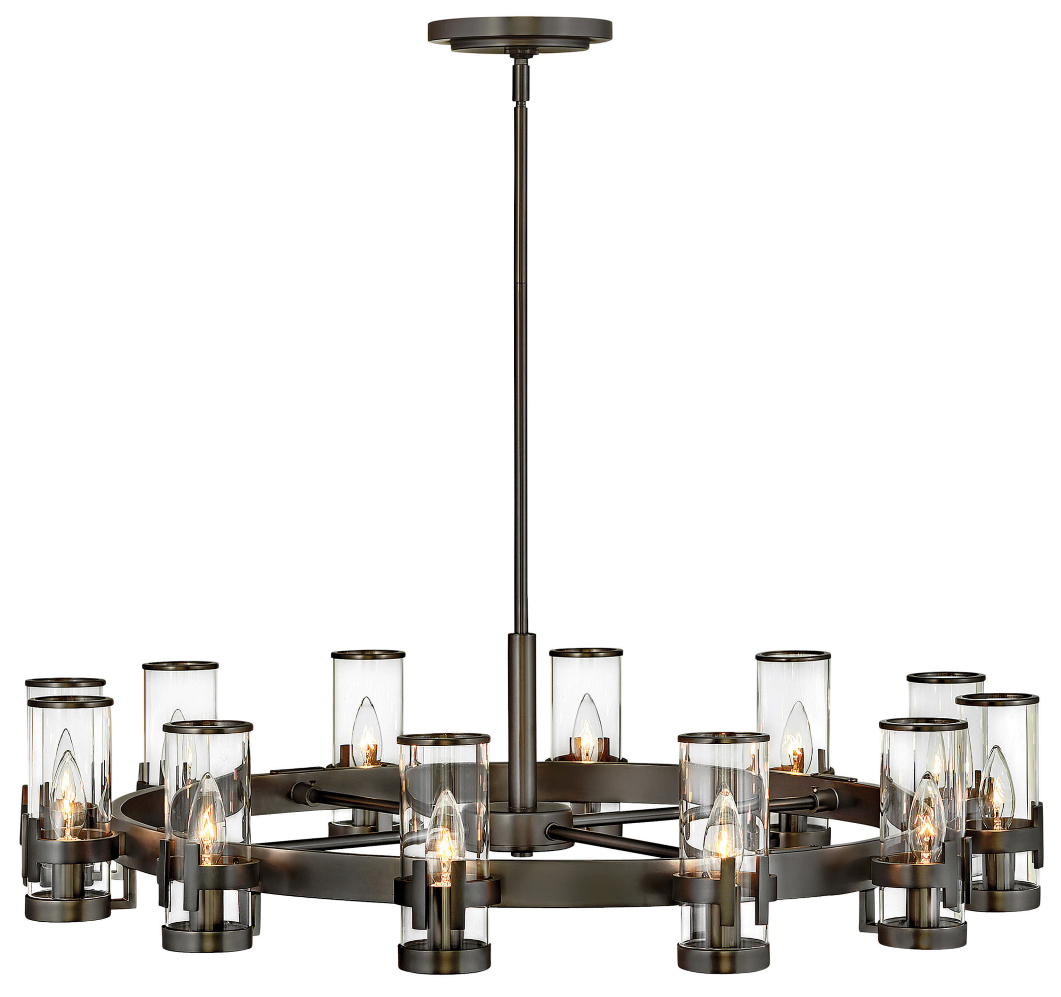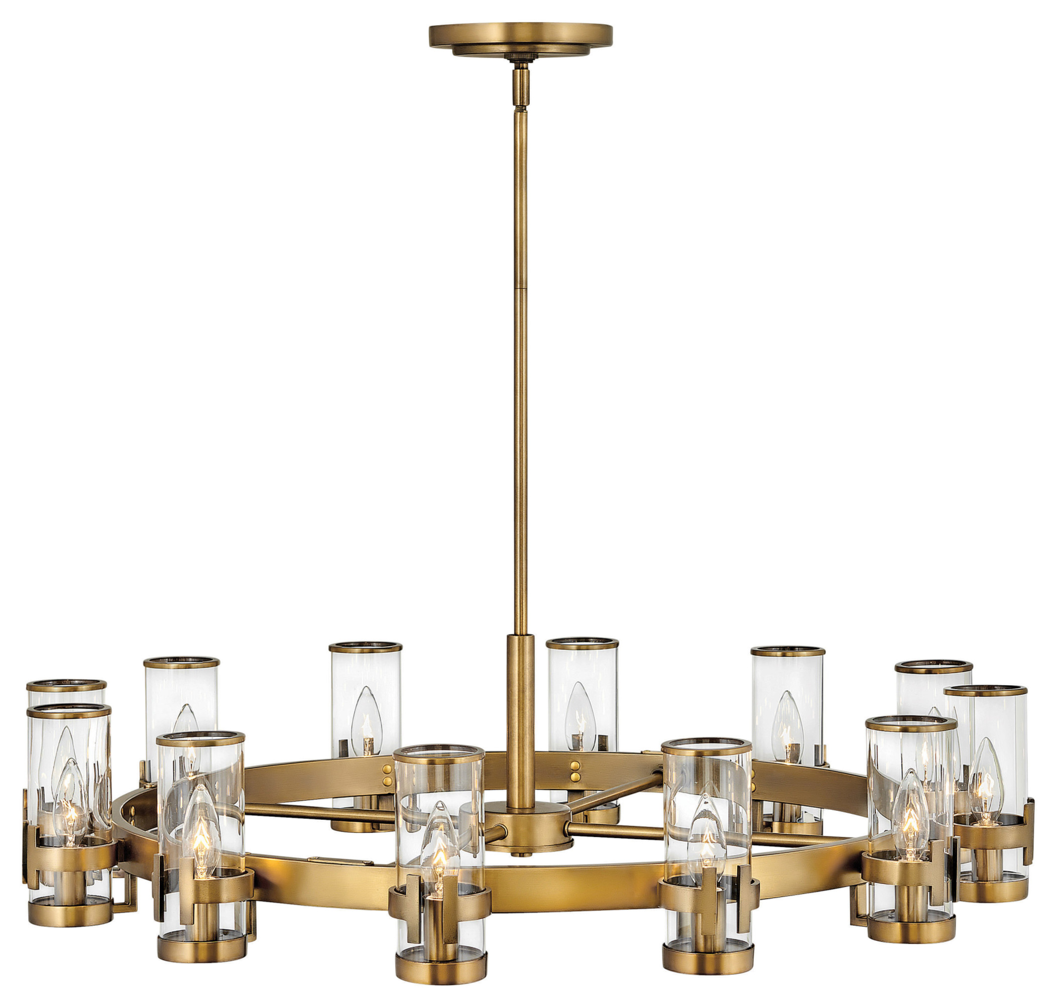 Item DescriptionThe Reeve chandelier balances sophistication with simplicity. The low-profile traditional silhouette is elevated by a wealth of elegant clear glass cylinders. Each glass is secured with a cast double-T bracelet matching the frame's luxurious finish, and finished with a corresponding metal band at the top.