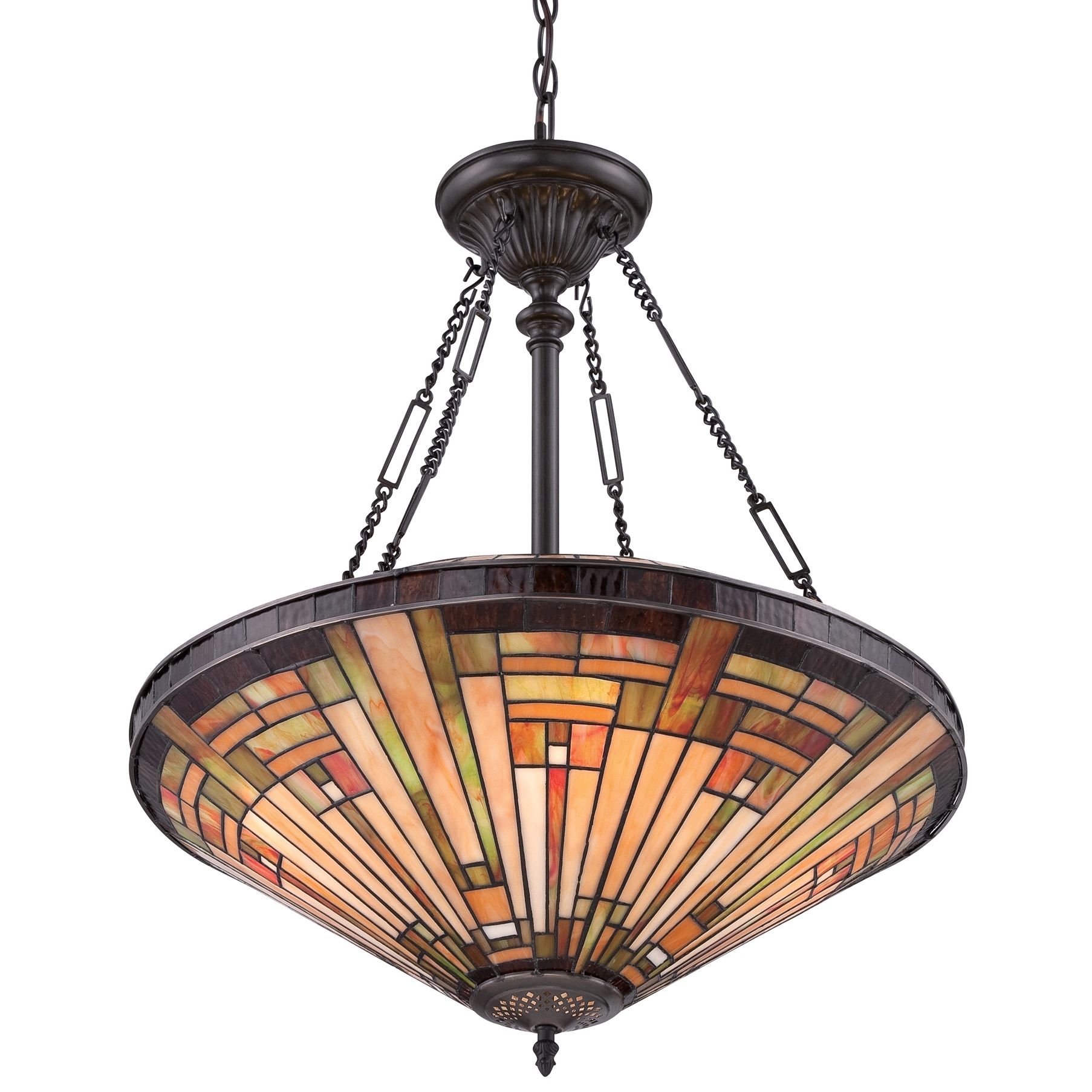 Item DescriptionThis handcrafted Tiffany style collection illuminates your home with warm shades of amber, bisque and earthy green, arranged in a clean and simple geometric pattern reminiscent of the works of Frank Lloyd Wright. The sturdy base complements the Arts & Crafts style, and is finished in a vintage bronze patina.