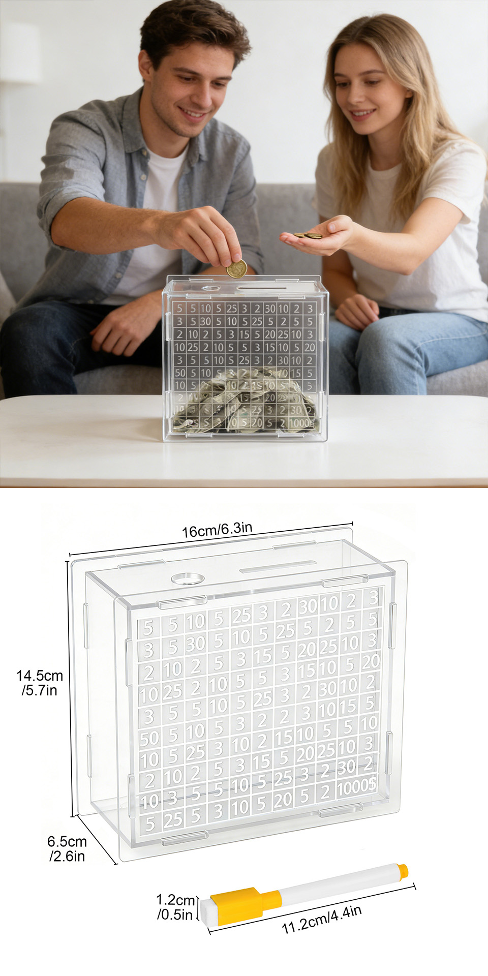 This clear acrylic money-saving challenge box makes saving money fun and meaningful for kids, couples, and families. The numbered tracking grid turns every coin or bill into visible progress, while the transparent design builds excitement as savings grow. DIY assembly and an erasable marker allow repeated use for shared goals and habits.