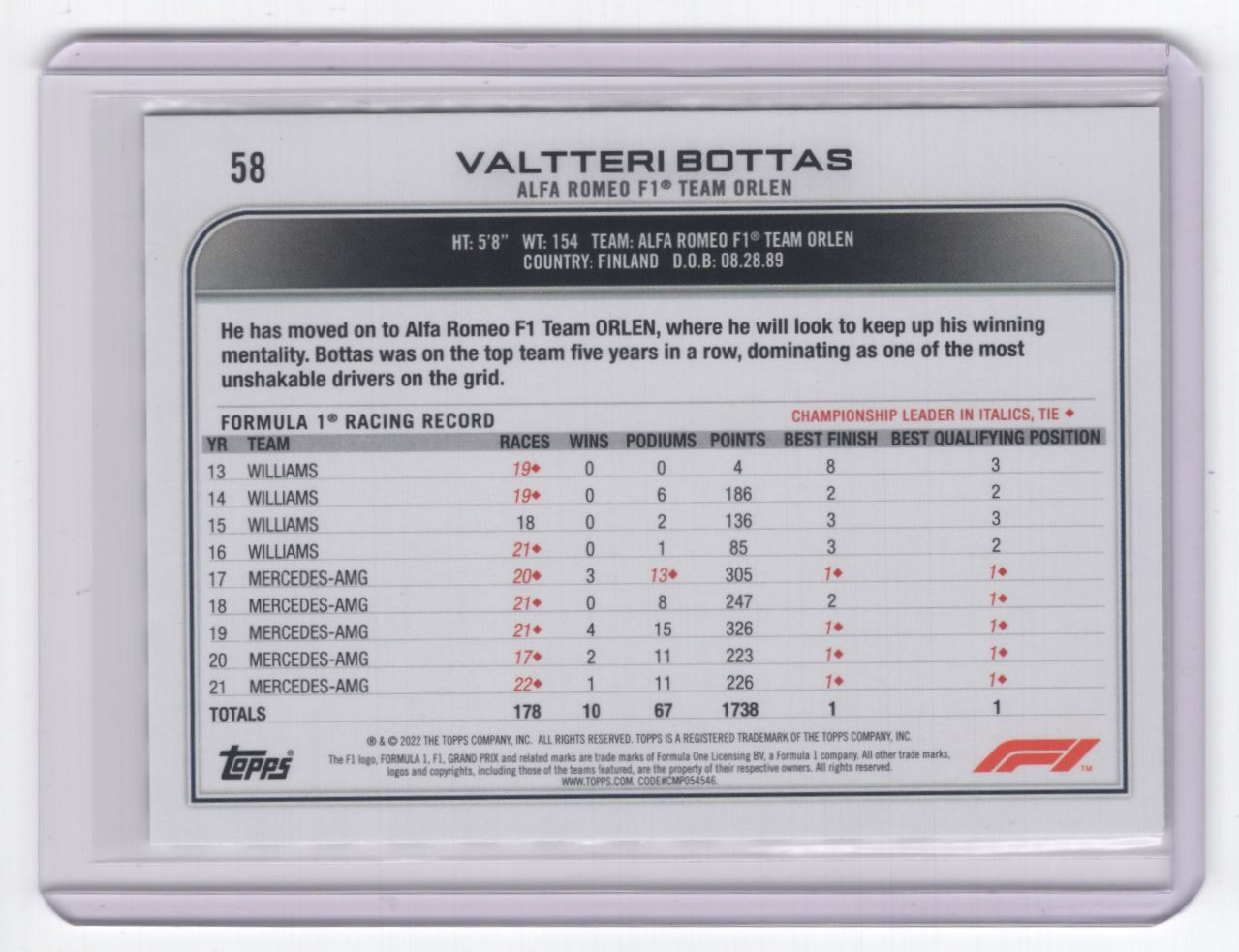 2022 Topps Formula 1 Checker Flag Valtteri Bottas Alfa Romeo Racing Orlen #58
