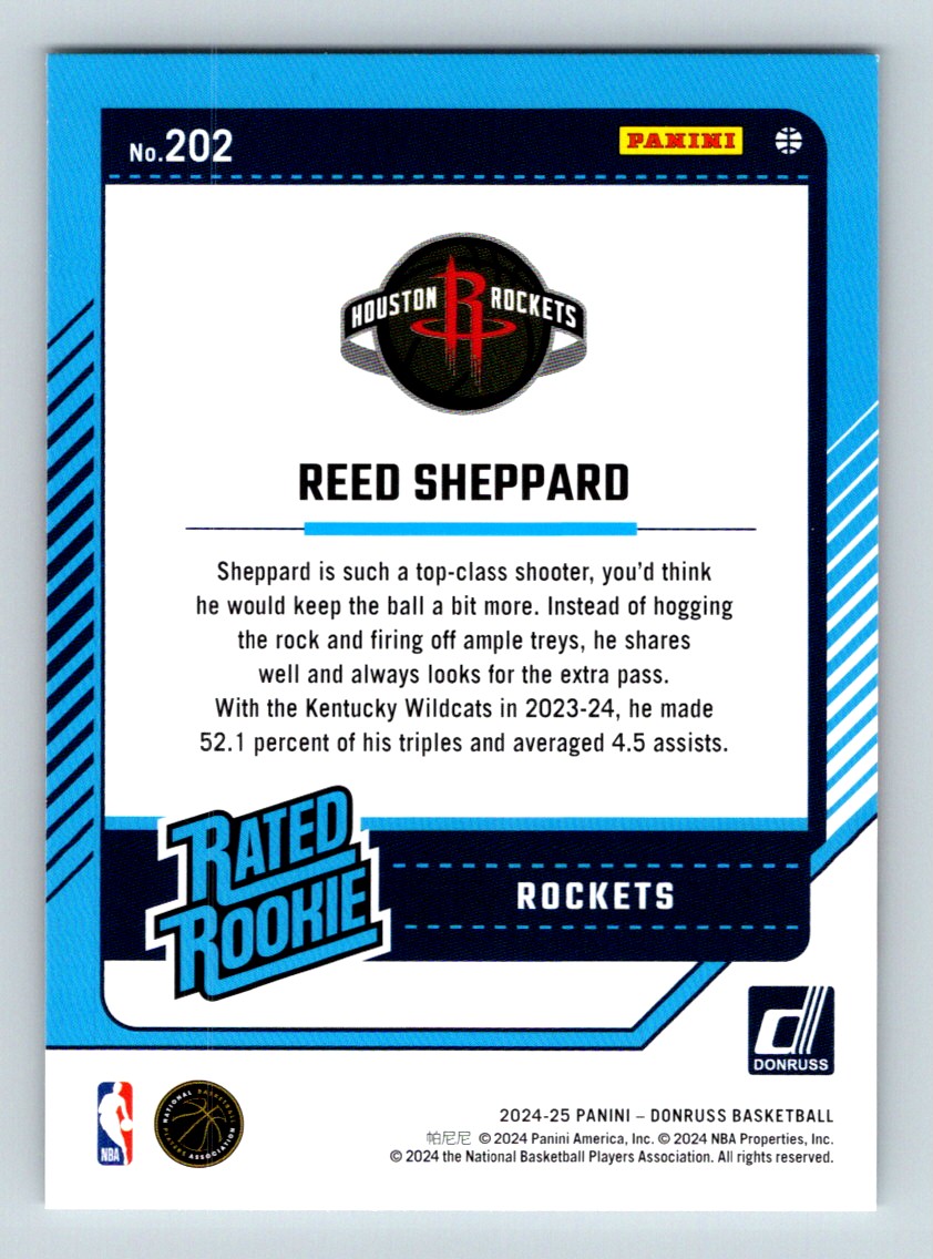 #202 Reed Sheppard 2024-25 Donruss Rated Rookie Base < RC Rockets