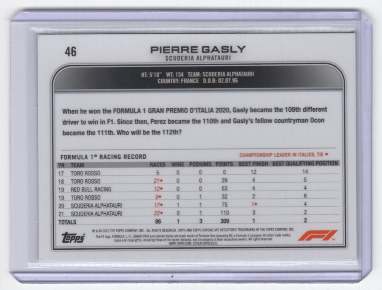 2022 Topps Chrome Formula 1 Sapphire *** Pierre Gasly Scuderia AlphaTauri #46