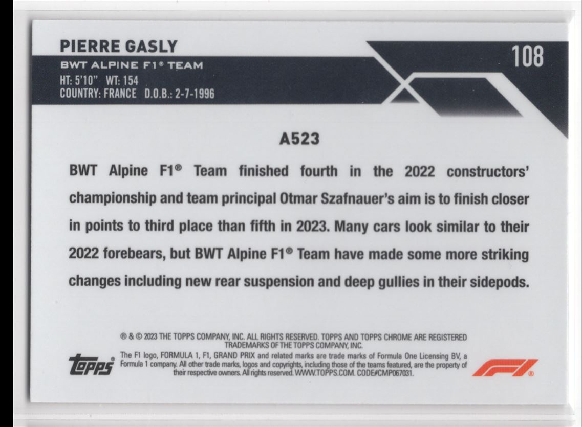 2023 Topps Chrome Formula 1 Pierre Gasly BWT Alpine F1 Team #108