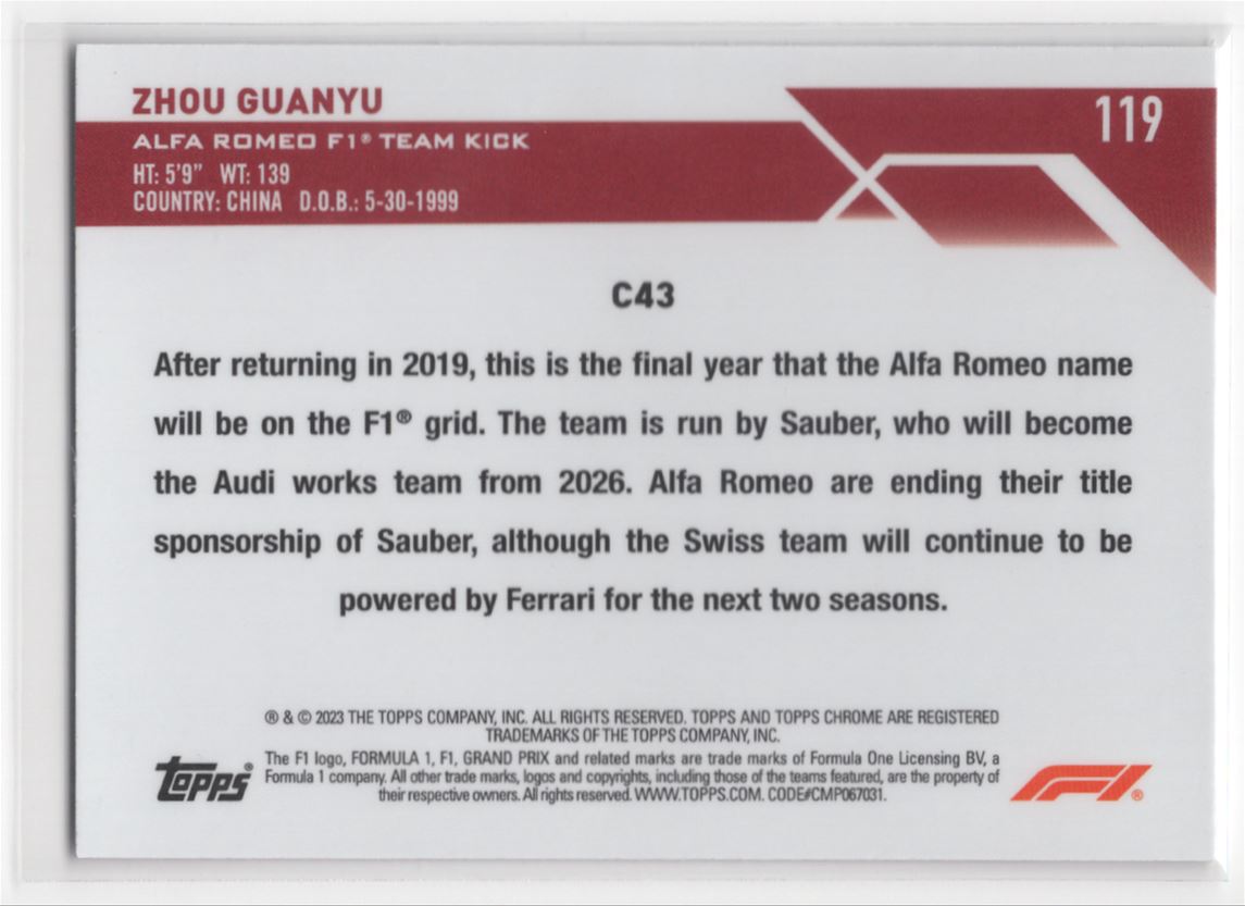 2023 Topps Chrome Formula 1 Zhou Guanyu Alfa Romeo F1 Team Kick #119