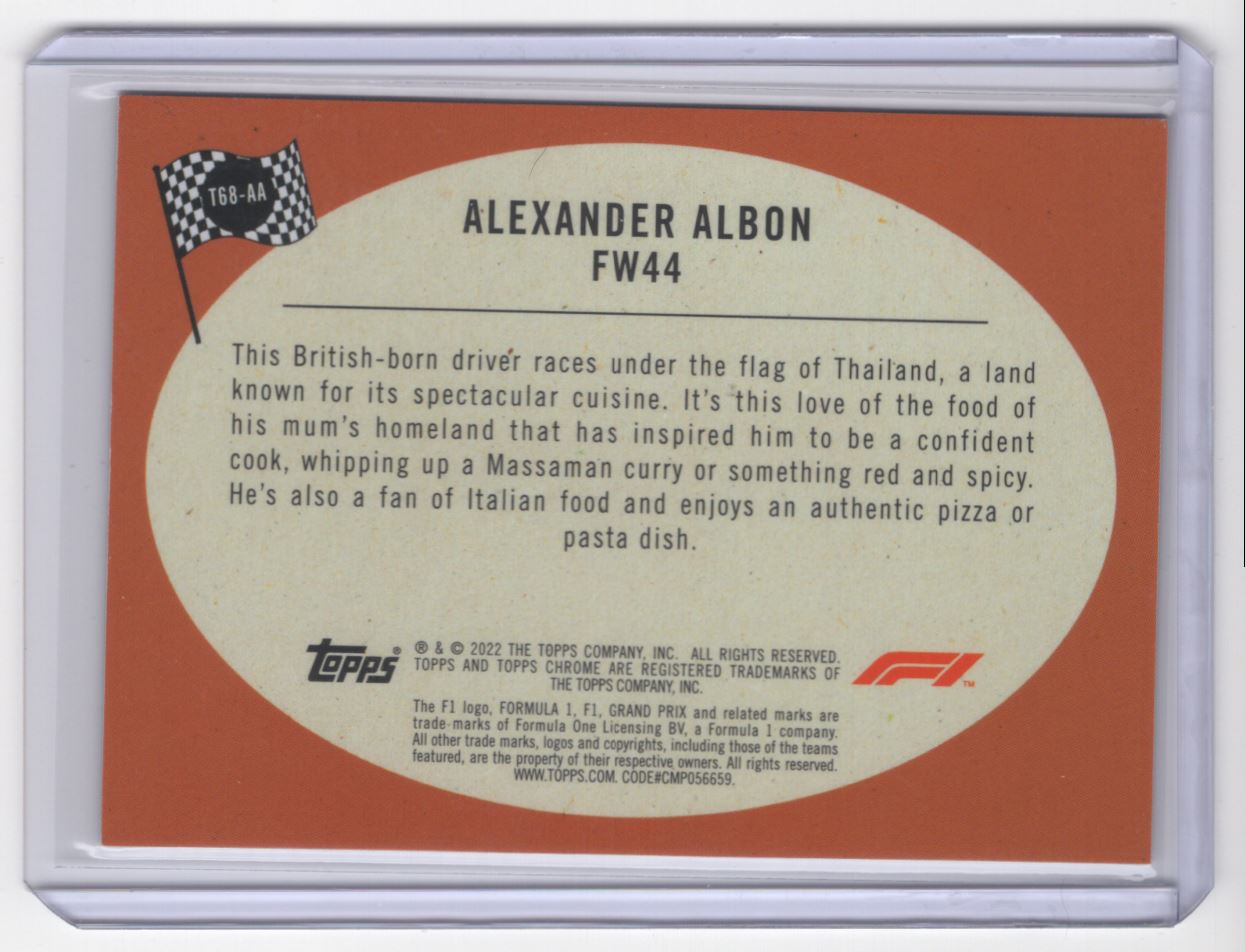 | 2022 Topps Chrome Formula 1 Racer Alexander Albon Williams Racing #T68-AA | ||||||||||||||||
