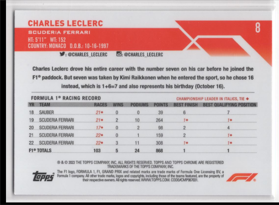2023 Topps Chrome Formula 1 Charles Leclerc Scuderia Ferrari #8