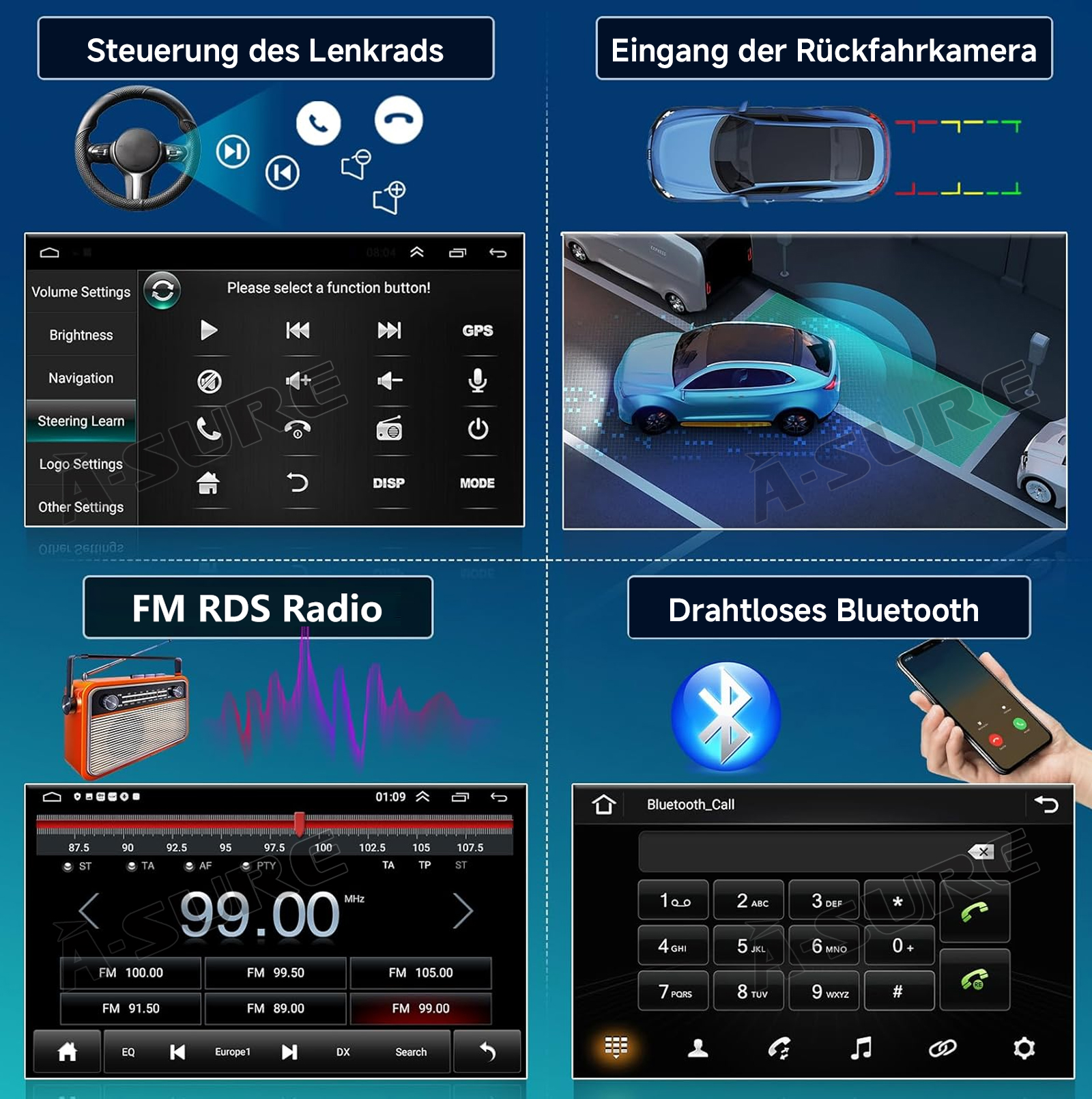 Rückfahrkameraeingang: Nach dem Anschluss an die Rückfahrkamera. Der Touchscreen zeigt automatisch das umgekehrte Bild an, sobald Sie den Rückwärtsgang einlegen. Machen Sie Ihr tägliches Rückwärtsfahren sicherer. Das Android-Autoradio mit Navi unterstützt die Lenkradsteuerung des Originalautos (wenn Ihr Auto Canbus nicht unterstützt, müssen Sie die Lenkradtasten lernen), um das Fahren bequemer und sicherer zu machen.(AHD 720P Rückfahrkamera Inklusive.)