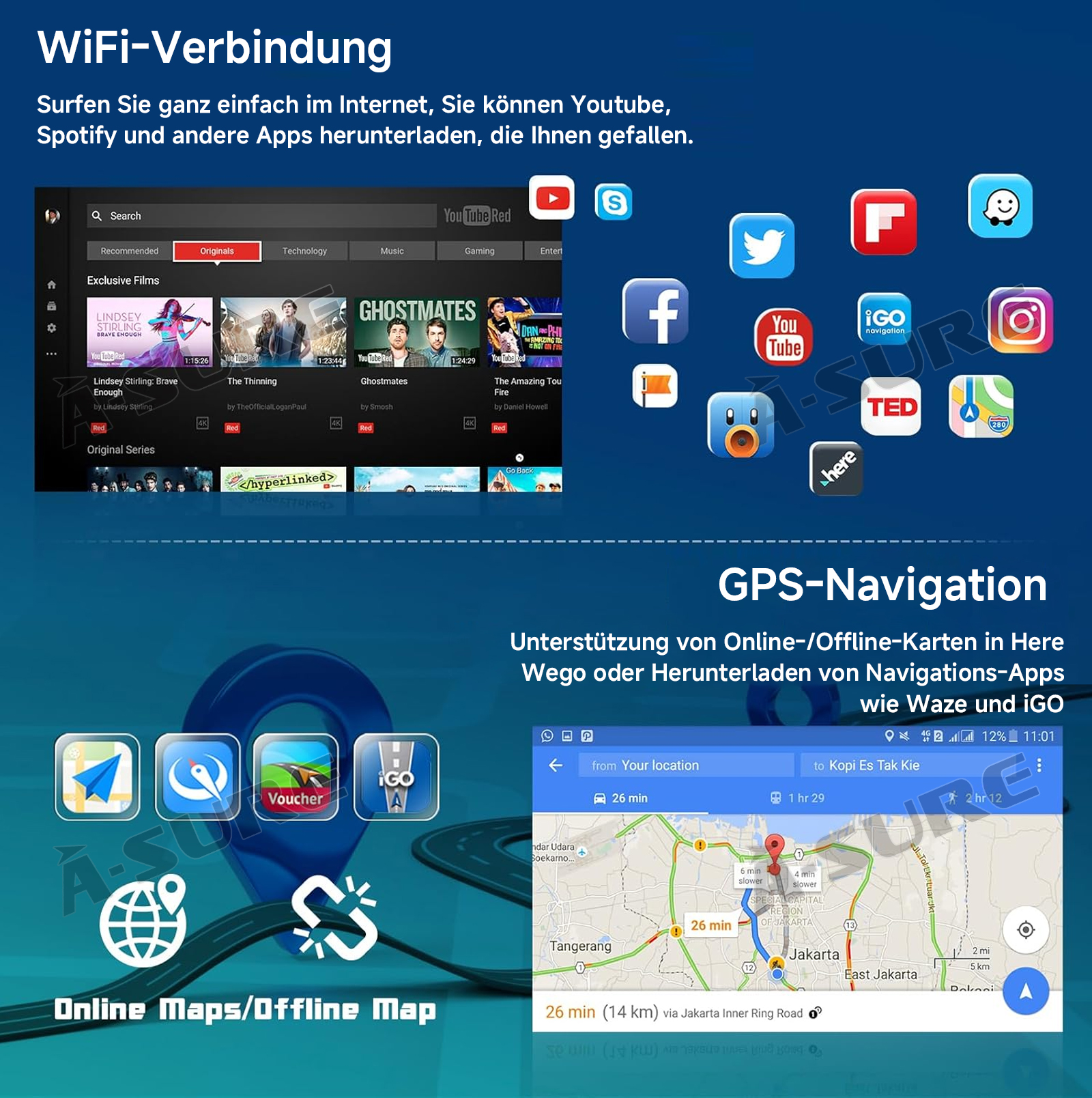 WiFi: Unterstützt WiFi-Verbindung; nach dem Verbinden mit WiFi können Sie jede Anwendung aus dem App Store herunterladen, wie z.B. YouTube, TikTok, Spotify usw. Das Auto-GPS mit präziser Positionierung und stabilem Signal unterstützt die Verwendung von Online- oder Offline-Karten.