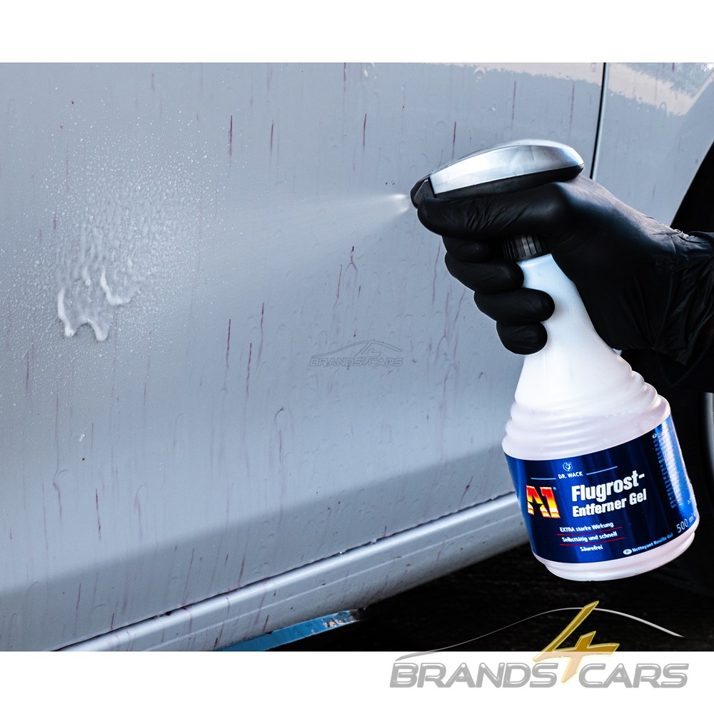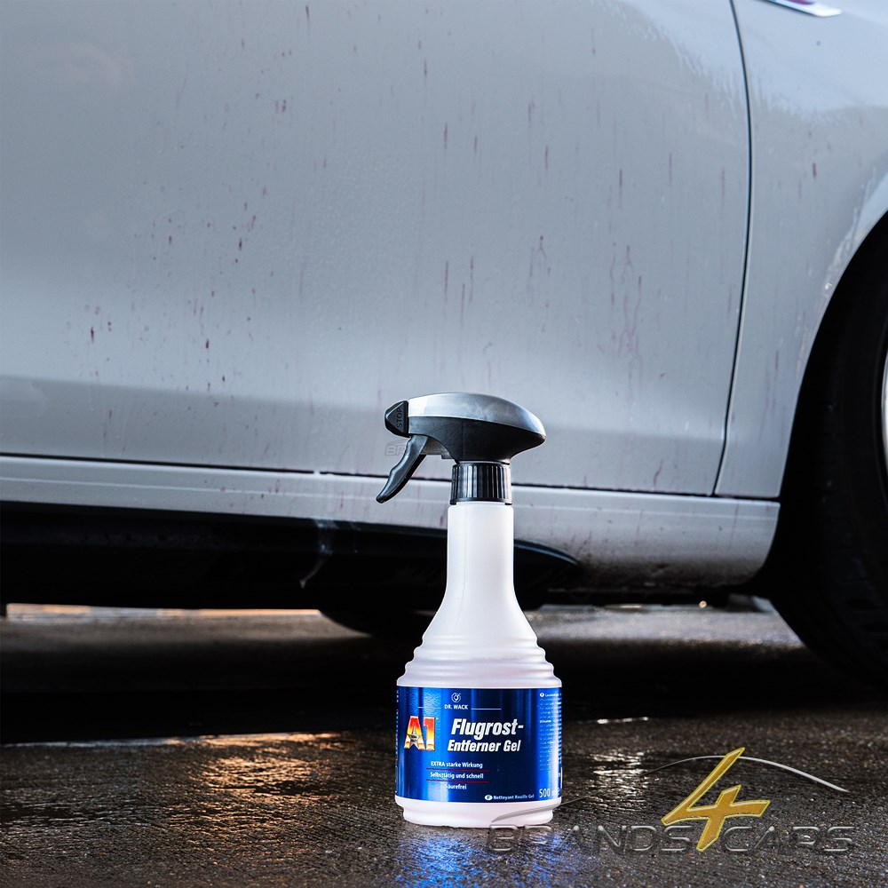 A1 Flugrost-Entferner Gel auf vorher gereinigte Stellen aufsprühen, ca. 5 Minuten einwirken lassen und mit nassem Schwamm nachwischen. Abschließend mit Wasser gründlich abspülen und abtrocknen.