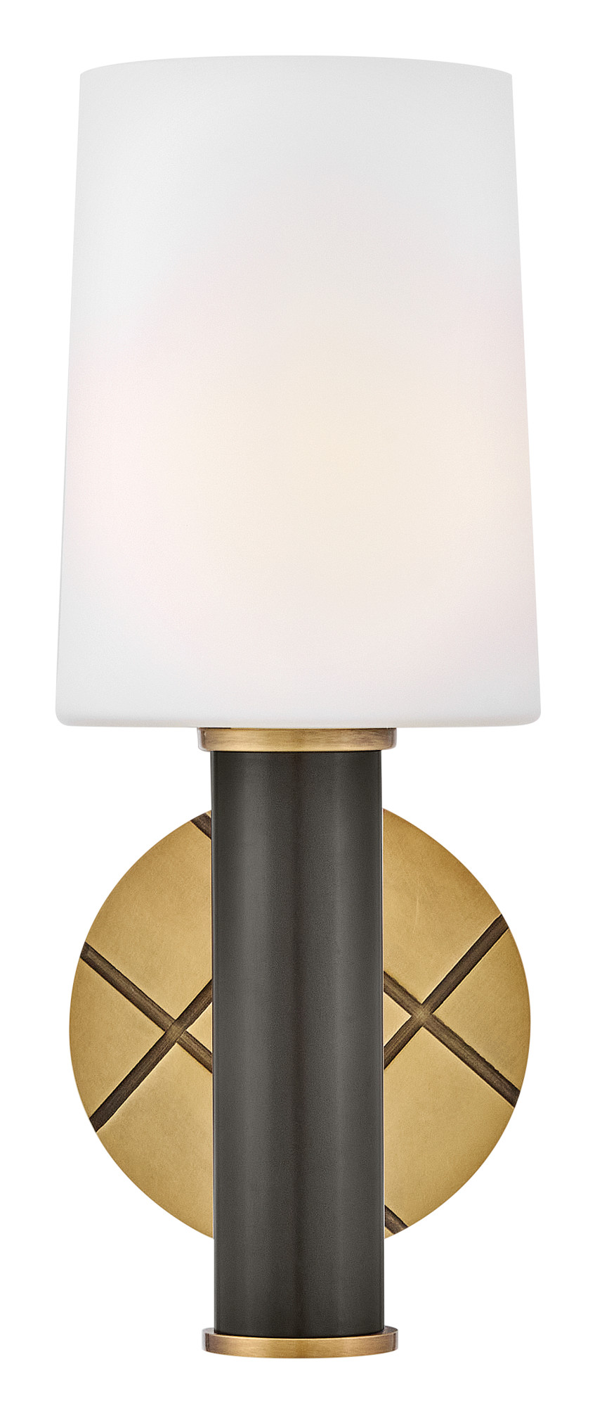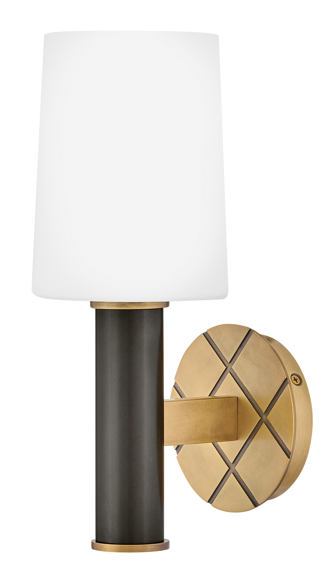 Item DescriptionFeaturing a geometric, crosshatch motif, Declan’s substantial silhouette is enhanced by a heavy cast backplate and stem accentuated by a contrasting, two-tone finish. A tall, tapered, etched opal glass shade creates softly diffused illumination and a comfortable atmosphere.