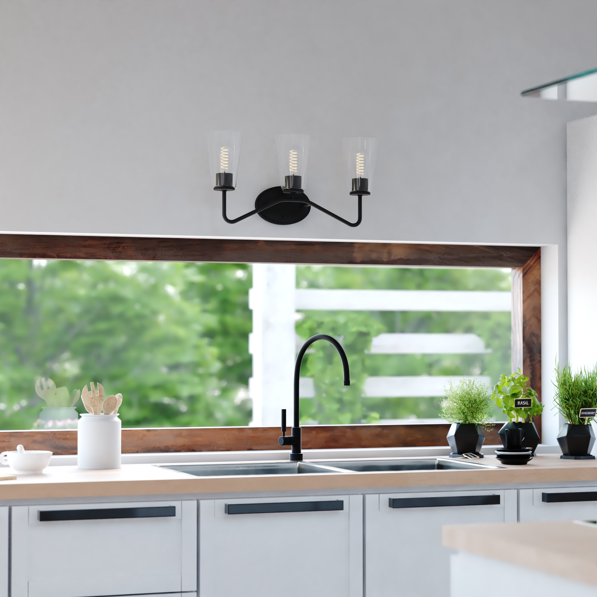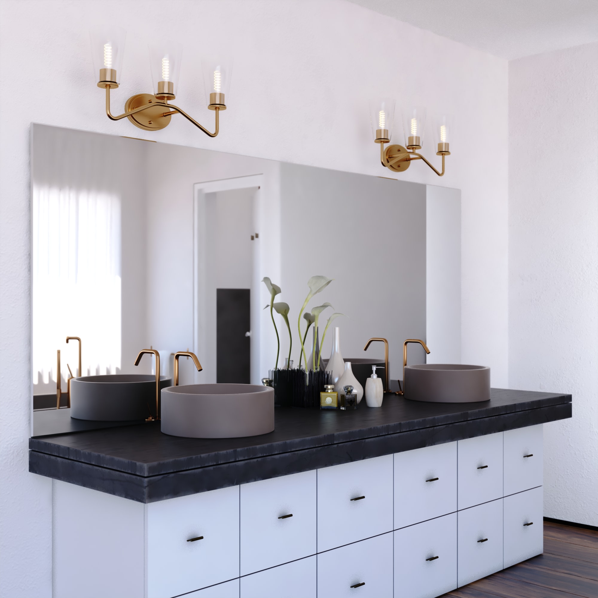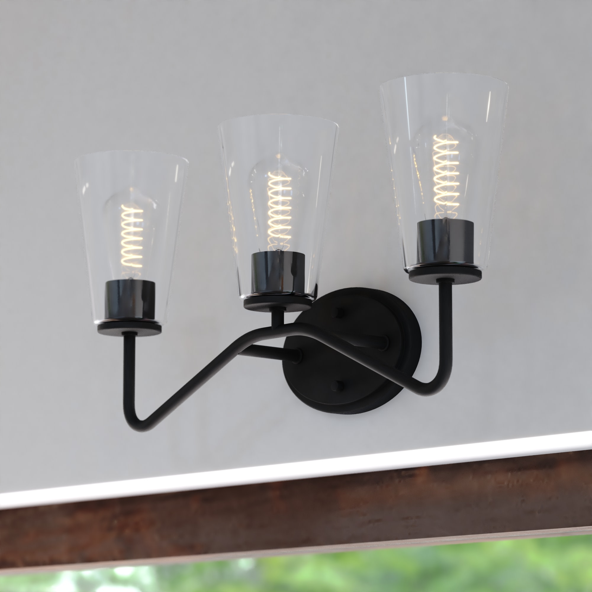 Item DescriptionThe Beverly collection provides a modern take on classic elegance. Uniquely curved arms in a finish gently support the tapered glass. Round discs hold the glass creating an inviting aesthetic. This bathroom light is perfect over medium vanities or as a pair over double sinks. Add this versatile three light vanity for any bathroom for the ultimate addition of transitional style.
