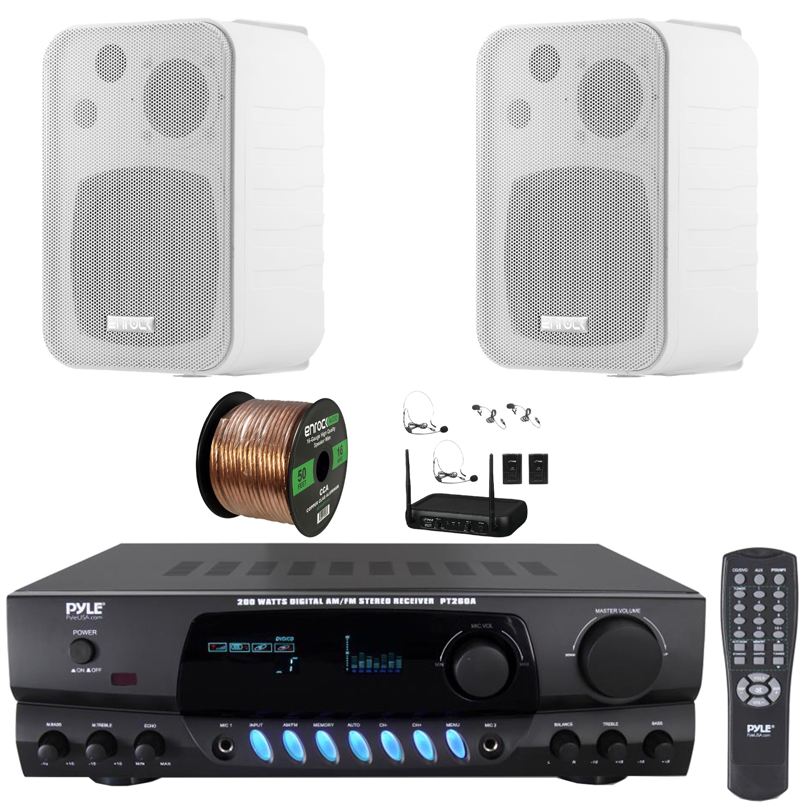 PACKAGE BUNDLE INCLUDES: Pyle PT260A Digital Display Screen 200 Watts Digital AM/FM Radio Home Audio Stereo Amplifier Receiver, 2x Enrock EKMR408W 4" 30 Watt Max Power 3-Way Indoor/Outdoor White Box-Speakers, Pyle PDWM2145 VHF Wireless Microphone System, 2 Headset/Lavalier Mics, 2 Bodypacks, Fixed Frequency, 50 Feet 16 Gauge Speaker Wire "ONLY 1 PAIR OF SPEAKERS INCLUDED - RECEIVER SUPPORTS MULTIPLE SPEAKER PAIRS"