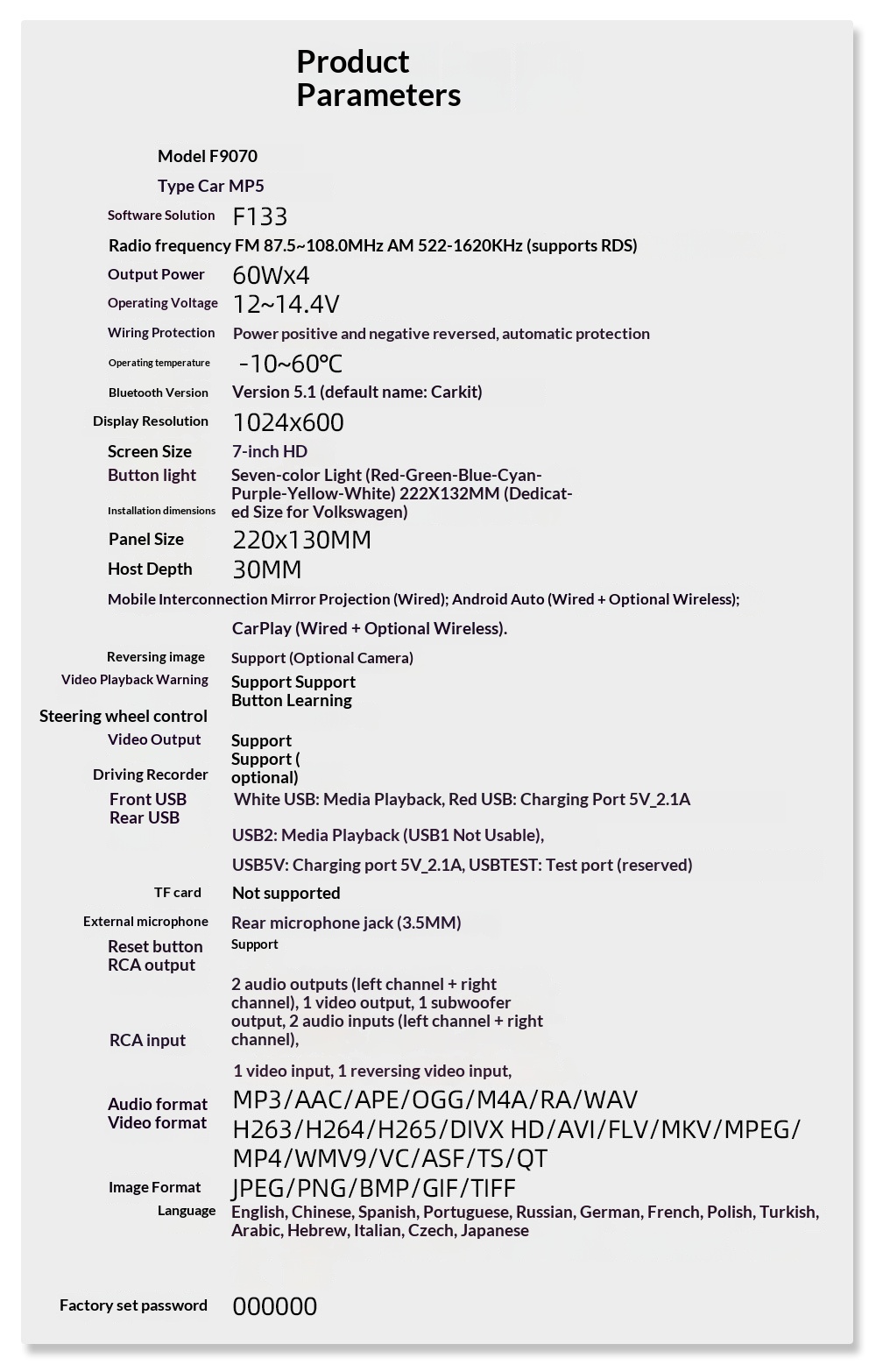 Model Specification: F9070C (wired CarPlay)