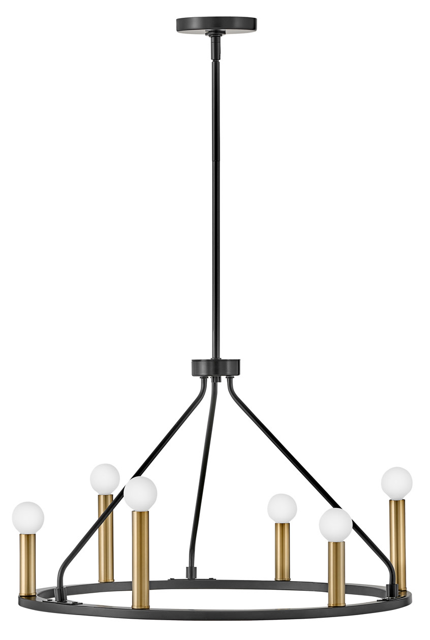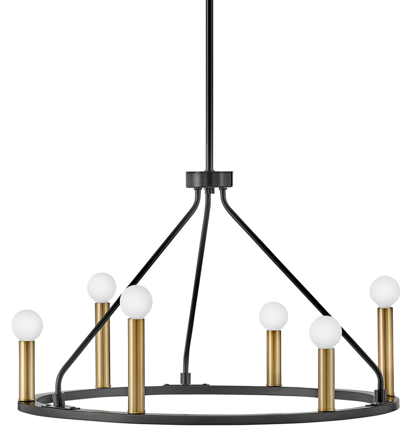 Item DescriptionLazlo brings it on every level. Whether you are feeling modern lodge vibes, a contemporary urban loft or anything in between, Lazlo’s sleek Black frame feels luxe but without all the fuss. This 6-light round chandelier features classic candle sleeves of varying heights, streamlined with a modern makeover in Lacquered Brass