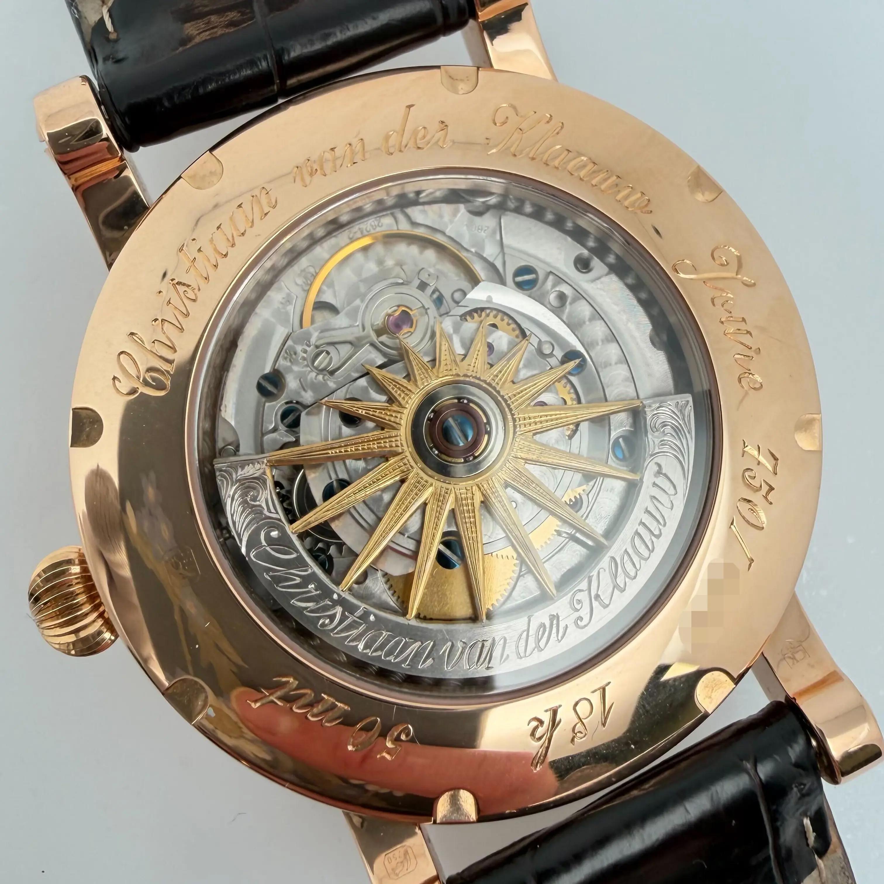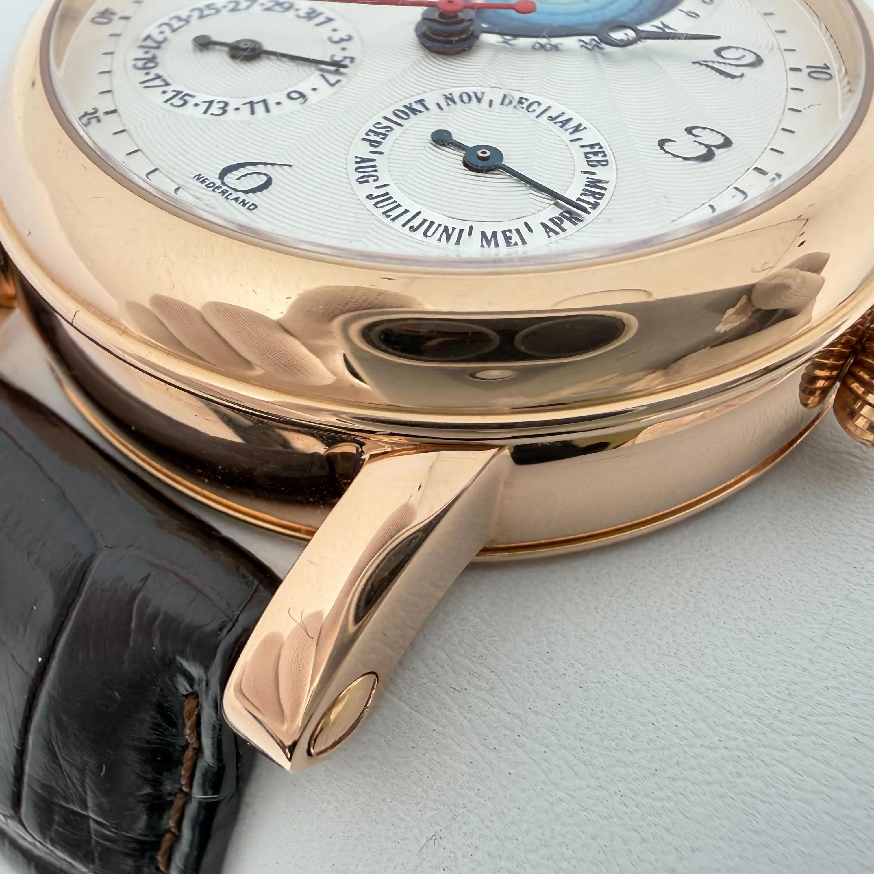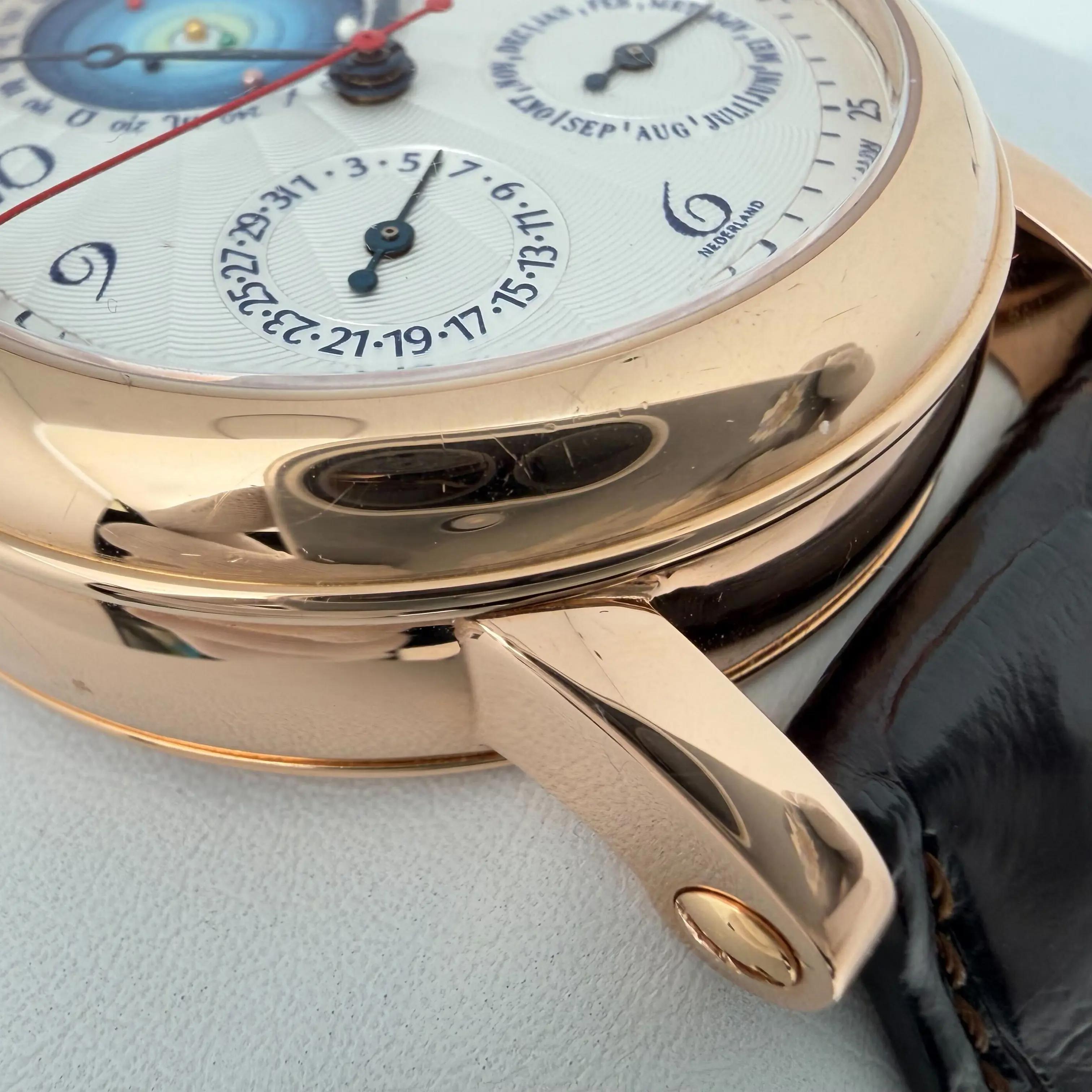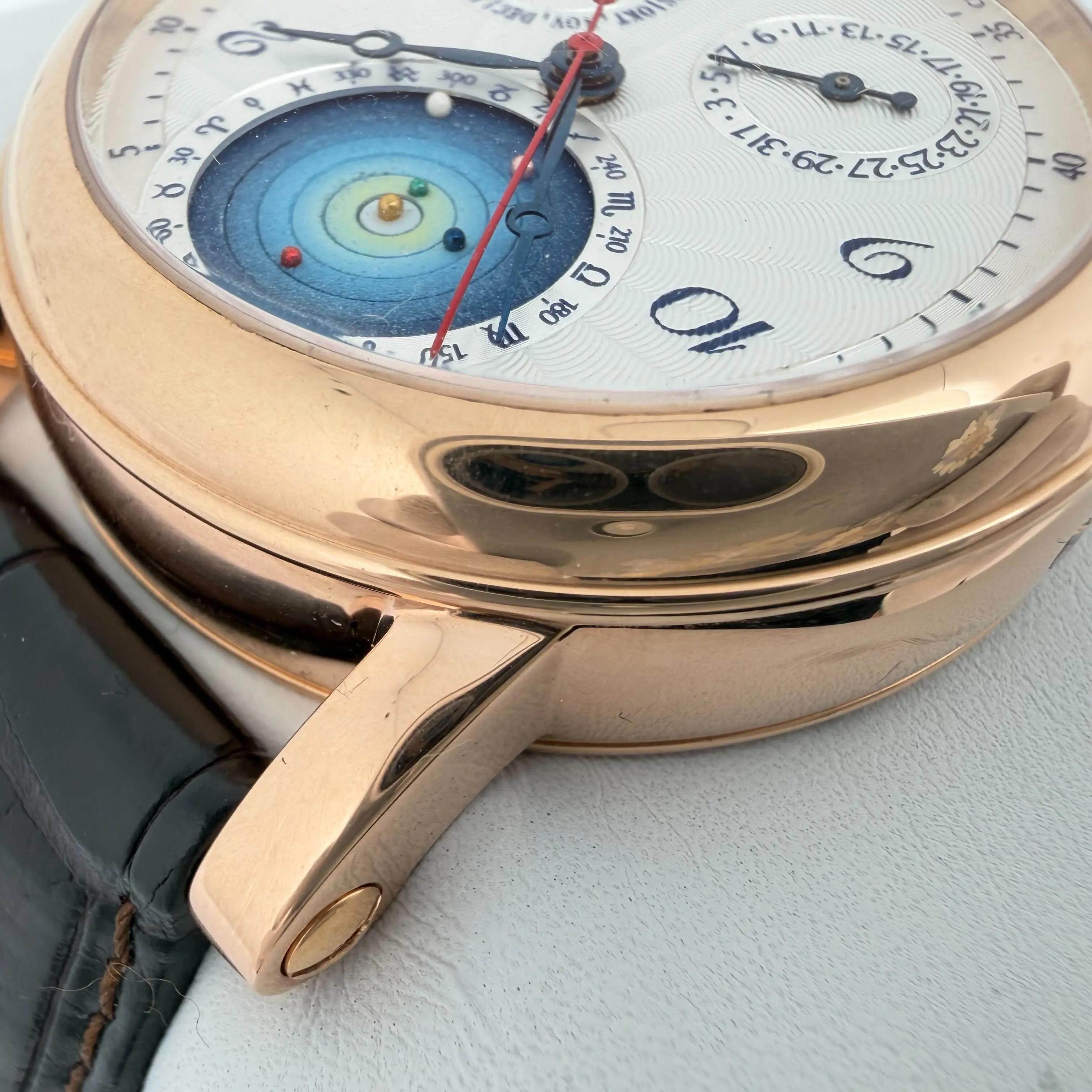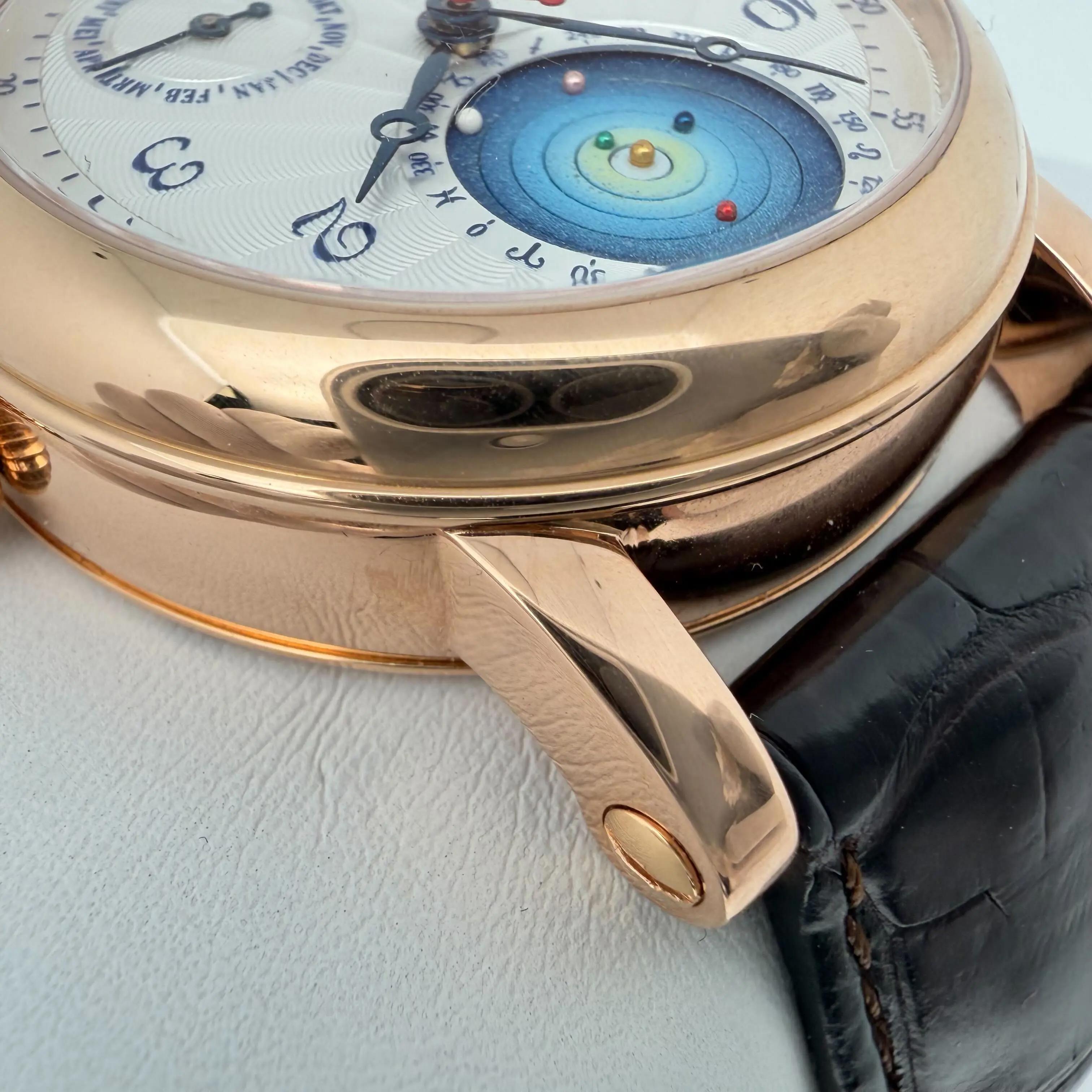 Very good condition. Missing Mercury on the planetarum disc. Clean dial, hands and hour markers. Calibrated timekeeping. Flawless complications. Few hairline scratches across golden surfaces. Signs of wear on strap. Professional free-of-charge polishing is available upon the buyer's request. Silvered, planetarium aperture depicting the relative placement of Mercury, Venus, Earth, Mars, Jupiter, and Saturn around the sun. Case and dial signed Christiaan Van Der Klaauw, movement signed Glashutte. Original box and papers are not included. Backed by a 1-year warranty and a 30-day return window.