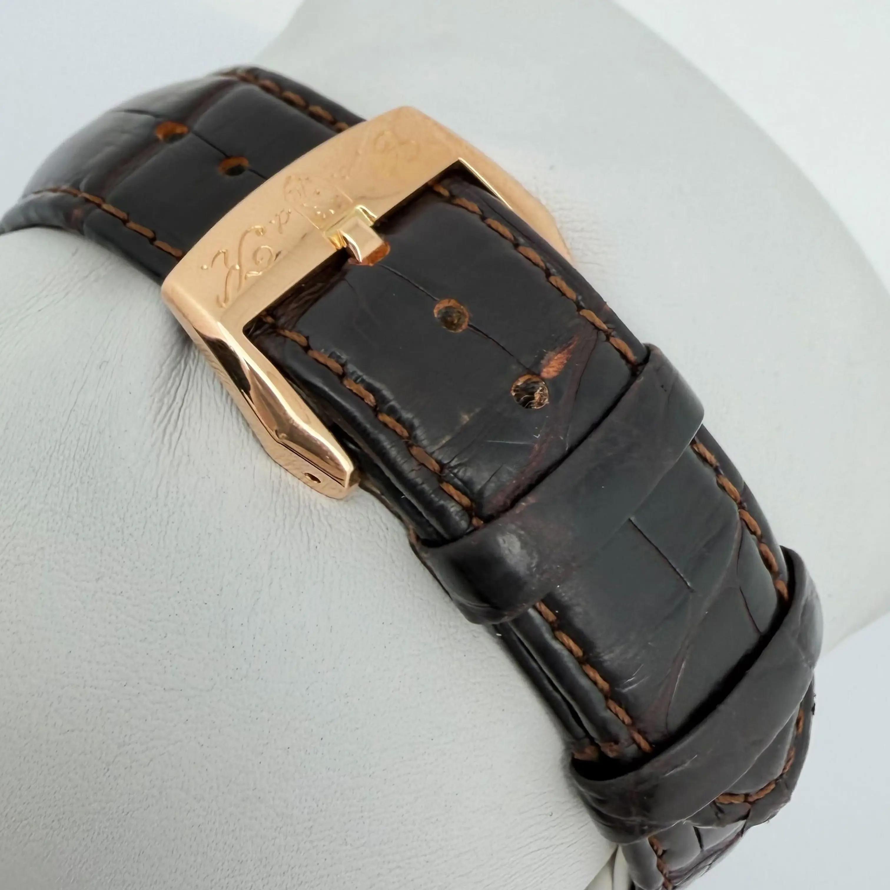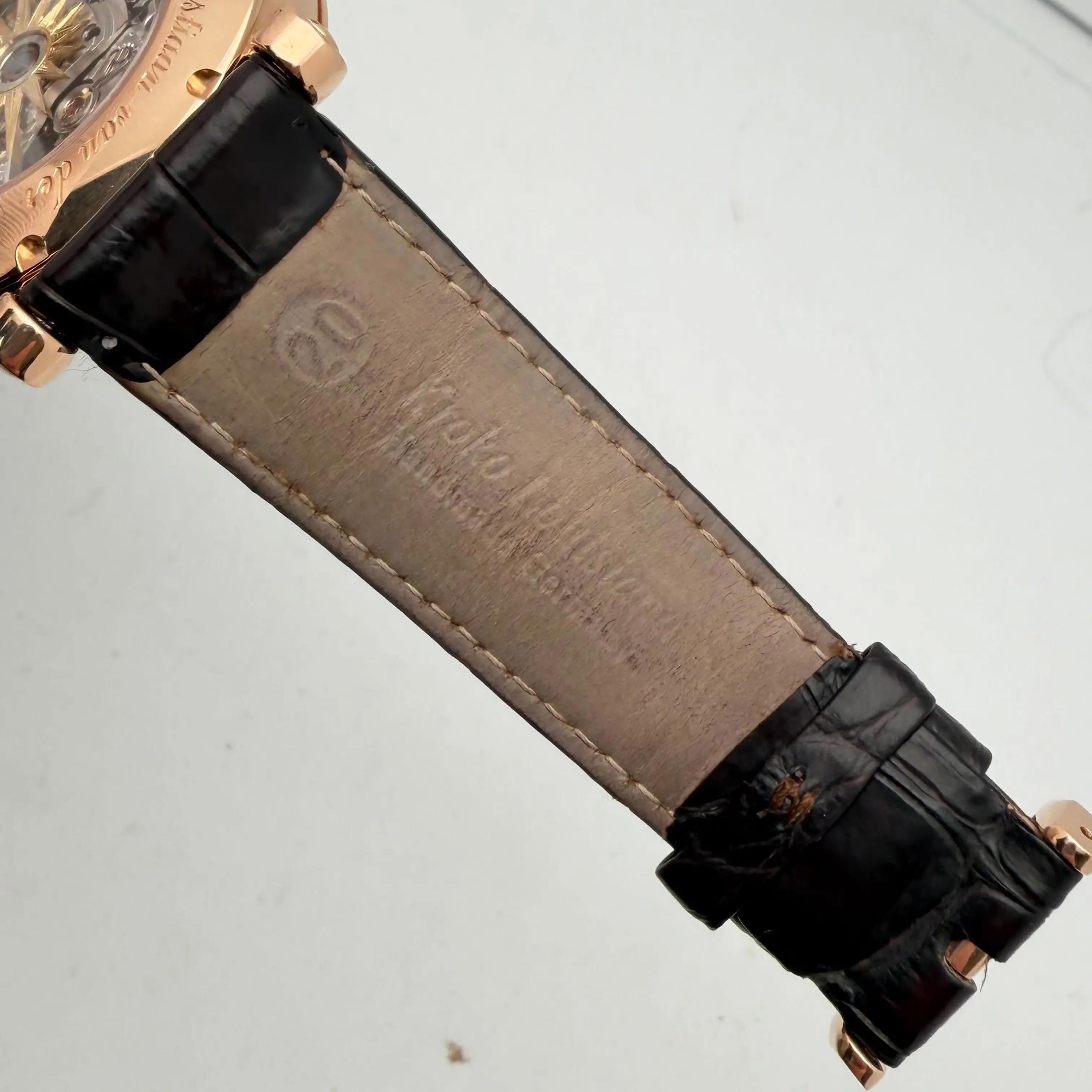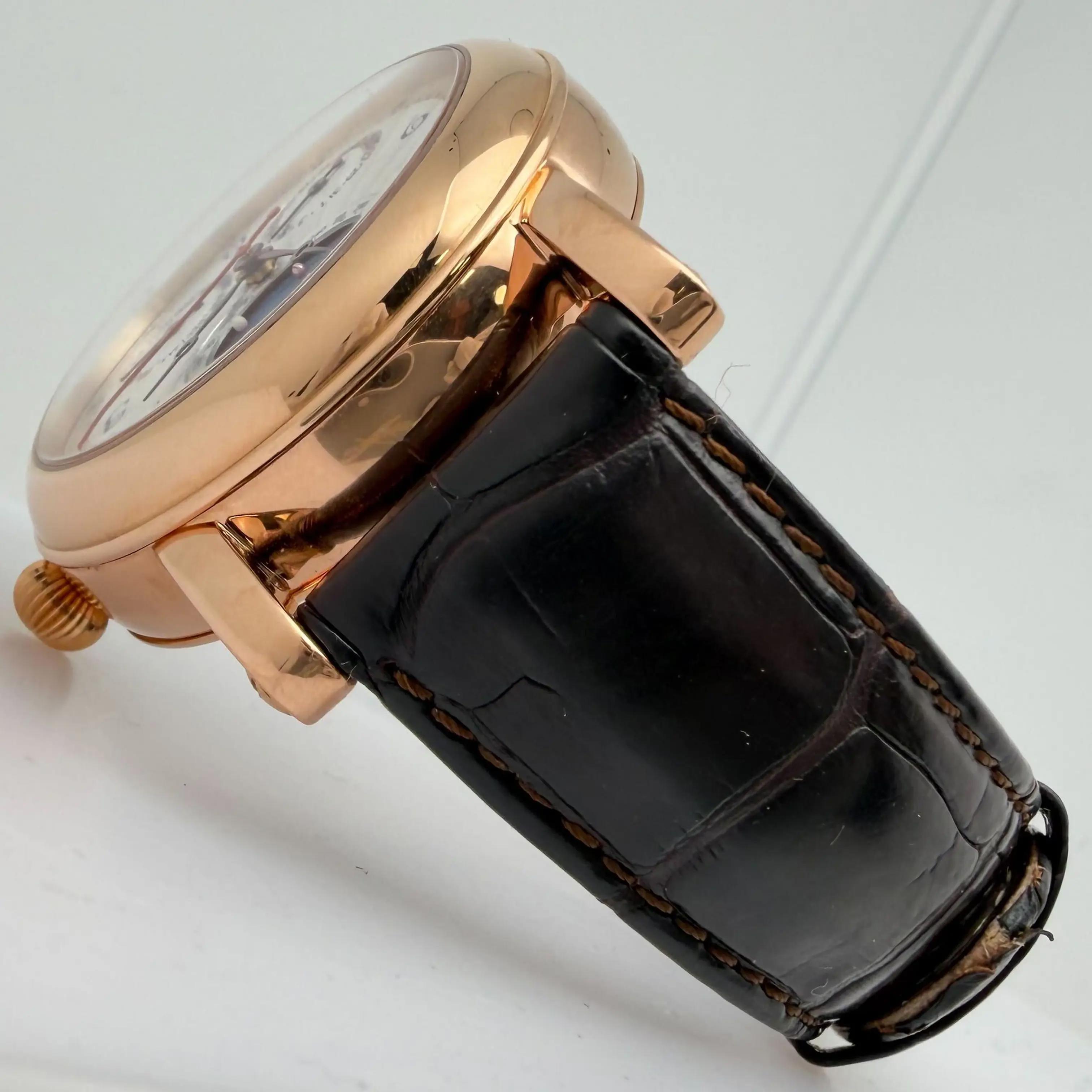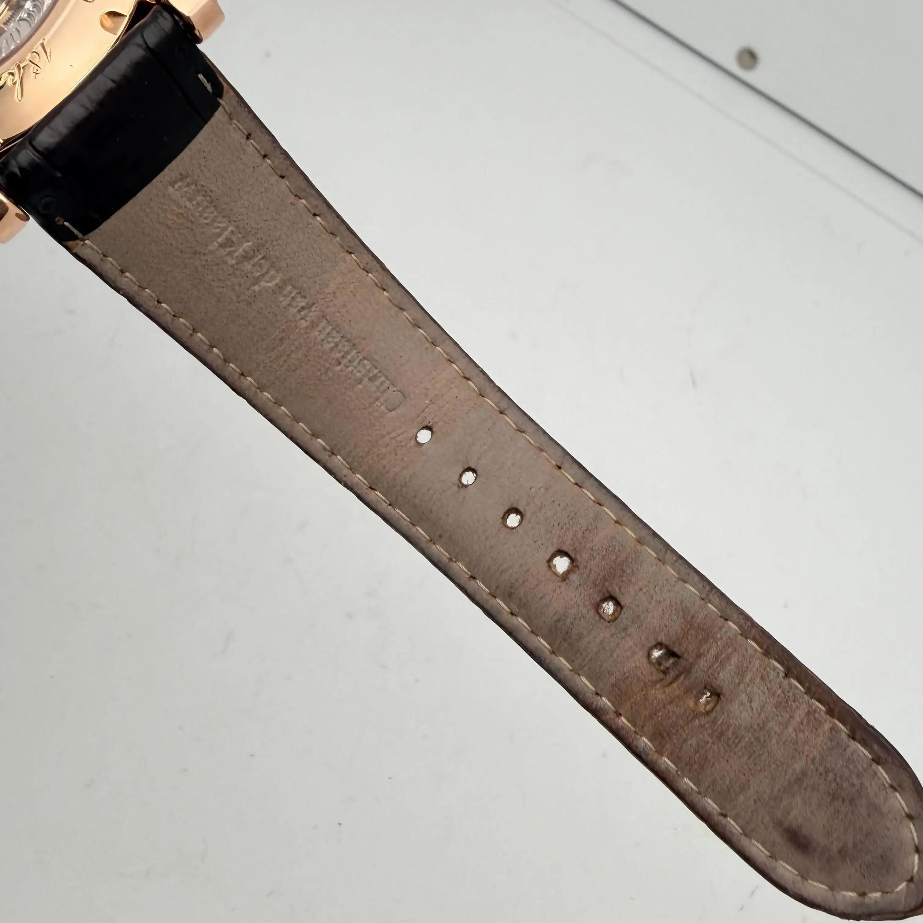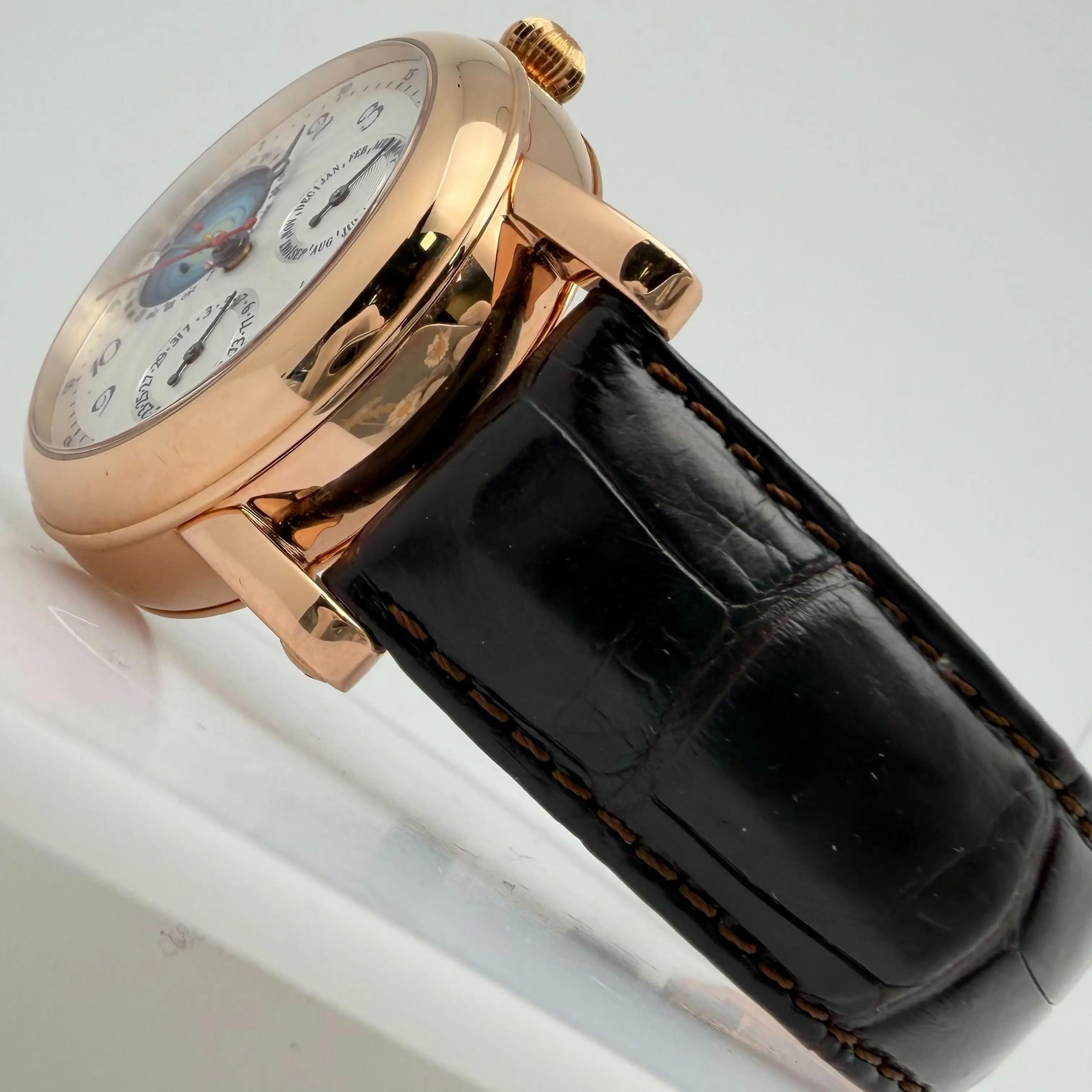 Very good condition. Missing Mercury on the planetarum disc. Clean dial, hands and hour markers. Calibrated timekeeping. Flawless complications. Few hairline scratches across golden surfaces. Signs of wear on strap. Professional free-of-charge polishing is available upon the buyer's request. Silvered, planetarium aperture depicting the relative placement of Mercury, Venus, Earth, Mars, Jupiter, and Saturn around the sun. Case and dial signed Christiaan Van Der Klaauw, movement signed Glashutte. Original box and papers are not included. Backed by a 1-year warranty and a 30-day return window.