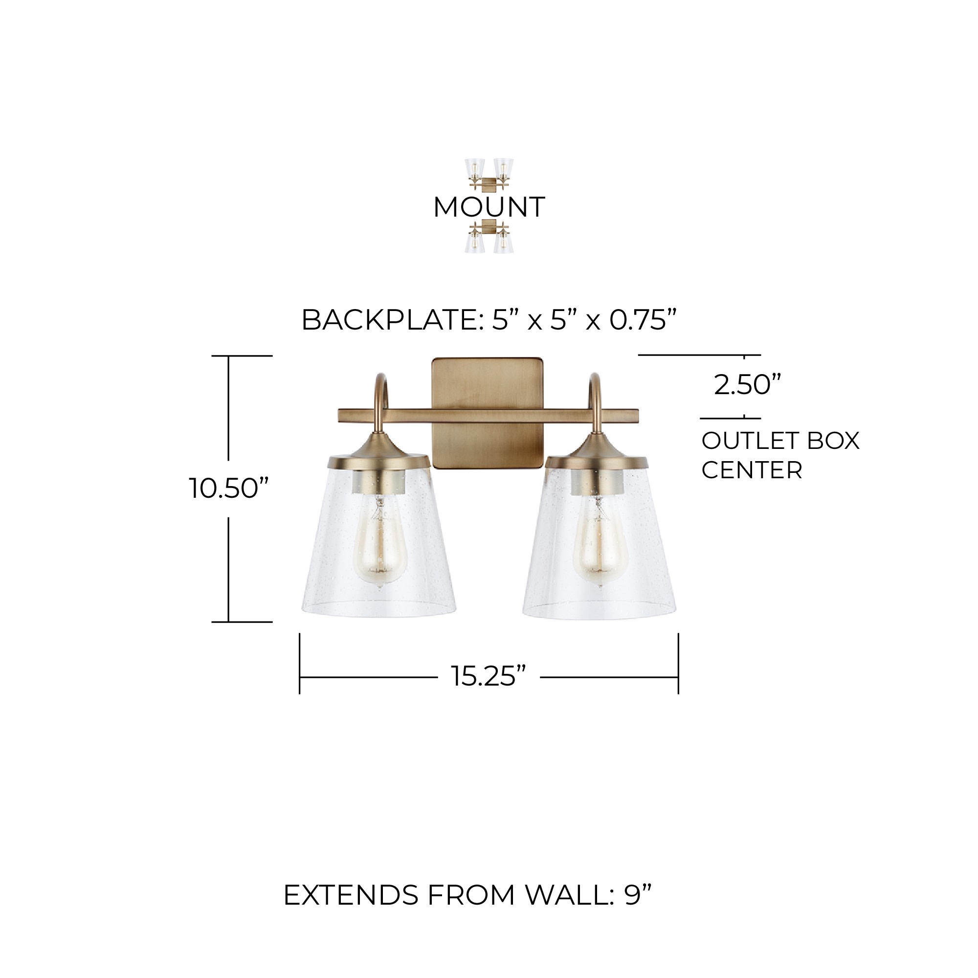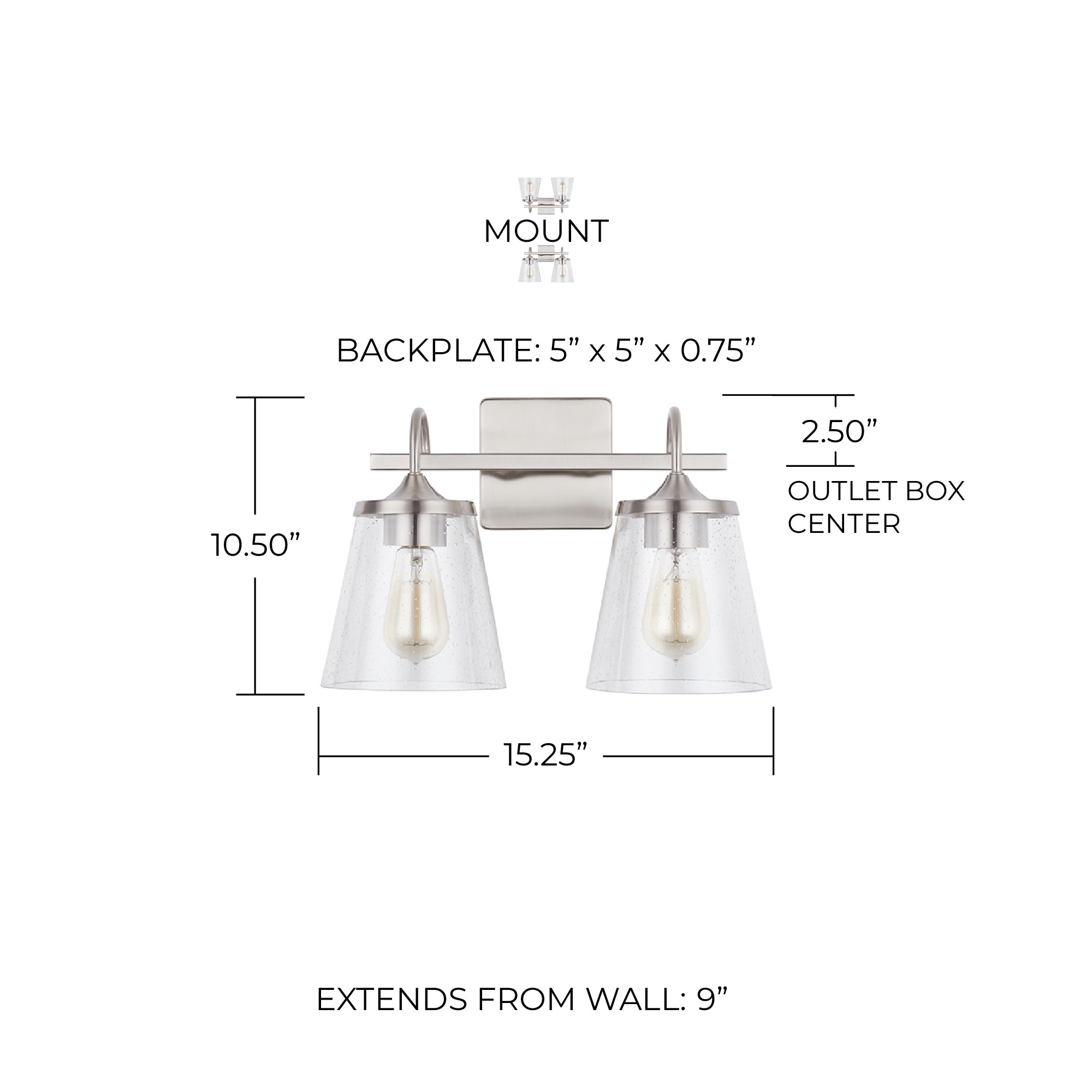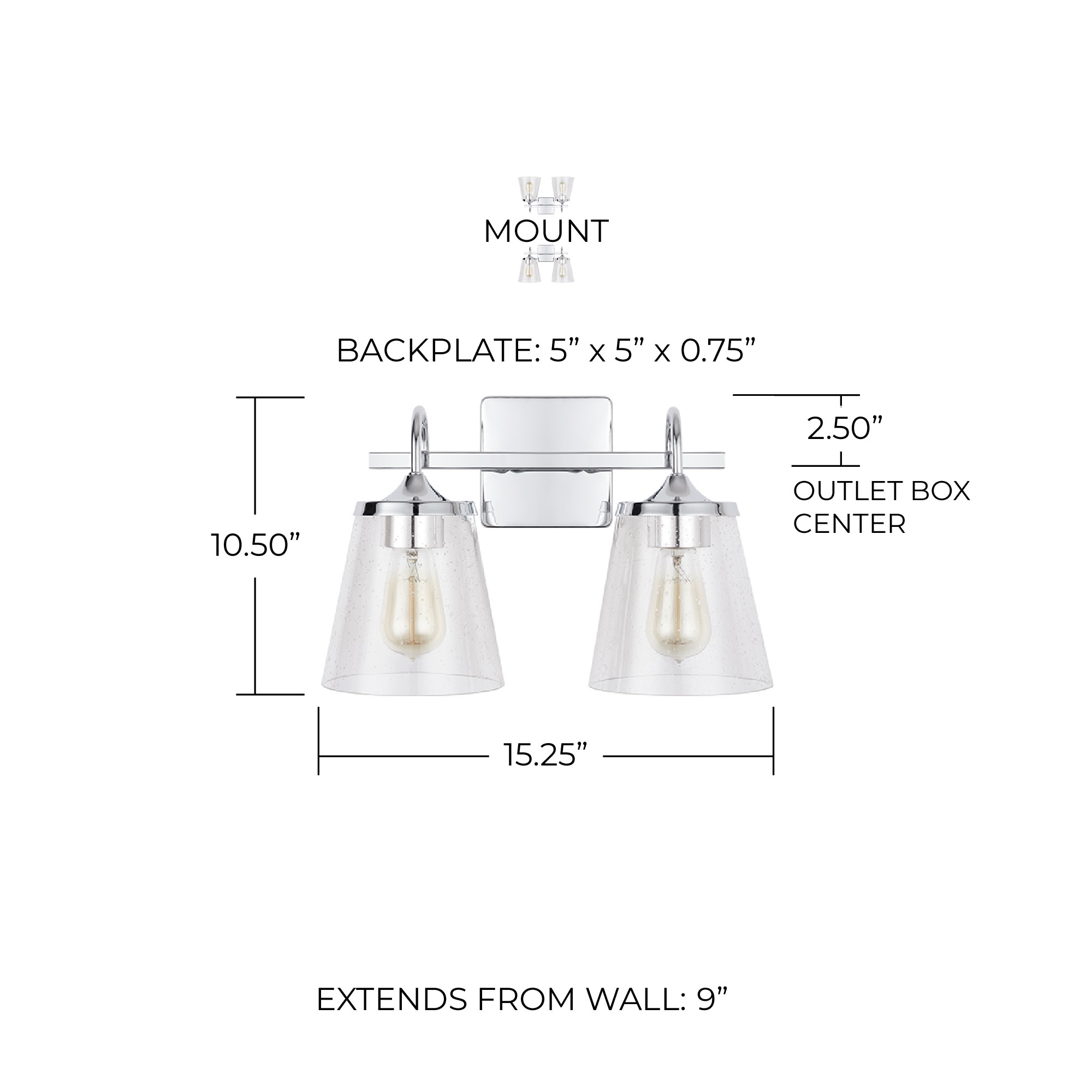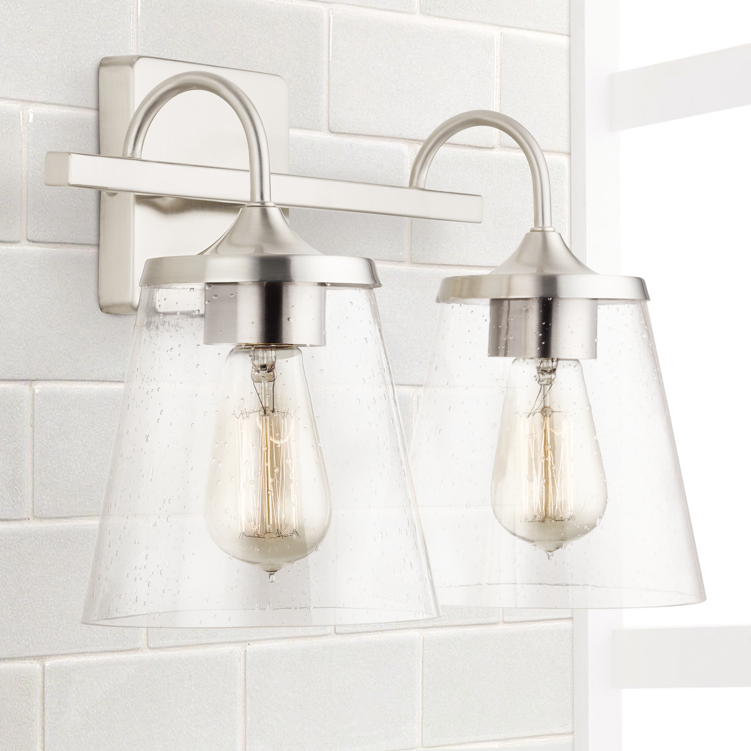 Item DescriptionThe wide cone seeded glass on this 2-Light Vanity is suspended by a simple arched arm and tapered metal cap makes it a timeless shape for any bathroom vanity.