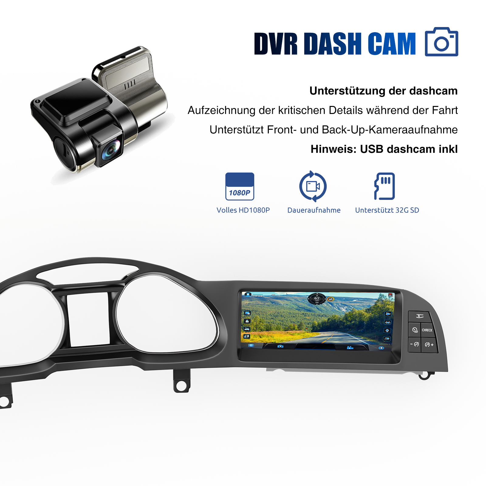 1080P HD Dash Cam: Diese Dash Cam benötigt keine zusätzliche Nutzung des Speicherplatzes des Android-Autoradios. Sie können eine SD-Karte in den seitlichen Steckplatz einlegen (SD-Karte nicht enthalten), um den Speicher des Autoradios zu sparen. Die hochauflösende HDR Nachtsicht Dash Cam bietet Ihnen ein herausragendes HD-Videoerlebnis. Egal ob tagsüber oder nachts, sie erfasst hellere und klarere Bilder. Die Dash Cam verfügt über ein 170° Weitwinkelobjektiv, mit dem Sie Ereignisse auf der Straße aus einem breiten Blickwinkel extrem klar erfassen und Beweise sofort speichern können.Hinweis: Dieses DVR-Produkt wird über das Autoradio mit Strom versorgt. Wenn Ihr Autoradio die Stromversorgung unterbricht, funktioniert auch das DVR nicht mehr. Diese Autokamera belegt einen USB-Anschluss des Autoradios, bitte beachten Sie, ob Ihr Autoradio ausreichend USB-Anschlüsse hat.
