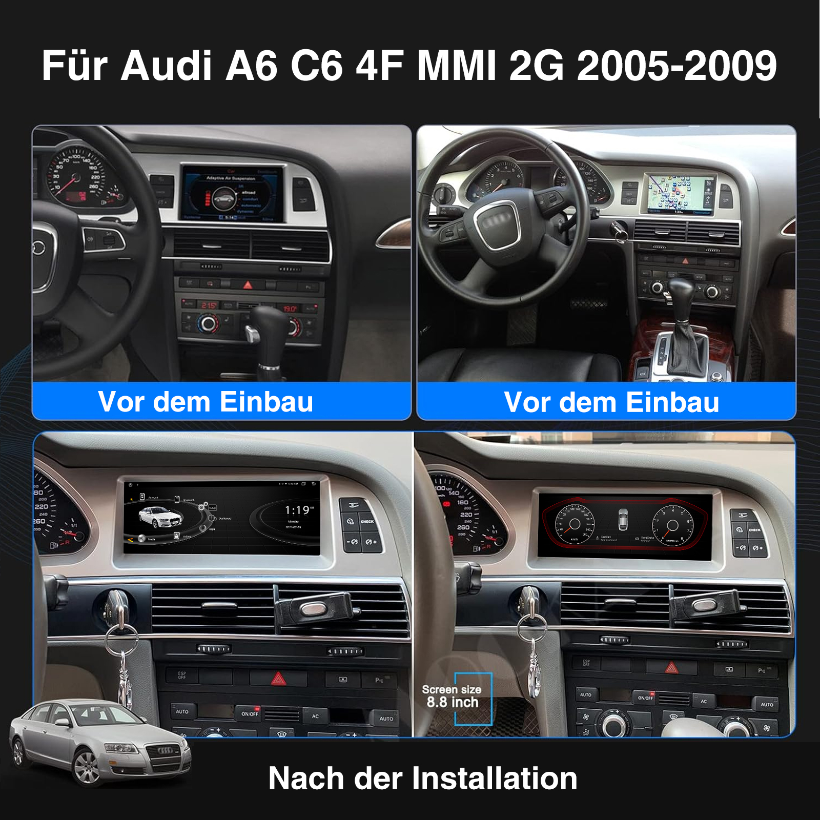 8,8 Zoll Android 14 Autoradio für Audi A6 mit MMI 3G System: Das Radio ist mit dem neuesten Android 14 Betriebssystem ausgestattet, das mit 6GB RAM + 128GB ROM integriert ist, so dass Sie schnellere, reibungslosere und intelligentere Navigationsanwendungen erleben können.