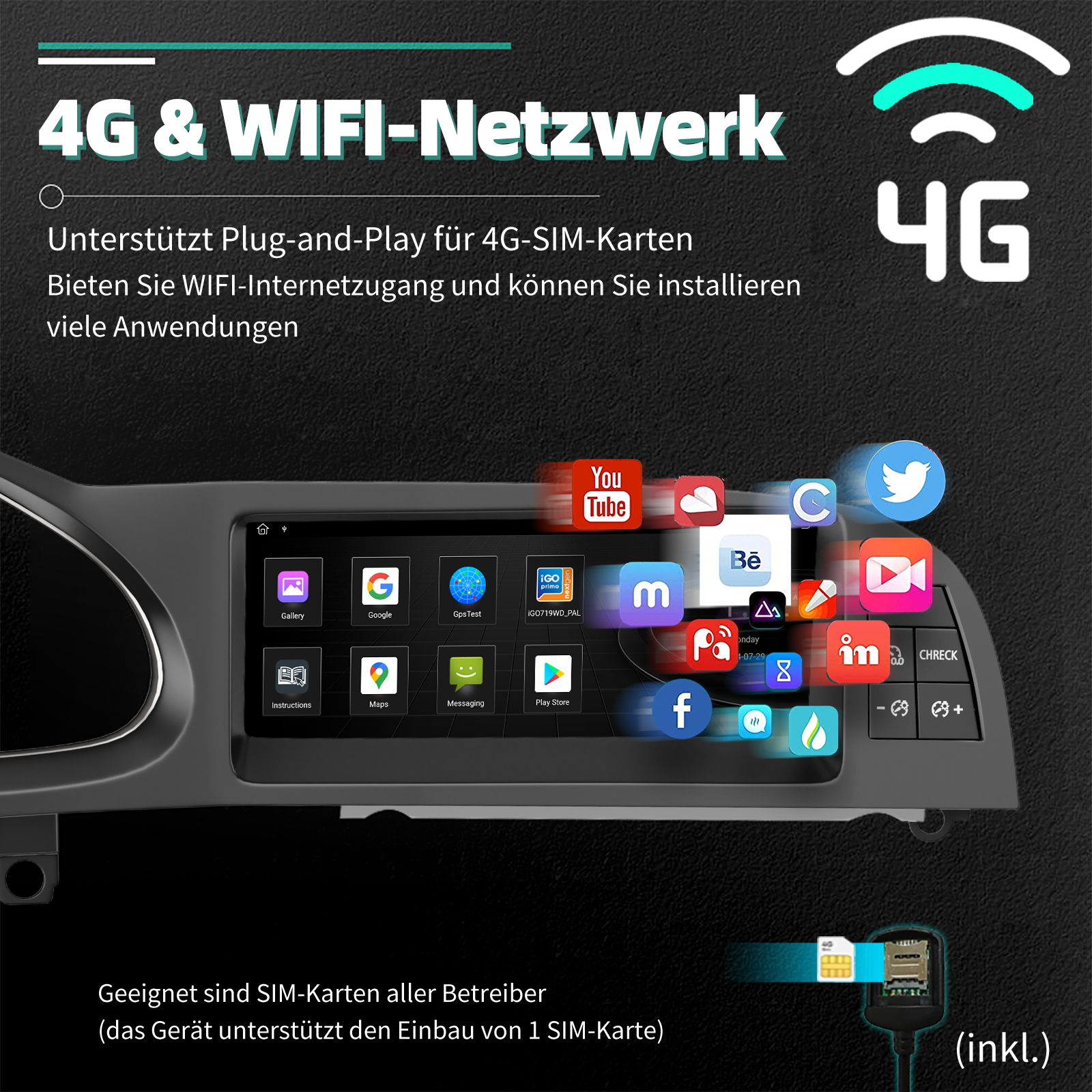 - Built-in 4G und WIFI-Modul für Internet, legen Sie einfach Ihre 4G-SIM-Karte, egal wo Sie fahren, werden Sie den Spaß von Internet-Surfen genießen, machen es möglich, für Online-Navigation / Musik / Film ect.