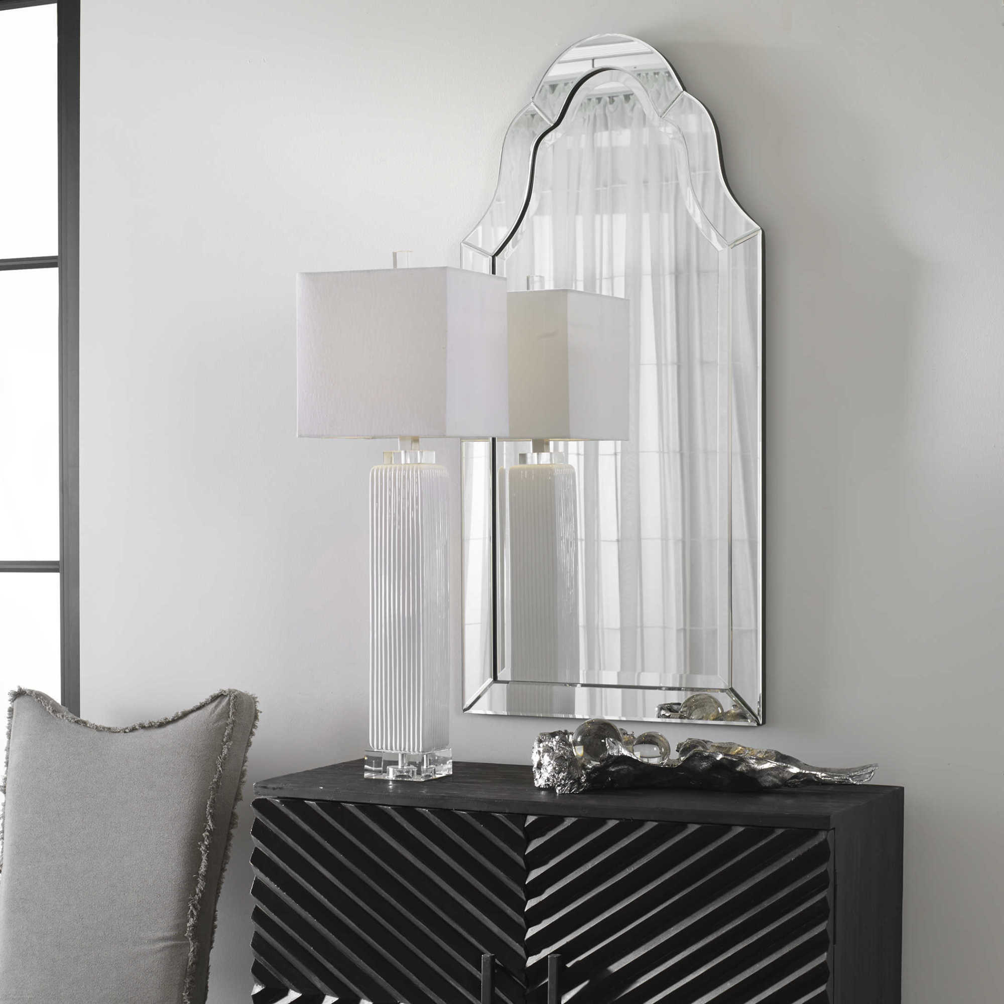 Item DescriptionThis frameless, arched mirror has polished edges for a smooth, clean finish. The etching and v-grooves give wonderful character to this beveled mirror.