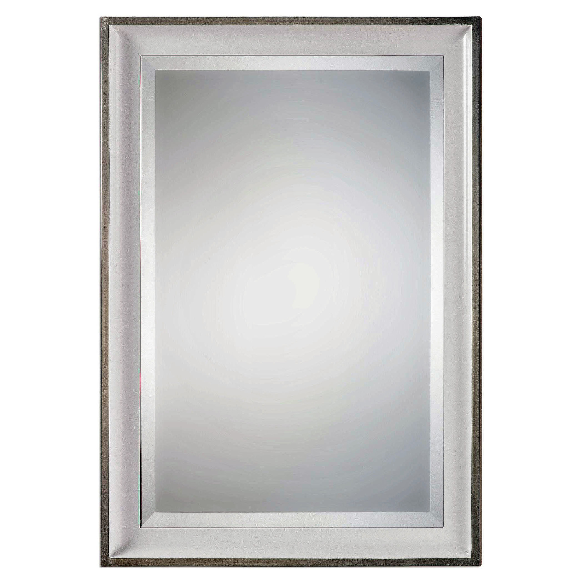 Item DescriptionSloped profile frame finished in gloss white, accented with a silver leaf outer edge. Mirror is beveled. May be hung horizontal or vertical.