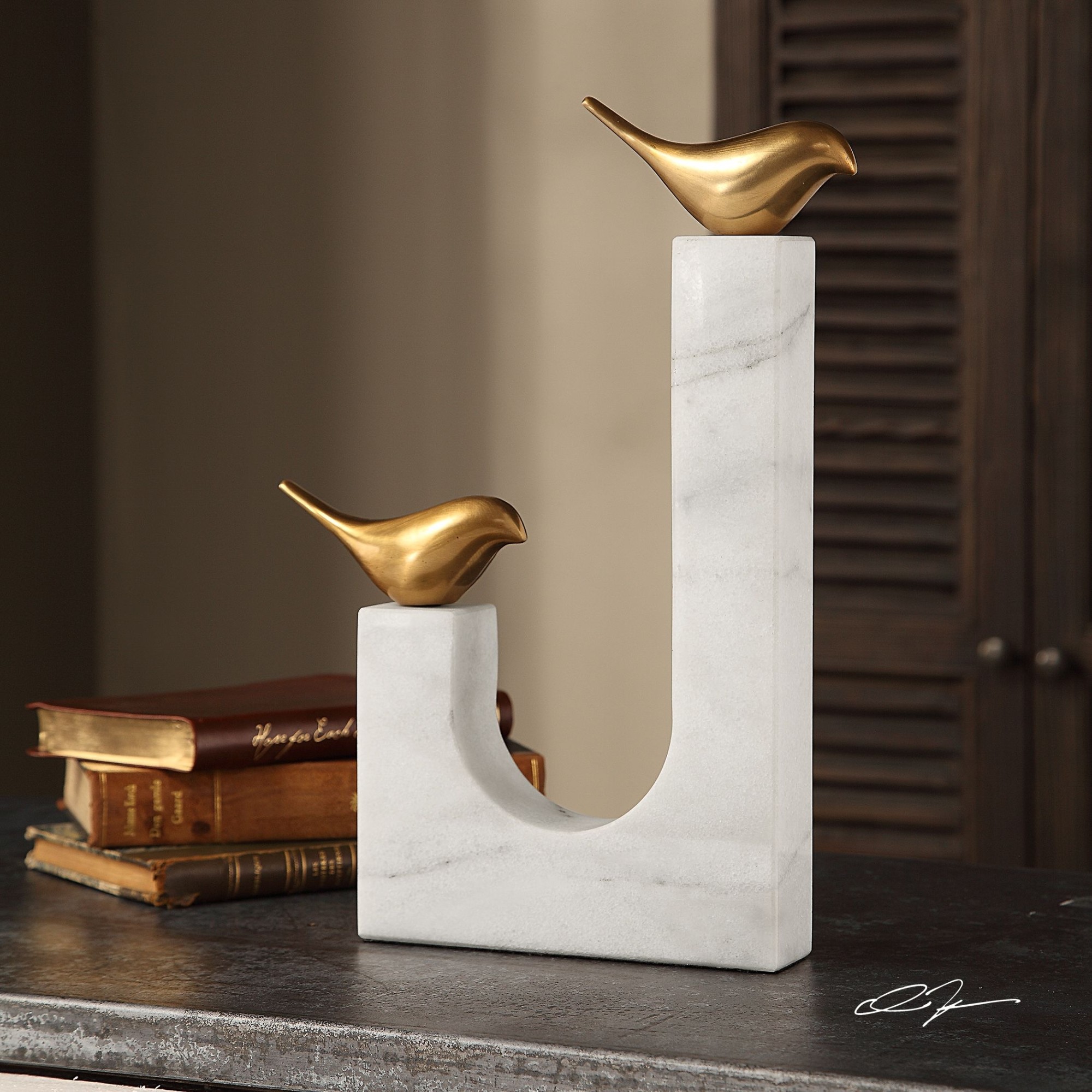 - Features two stylized songbirds counterpoised on a sling base