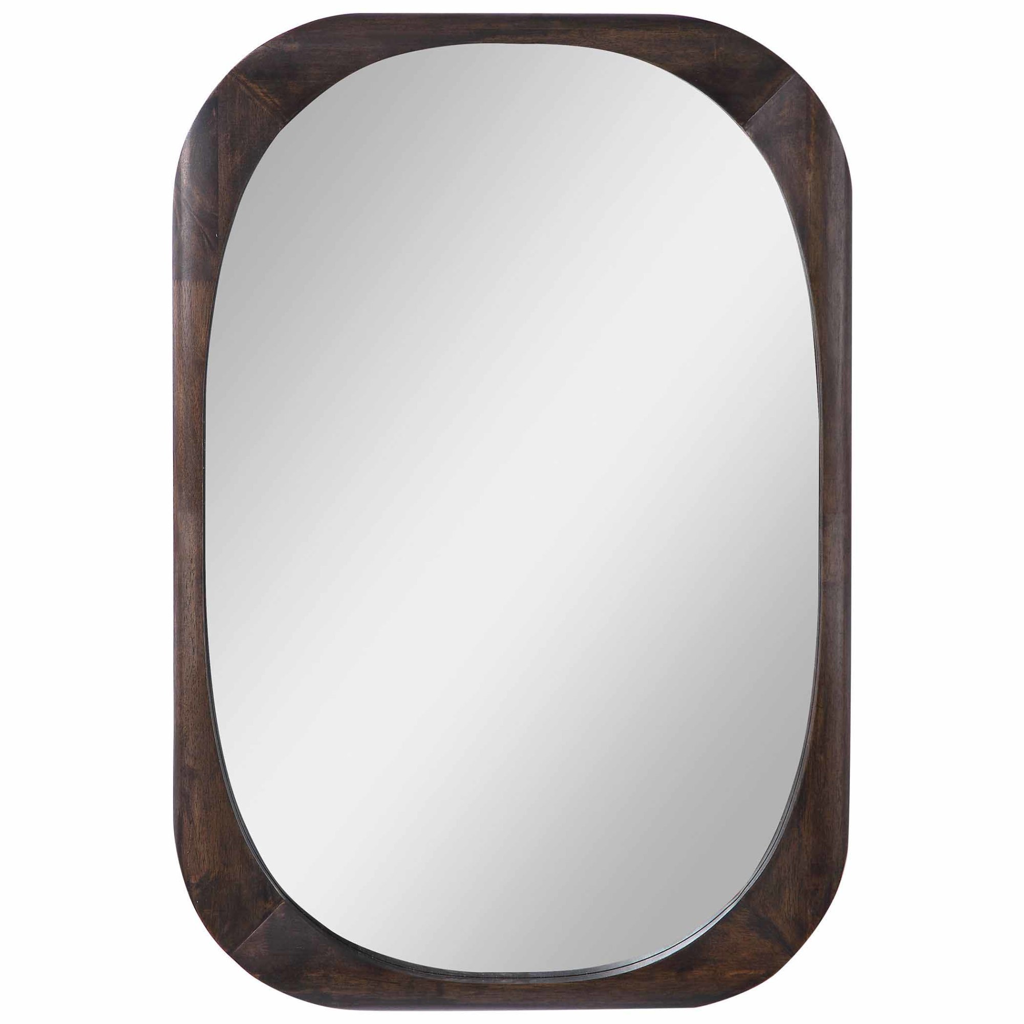Item DescriptionThis mirror evokes a mid-century style with its rounded edges and minimal, modern design. The solid wood frame is finished in a dark walnut stain. This mirror may be hung horizontal or vertical.