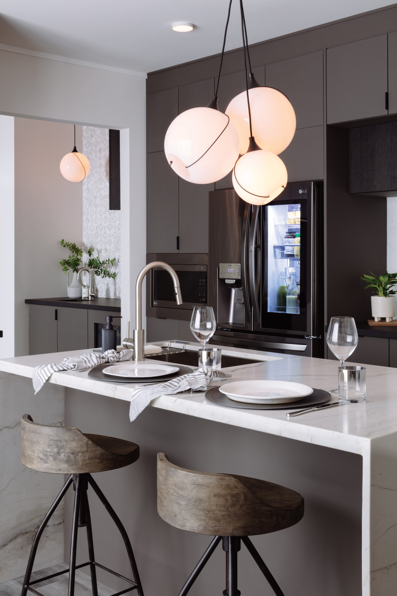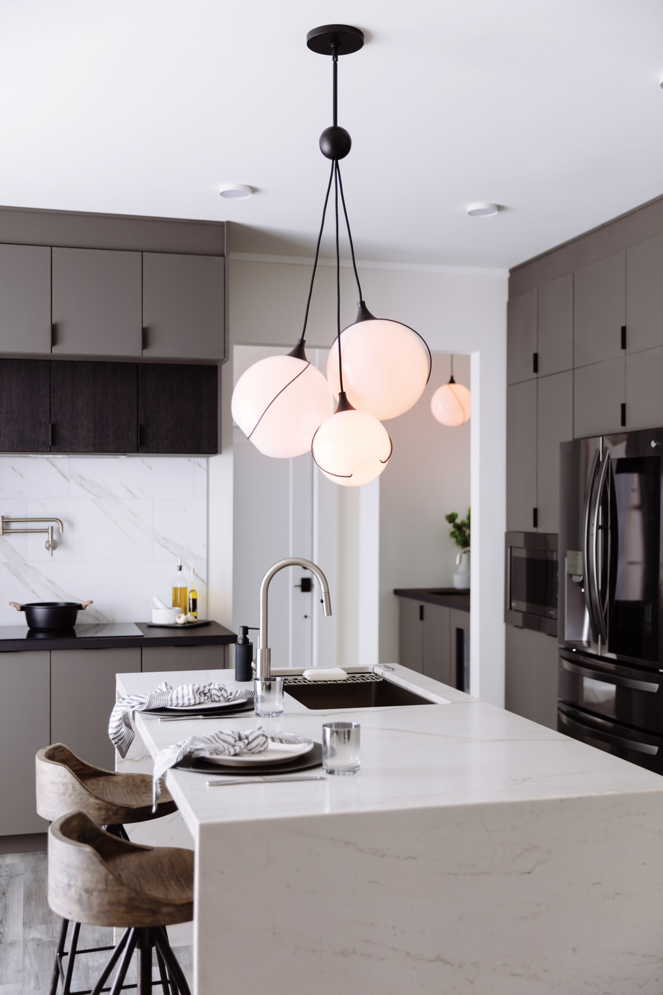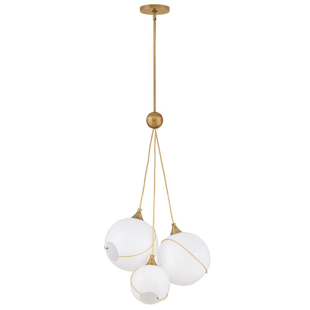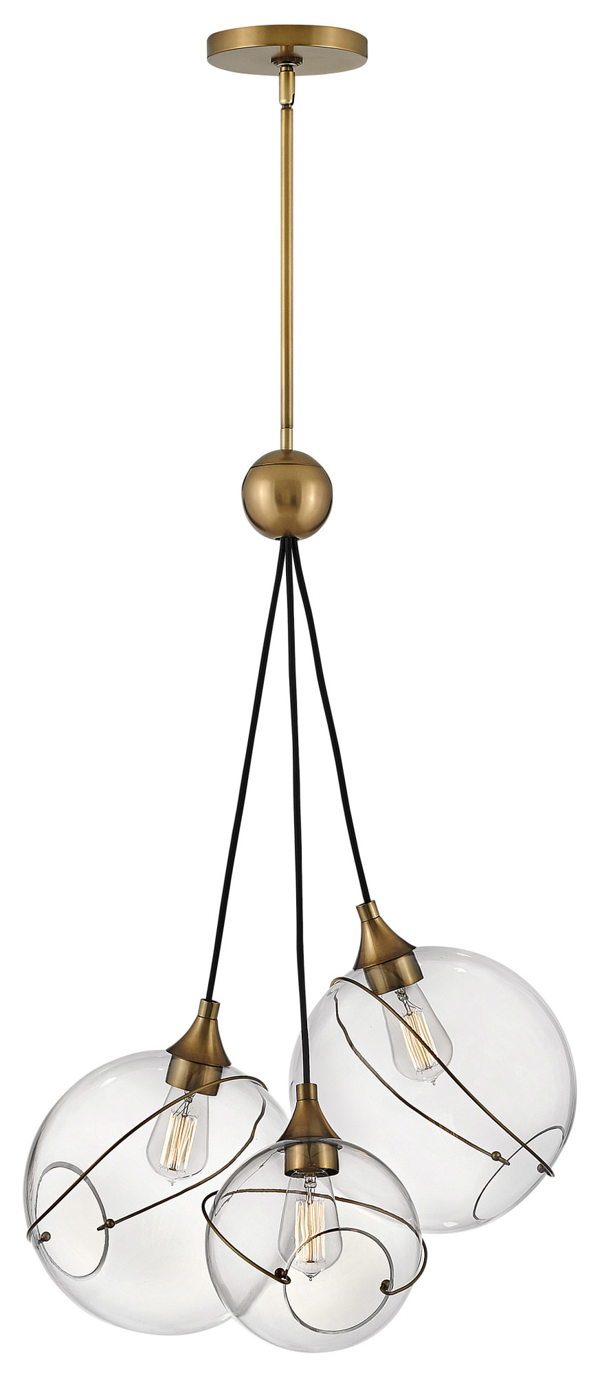 Mesmerizingly asymmetrical with a mid-century modern flair, Skye showcases a cluster of clear, open globes, each encircled with a slender brass ring. Each opening is off center and the globes fall to different lengths, with a Heritage Brass details pulling the look together perfectly.