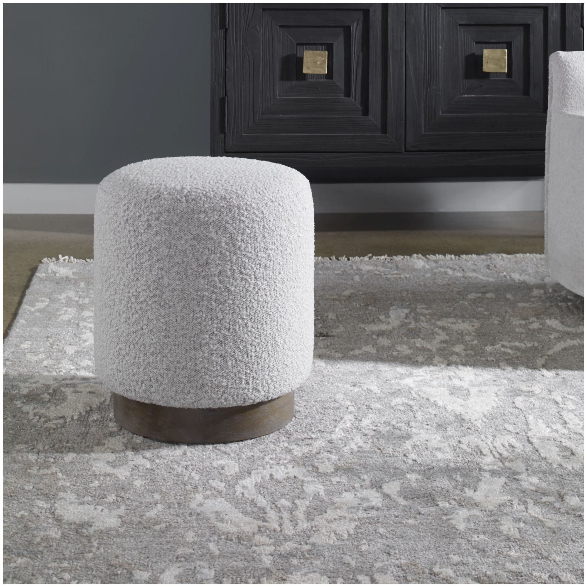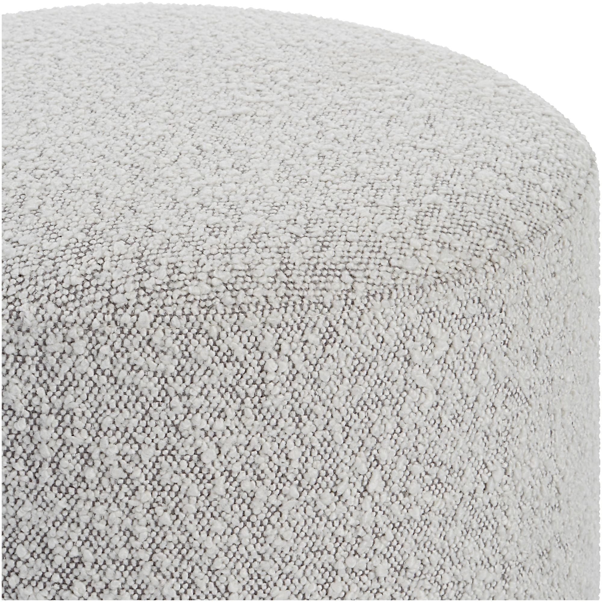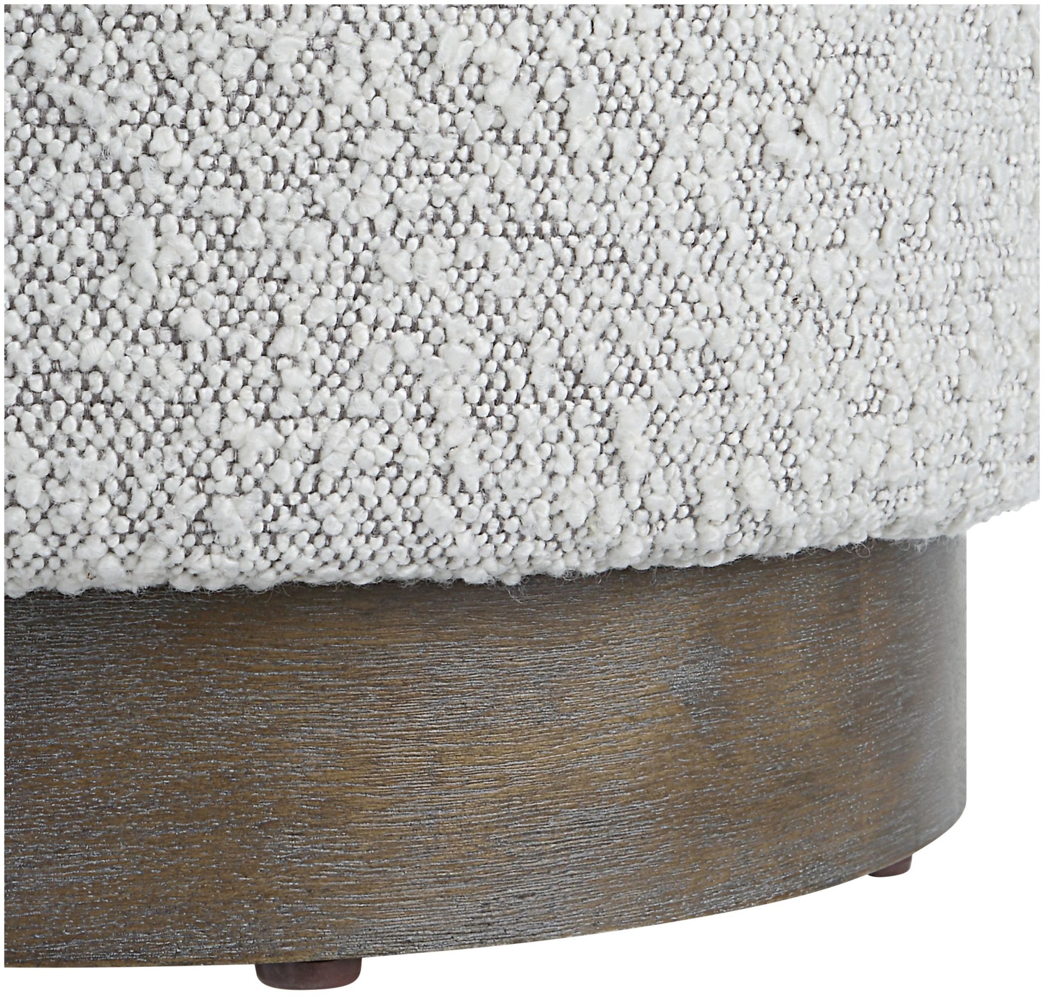 - This plush ottoman is covered in a casual ivory and warm gray boucle fabric with a natural walnut stained oak base