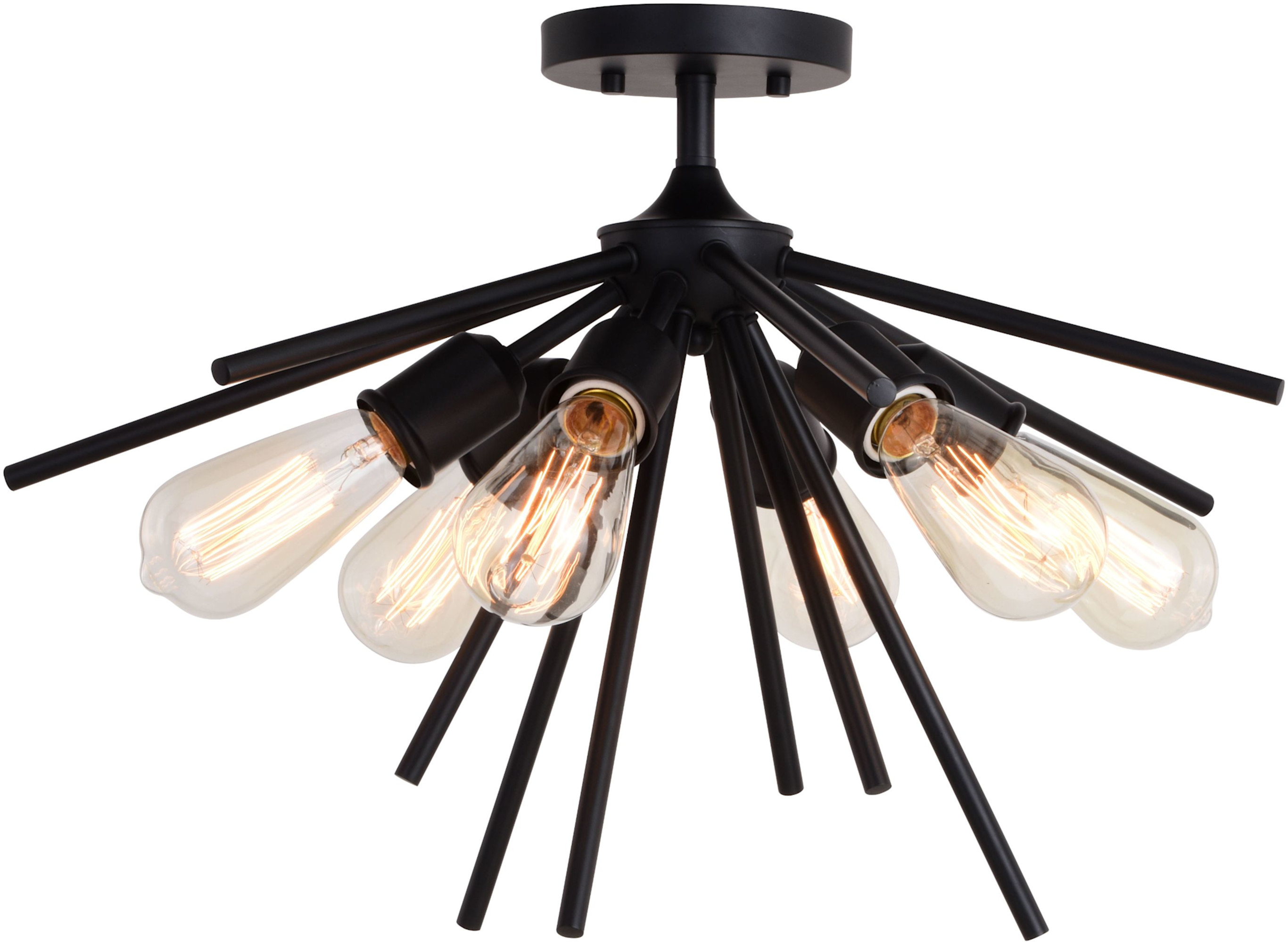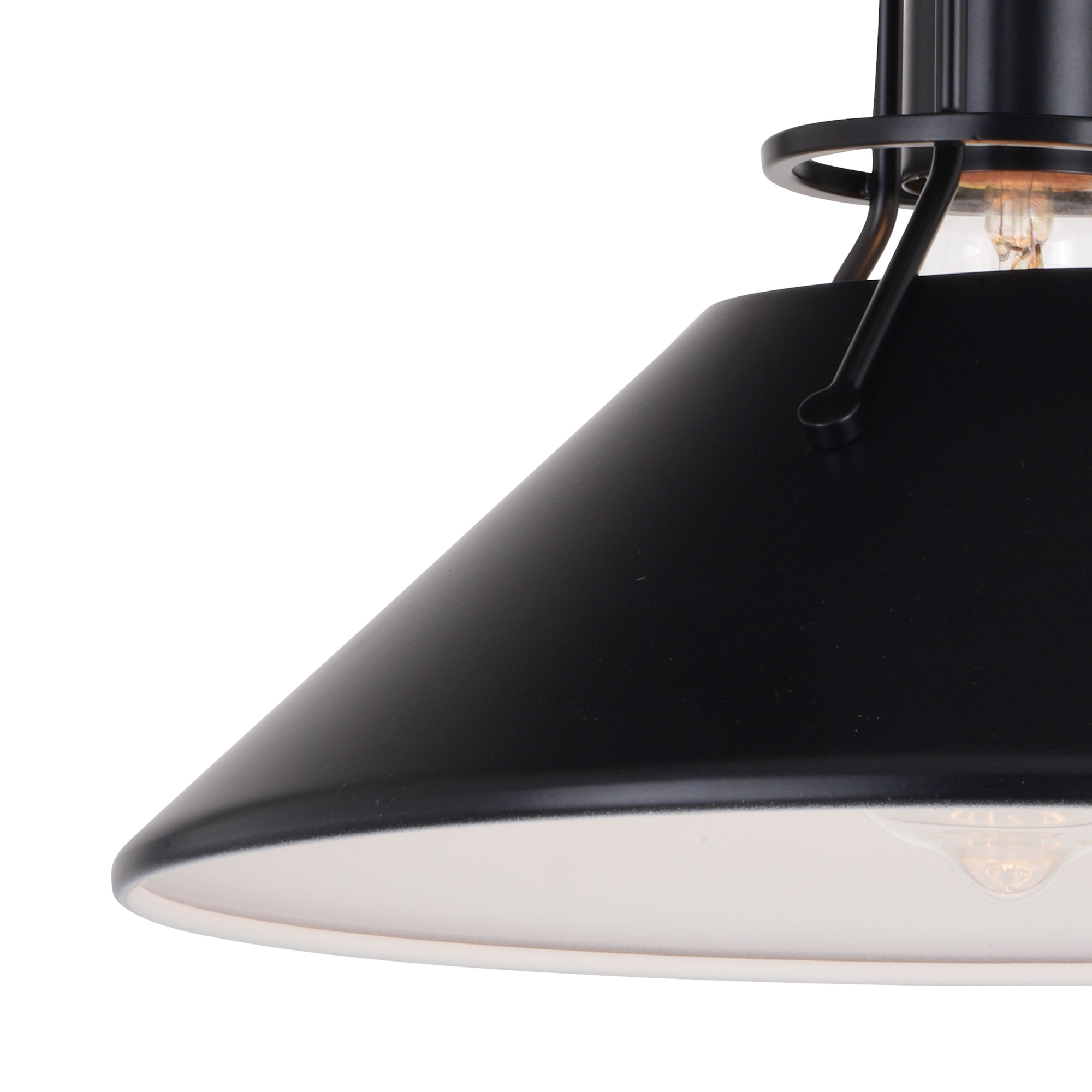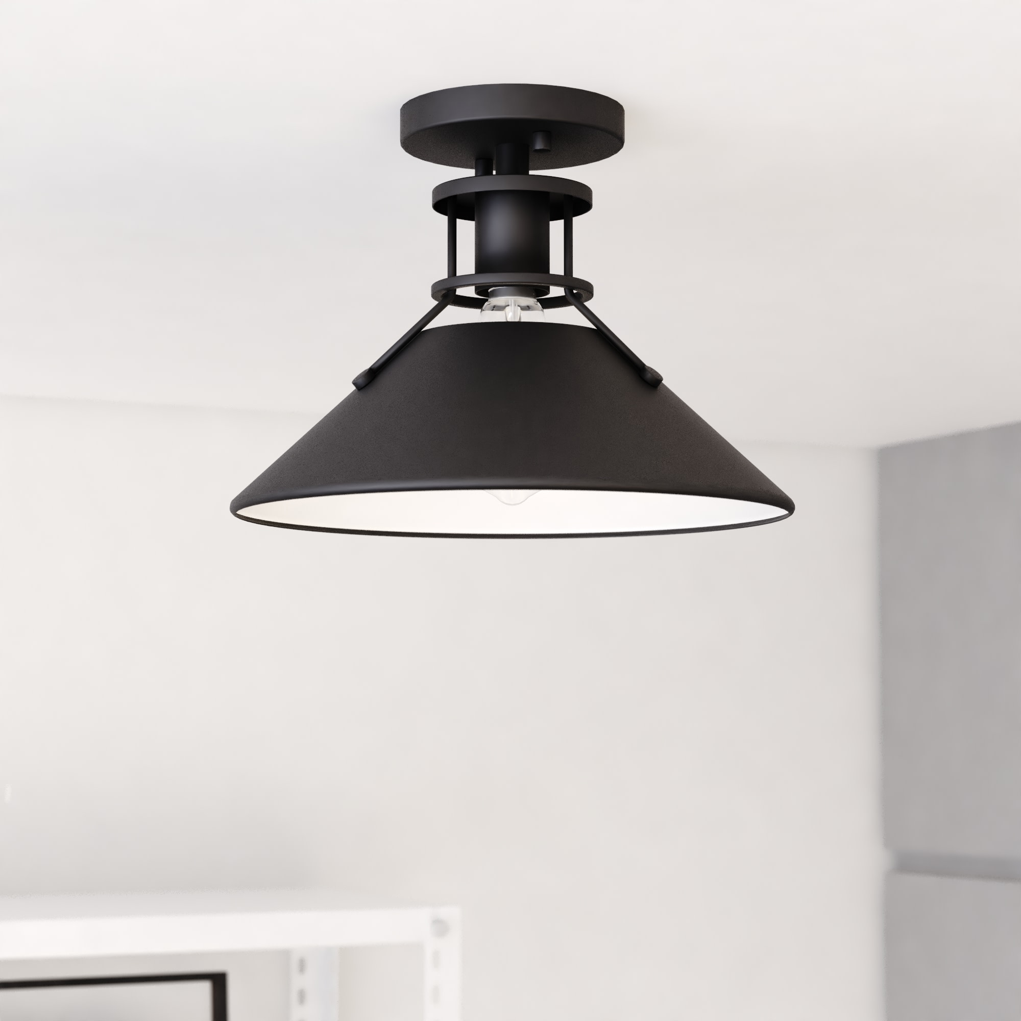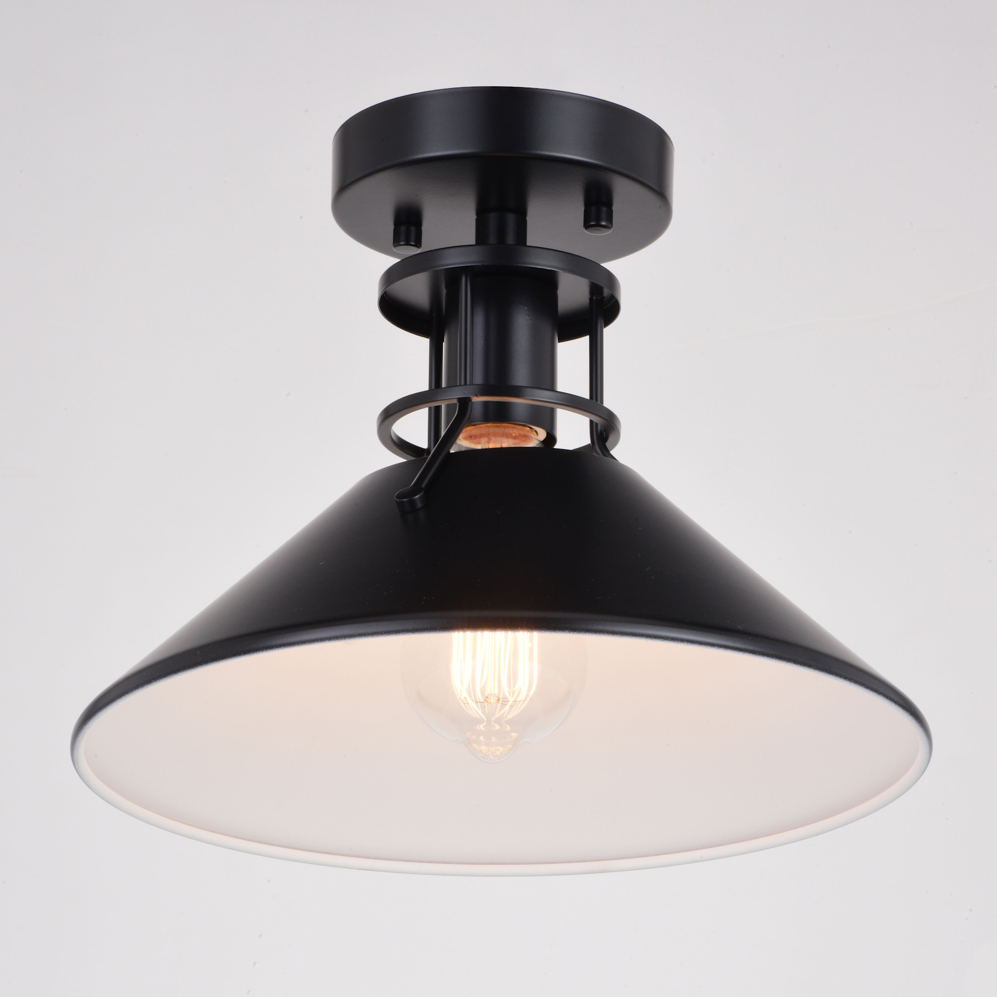 Item DescriptionThe Canton collection speaks loudly to industrial and farmhouse charm. The black metal shades taper outward to generate the utmost light below. A small cage-like structure allows light to peek out above the shade balancing the show of light. Add this interesting semi-flush to any kitchen or living space for that edgy touch of flair. With its damp rating, you can even add to any bath for that extra stylish touch.