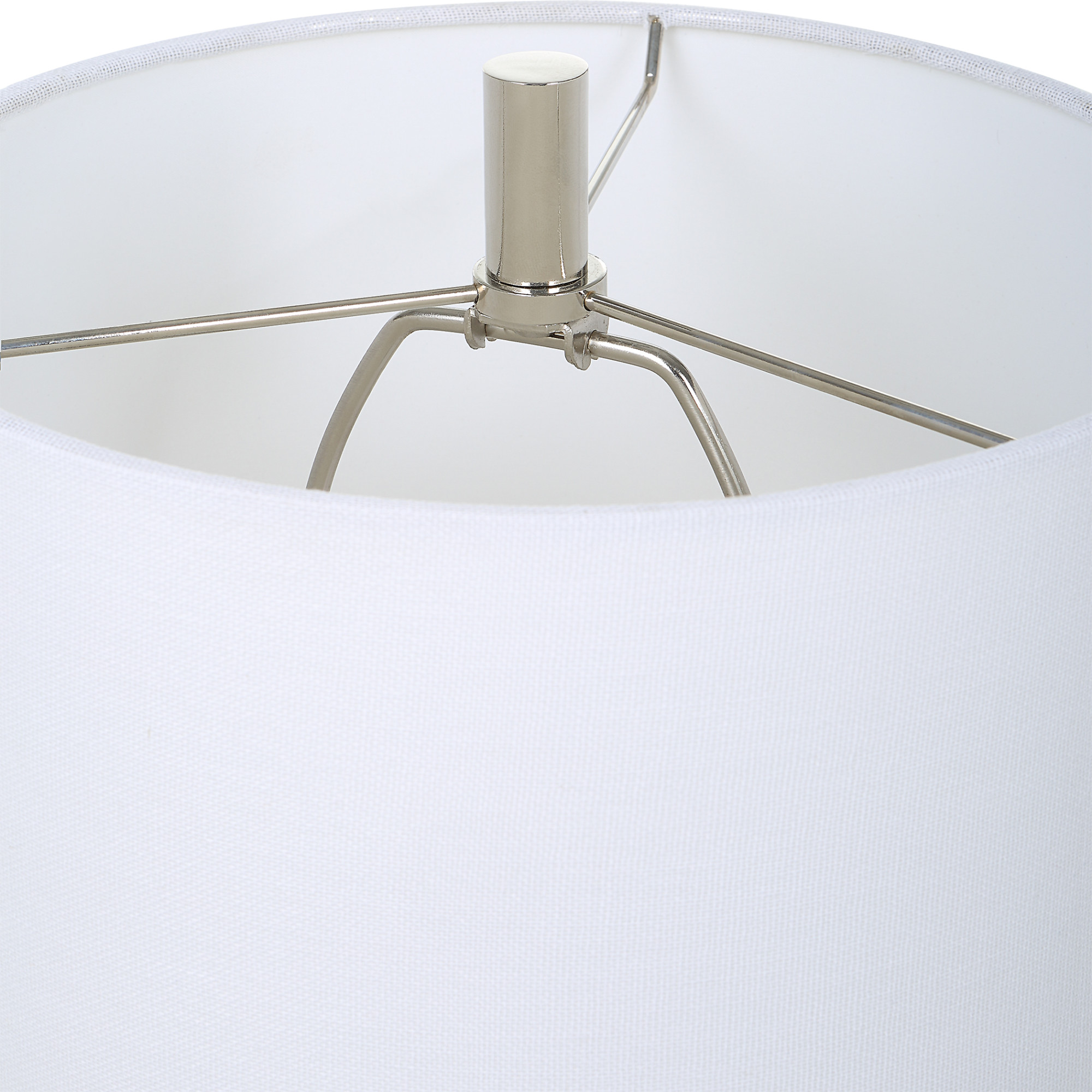 Item DescriptionSleek and refined, this contemporary buffet lamp showcases a streamlined iron base in polished nickel with natural white marble and crystal accents. Paired with a hardback white linen fabric drum shade.