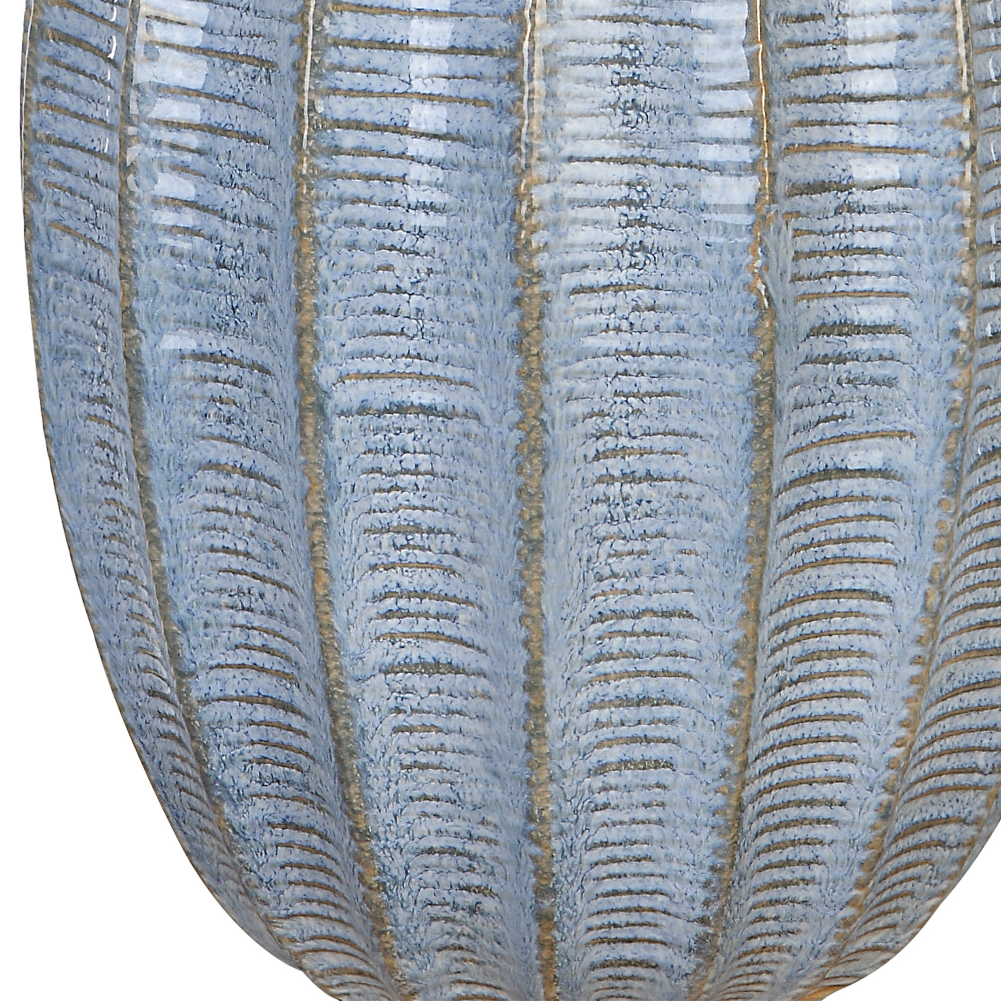 Item DescriptionInspired by old world pottery, this ceramic table lamp features scalloped channels with organic striped texture, finished in a light cornflower blue glaze with aged distressing. Steel hardware is finished in plated antique brushed brass. The slightly tapered hardback shade is covered in a white linen fabric.