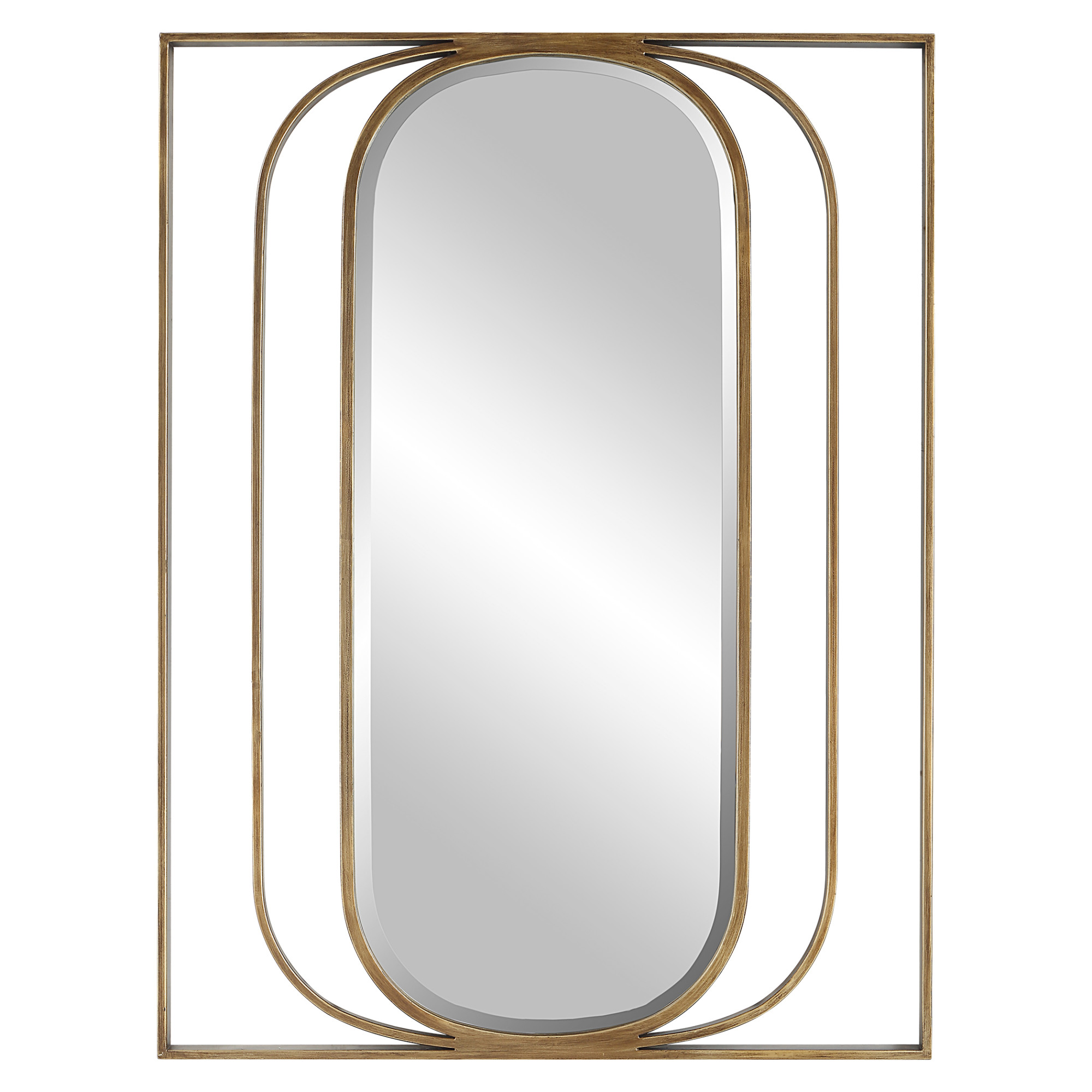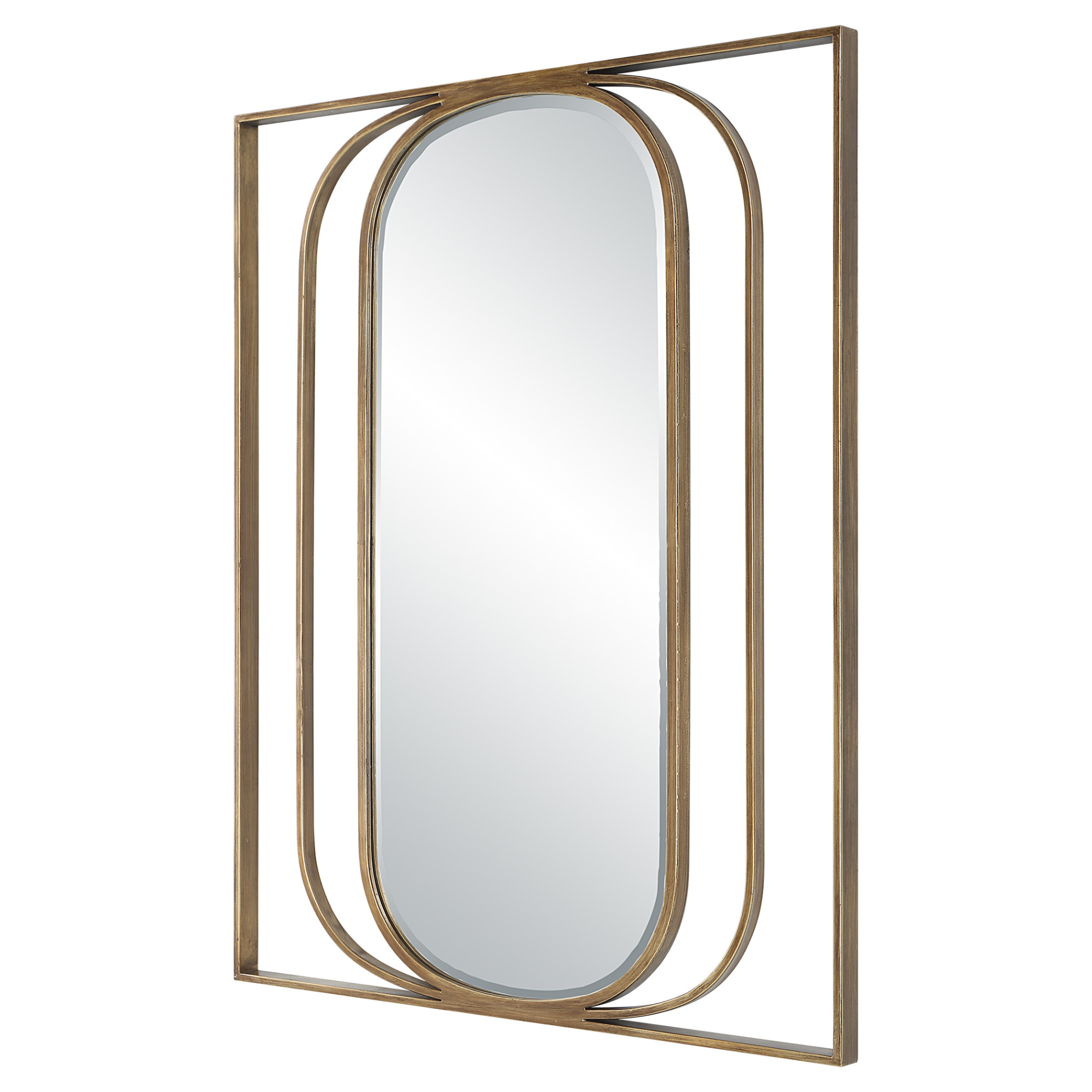 Item DescriptionContemporary style mirror displays a beveled oval interior with an angular metal framework finished in a heavily antiqued gold. May be hung horizontal or vertical.