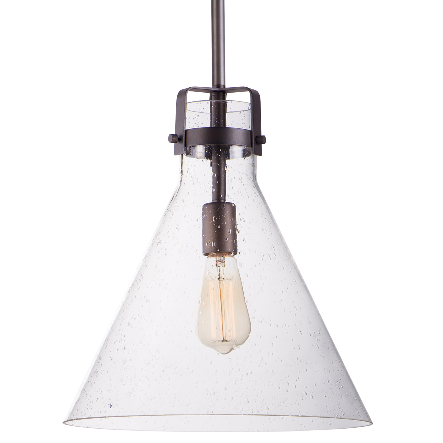 Item DescriptionThis nautical-inspired collection features Clear Seedy glass cones suspended by a yoke frame finished in Polished Chrome or Oil Rubbed Bronze. The clear glass offers abundant lighting and compliments the styling of the fixture. Make it a more industrial look by adding filament E26 light bulbs.