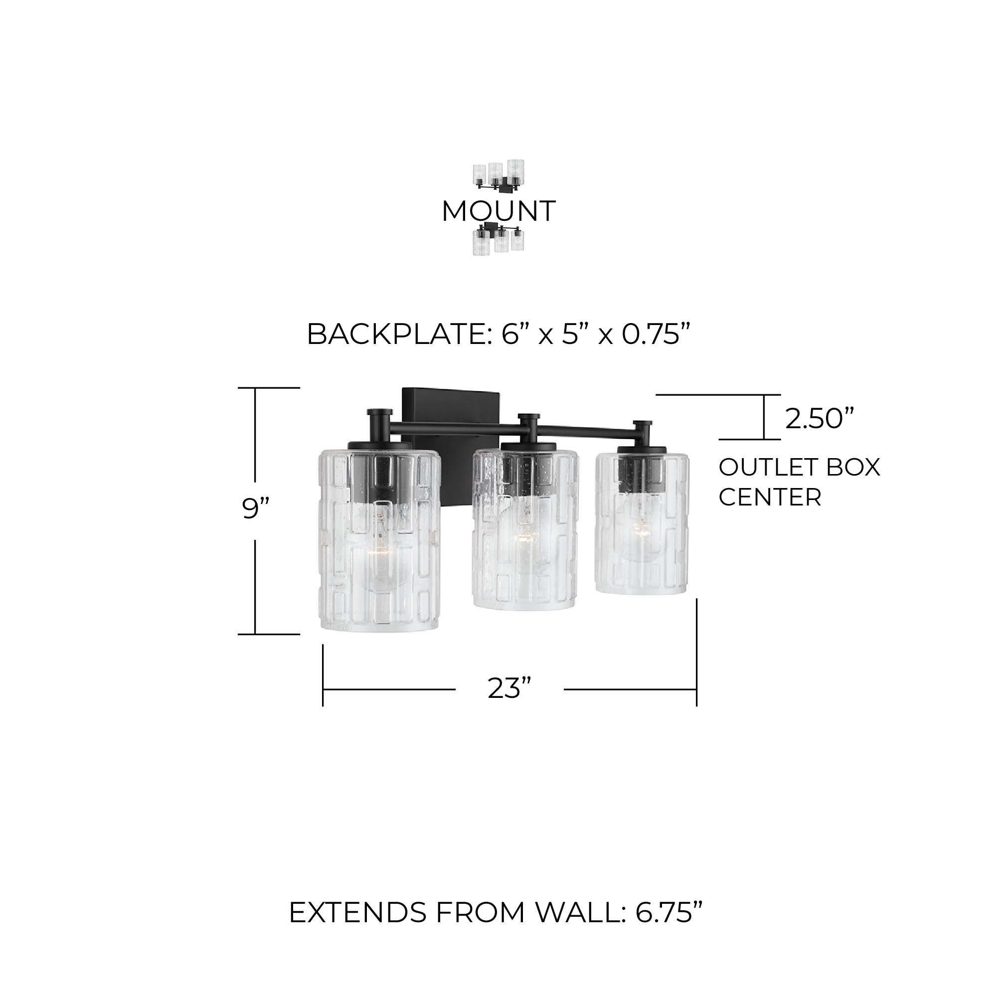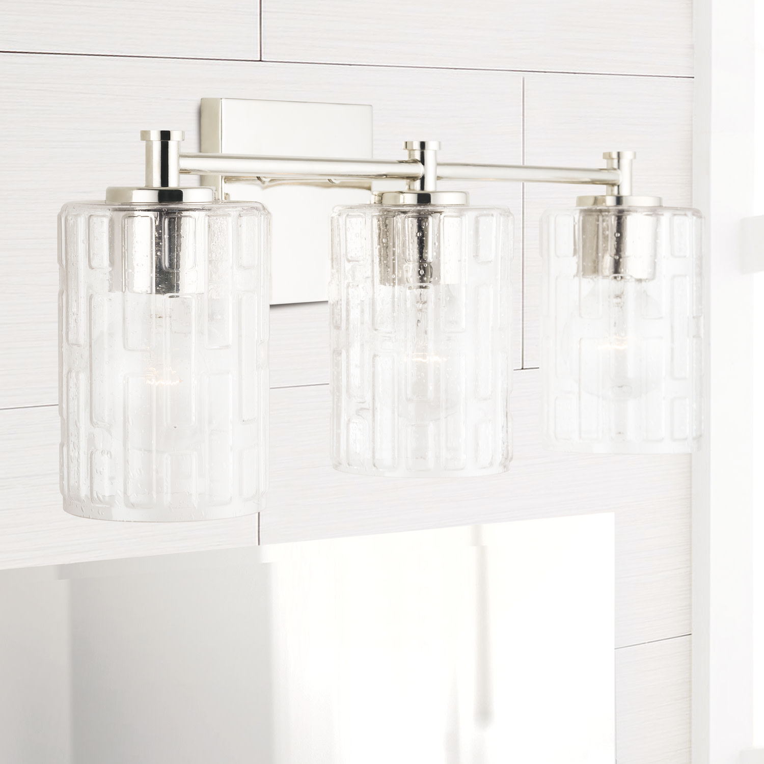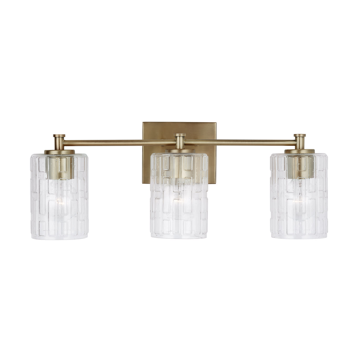 Item DescriptionSeeded glass with an embossed geometric pattern sparkles on the Emerson 3-Light Vanity. The clean and classic frame is available as a 2-light or 3-light.