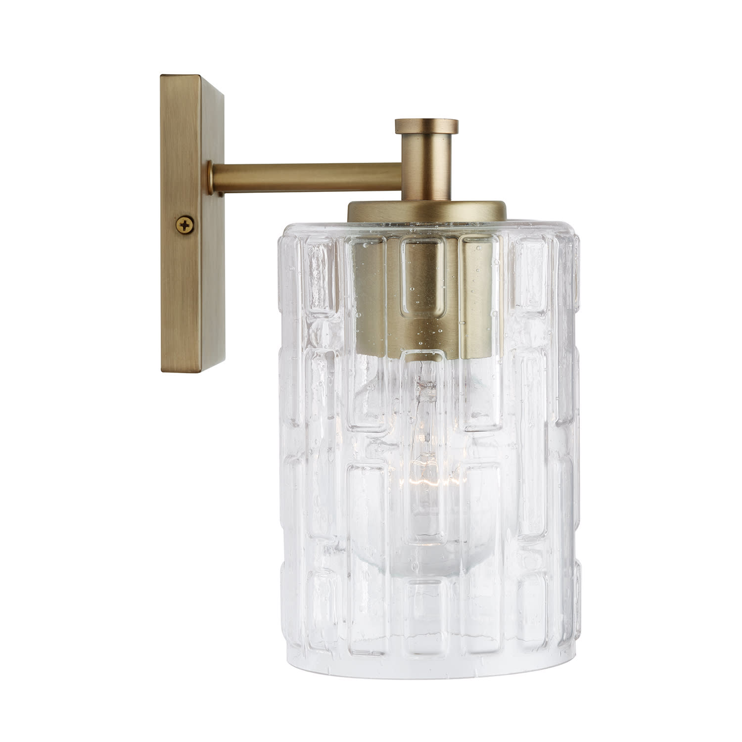 - Rated for damp locations, perfect for bathrooms and powder rooms. Unusual seeded geometric glass adorns this aged brass beauty.