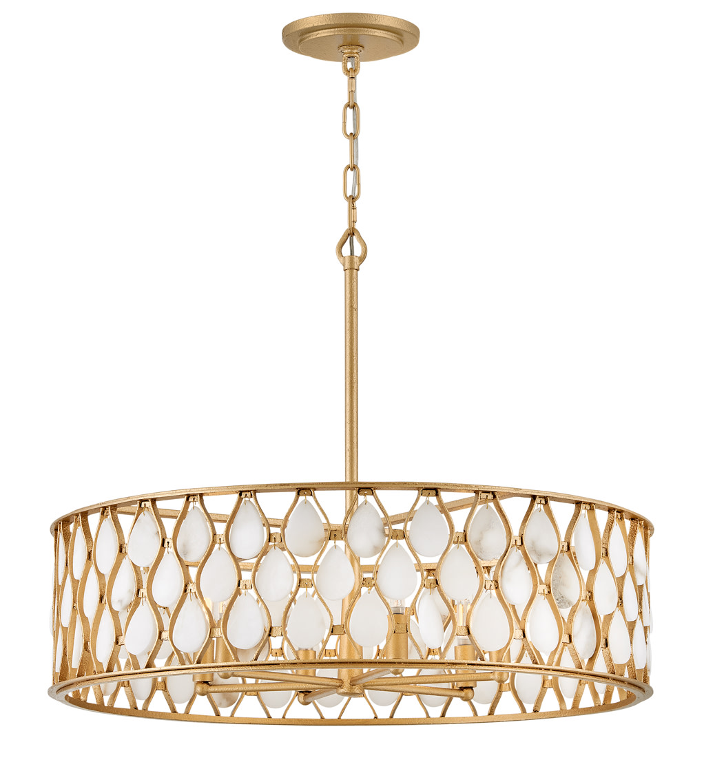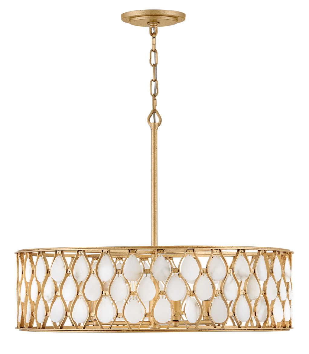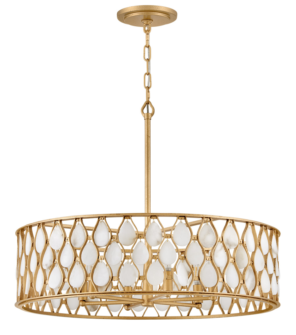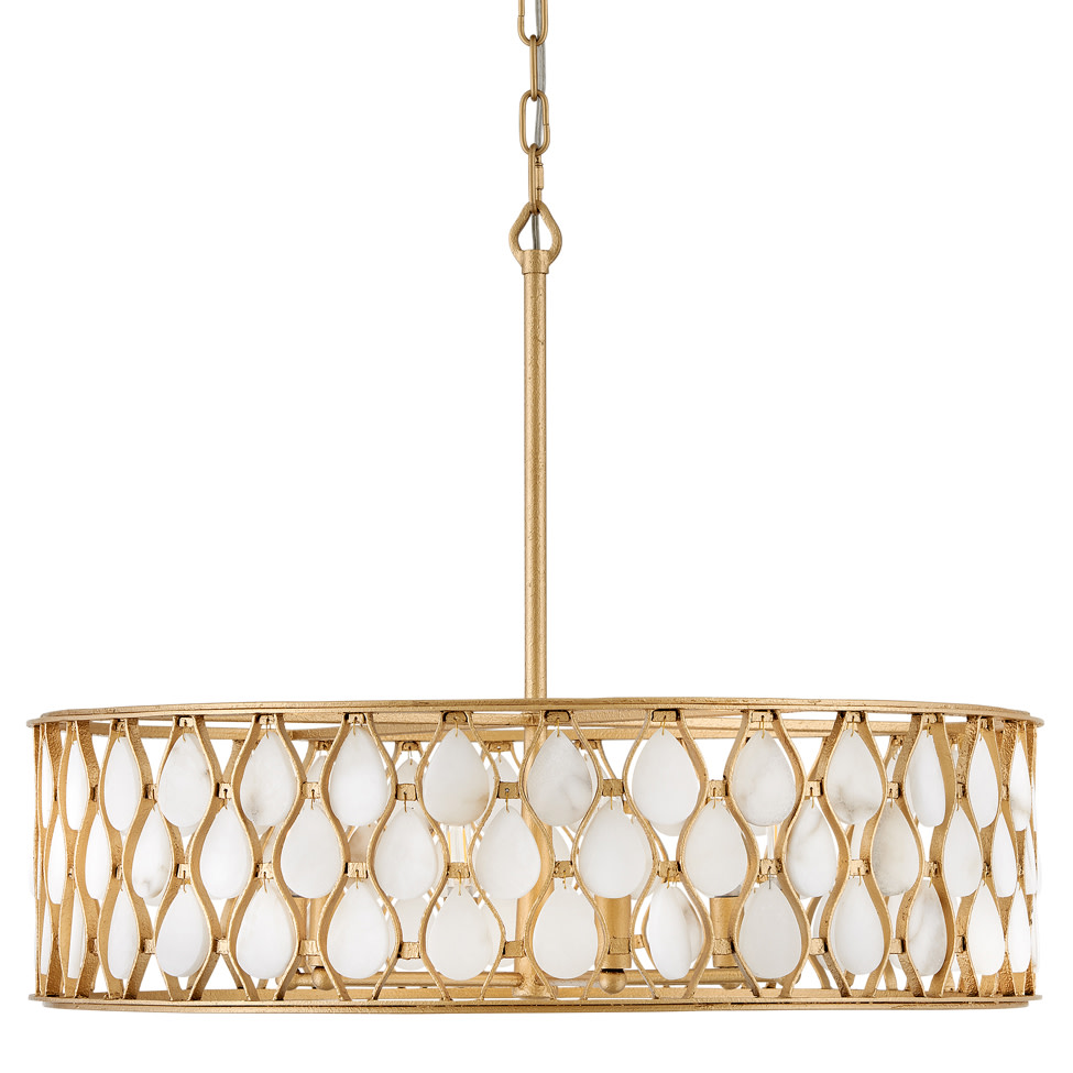 Item DescriptionOpulently adorned with natural alabaster stones held within a traditional latticework shade, Estie brings organic elegance to any aesthetic. Intricately curved metalwork complements the frame, chain, and canopy in a beautifully textured finish.
