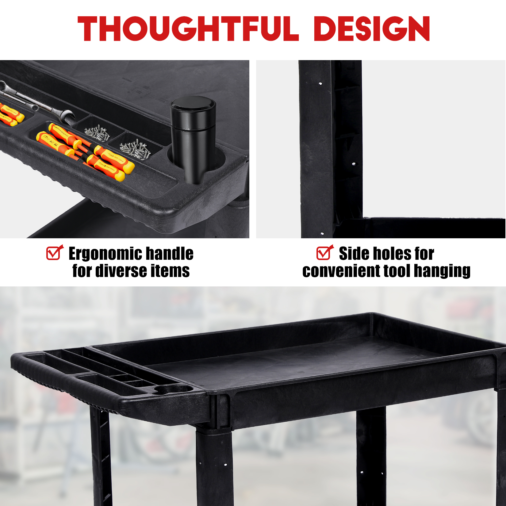 - ✅【Multiple Available Side Holes】 The added side round holes allow for flexible attachment of accessories and hooks for better organization and storage of clutter. Molded retrofit points on the beam enable you to install pipes or rods to secure reels and other rolled goods, enhancing the functionality of this cart with wheels.