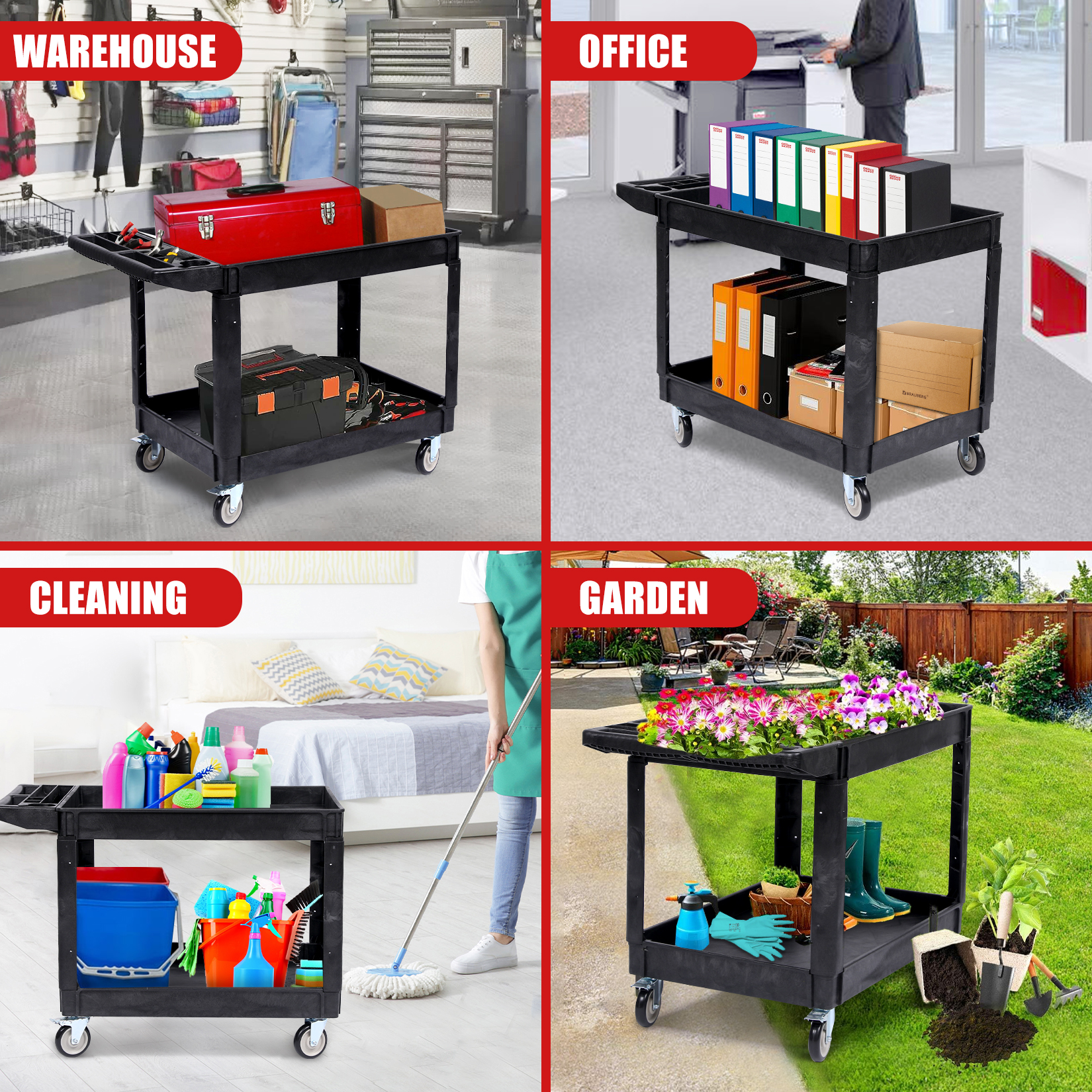 - ✅【Multi-Environment Versatility】 This heavy-duty cart is multifunctional and suitable for workshops, garages, factories, warehouses, offices, and outdoor environments. Its durable structure and multifunctional design make it suitable for various tasks, from transporting heavy equipment to storing household items, ensuring it meets your needs regardless of the environment.